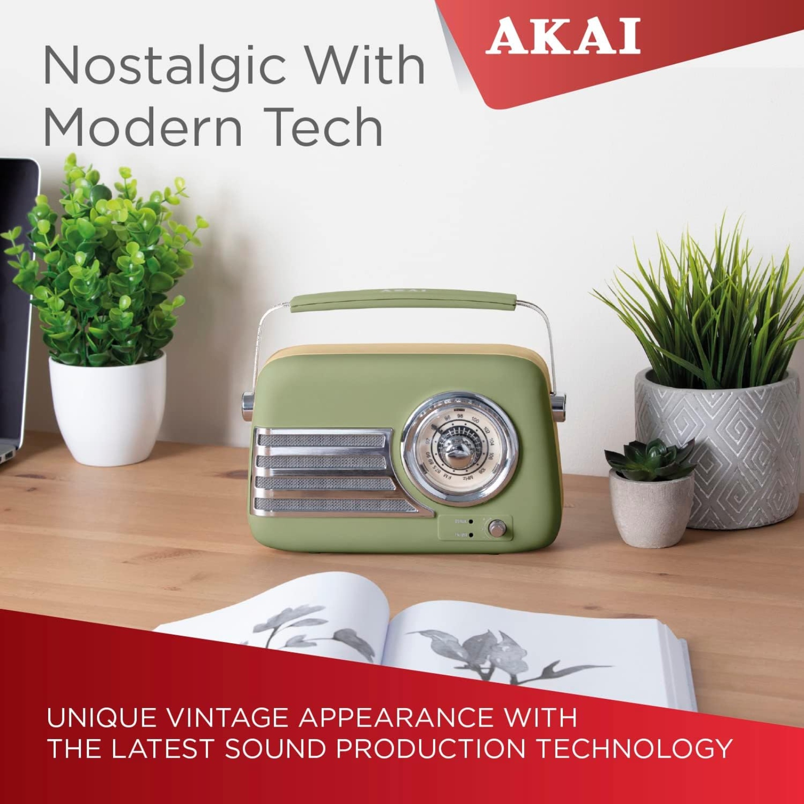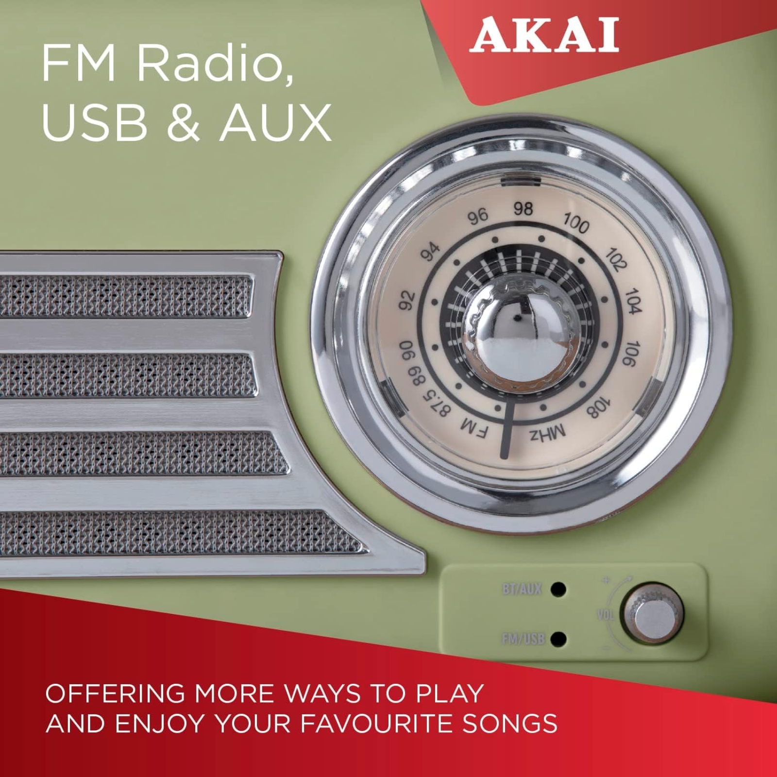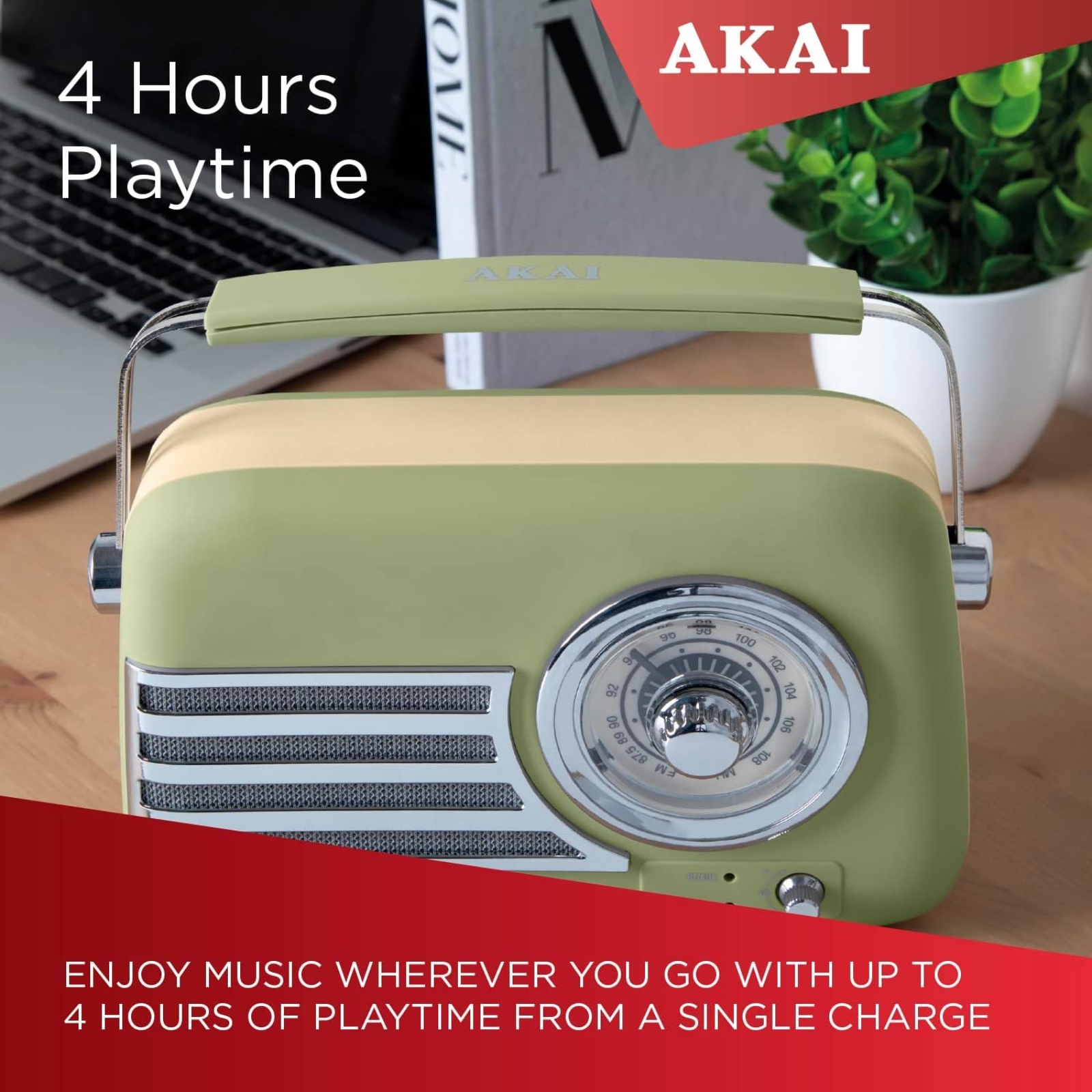 Experience the passion of the old days with sublime sound using Akai’s Vintage Bluetooth FM Radio. Finished in a statement Vintage Sage colour, the radio adds a quirky element to any home due to its nostalgic and vintage design with the latest sound production quality. The stylish radio does not compromise on functionality, with a choice of playing modes of FM Radio, USB and AUX allowing you to listen to all your favourite radio stations, songs, podcasts and more. Use the radio as a speaker by simply connecting any Bluetooth enabled device, so you can play songs via Spotify or Apple music with a clear transmission distance of 10m. Featuring an impressive 5W output and 3W amplifier, you can experience loud and clear sound without any distortion, with a built-in lithium-ion battery for up to 4 hours of playtime. Its compact design makes it easy to store away and lightweight with carry handle for effortless portability.