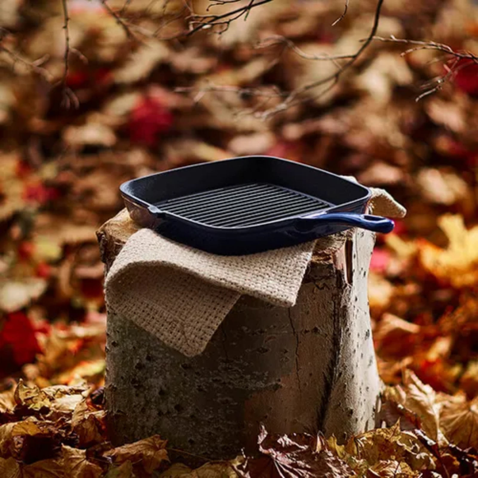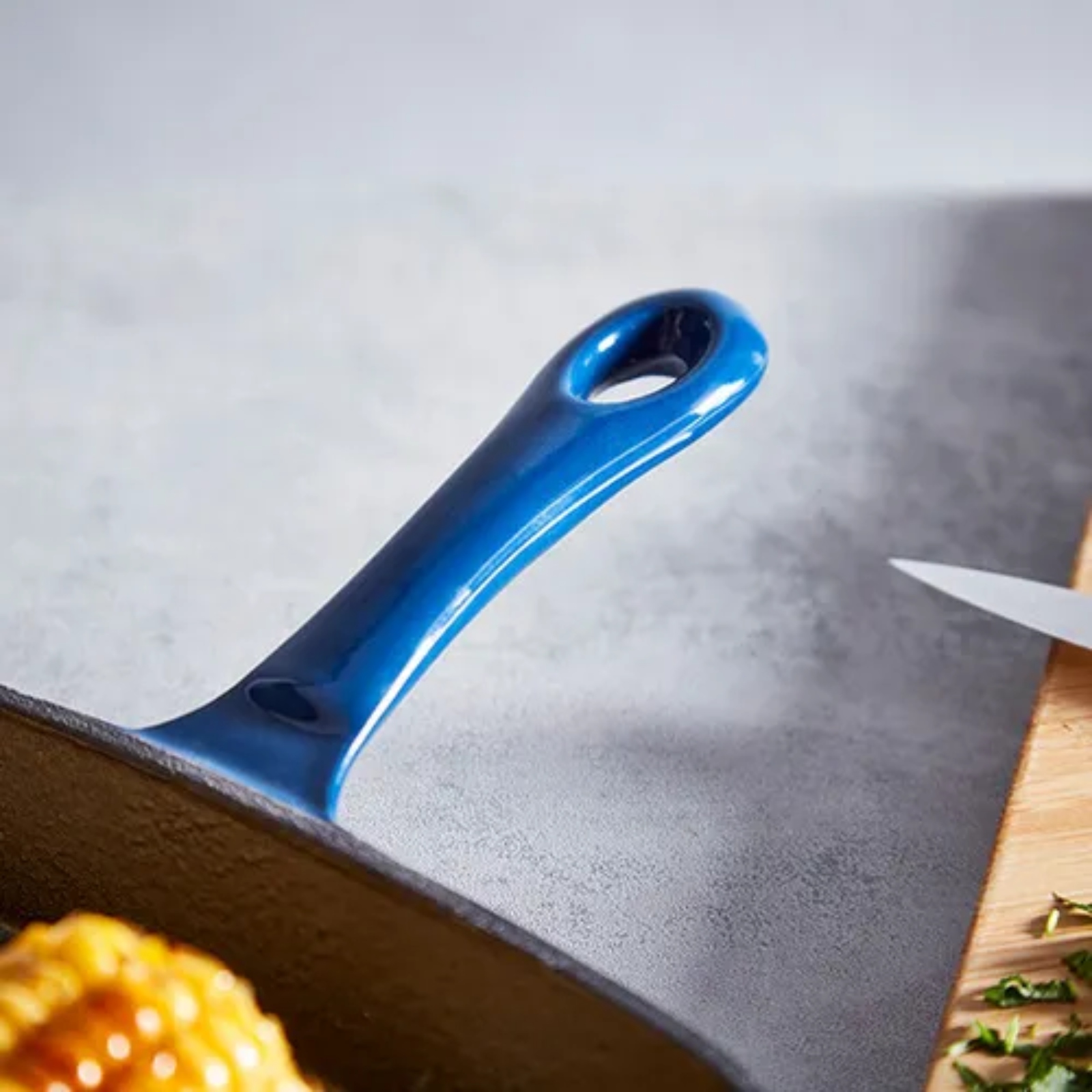 The Barbary & Oak 23cm blue round grill pan is made from durable cast iron which keeps the content hotter for longer and promotes even cooking and browning. The enamel interior of the grill pan prevents food from sticking when serving and allows the pan to be hand washed easily maintaining the longevity of the cooking surface. The pan also features a side spout for simple drip free pouring. The easy grip handle provides a firm and comfortable grip for handling. Suitable for all hob types including induction, the 23cm round grill pan can also be used under the grill for browning and grilling and can be placed in the oven to temperatures up to 260°C. The 23cm cast iron grill pan is perfect for handwashing, this will help to maintain the longevity of the cooking surface.