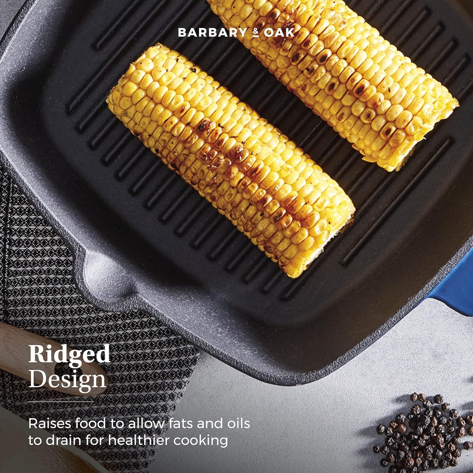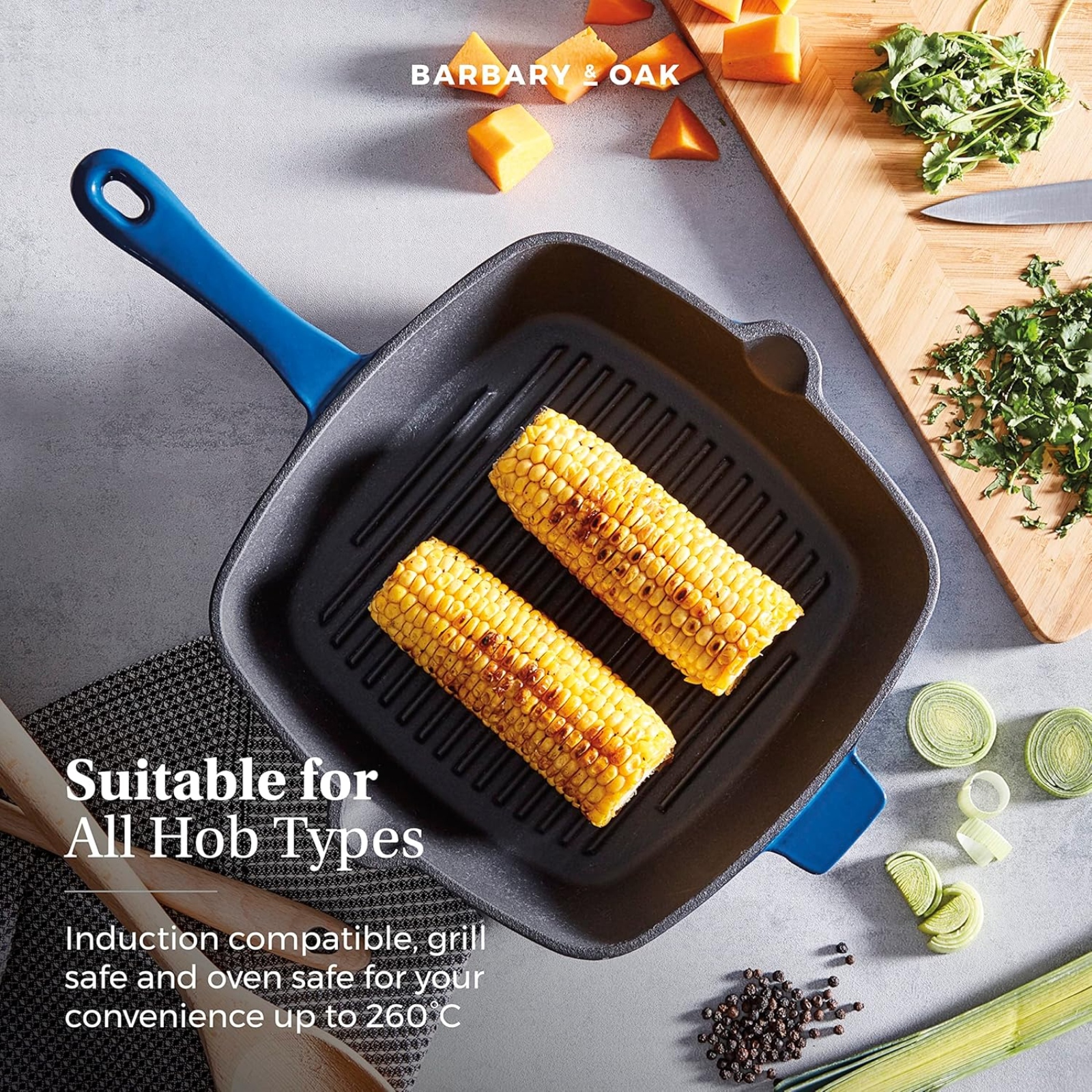 This Barbary & Oak 26cm Grill Pan is durable and built to last, a reliable companion for any avid cook. Cast iron retains heat, keeping food warmer for longer, perfect for making delicious family meals. The enamel interior prevents food sticking, is easy to clean, and will not absorb flavours. The versatile design is suitable for all hob types including induction, oven safe up to 260°C. The ridged surface keeps food elevated, allowing fats and oils to drain for healthier cooking results.