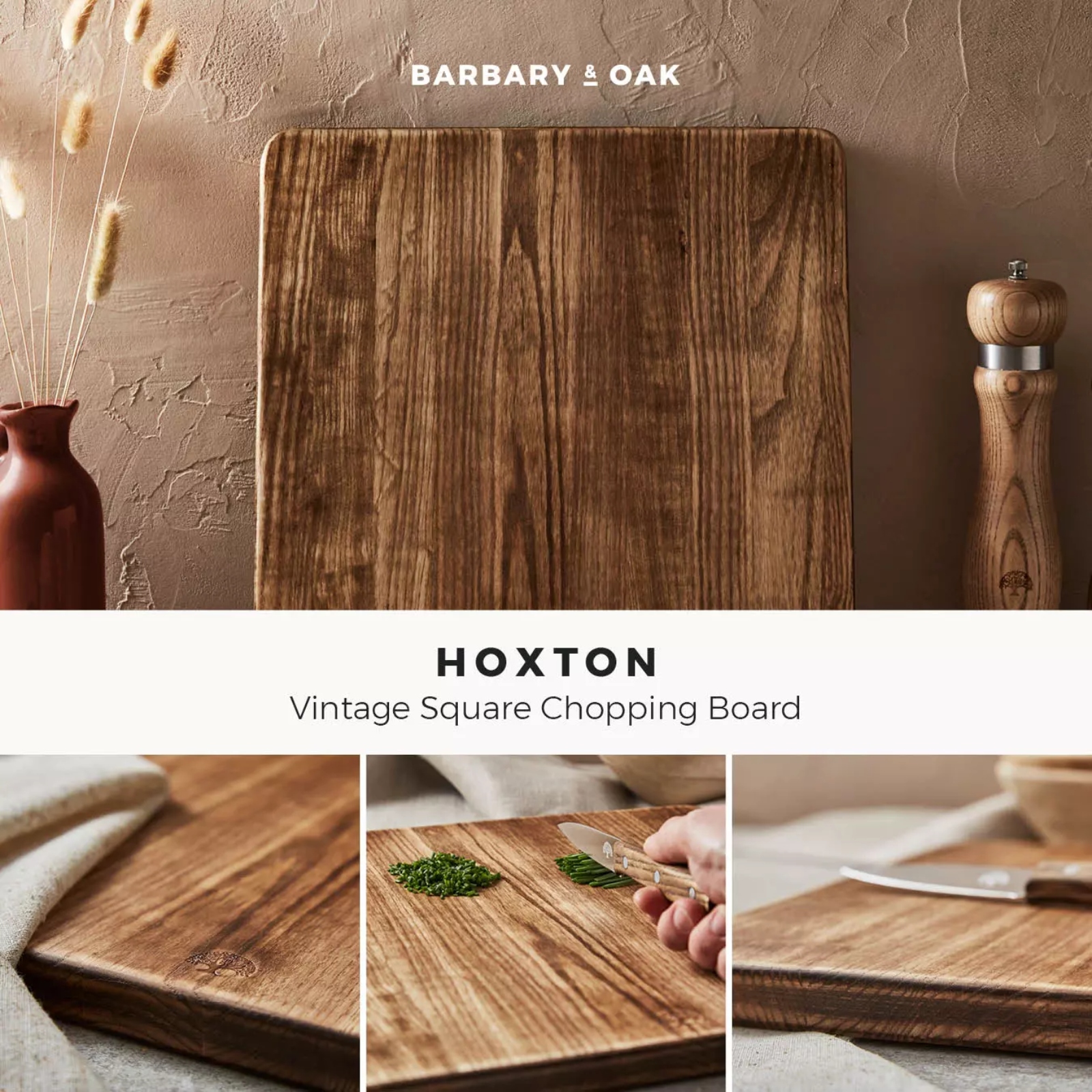 This vintage square chopping board from the Hoxton collection, Barbary & Oak adds a rustic and timeless classic to any styled kitchen. Prepare a range of ingredients from meat, fish, fruits and vegetables, while its vintage charm makes for a stylish serving board for entertaining dinner guests. The strong and durable ash wood construction is treated with a natural coating, prolonging its lifespan. Use the chopping board to protect kitchen worktops from damage and scratching. The rounded edges and natural grain offers a rustic addition to kitchens, while easy to clean requiring a simple wipe with a damp cloth.