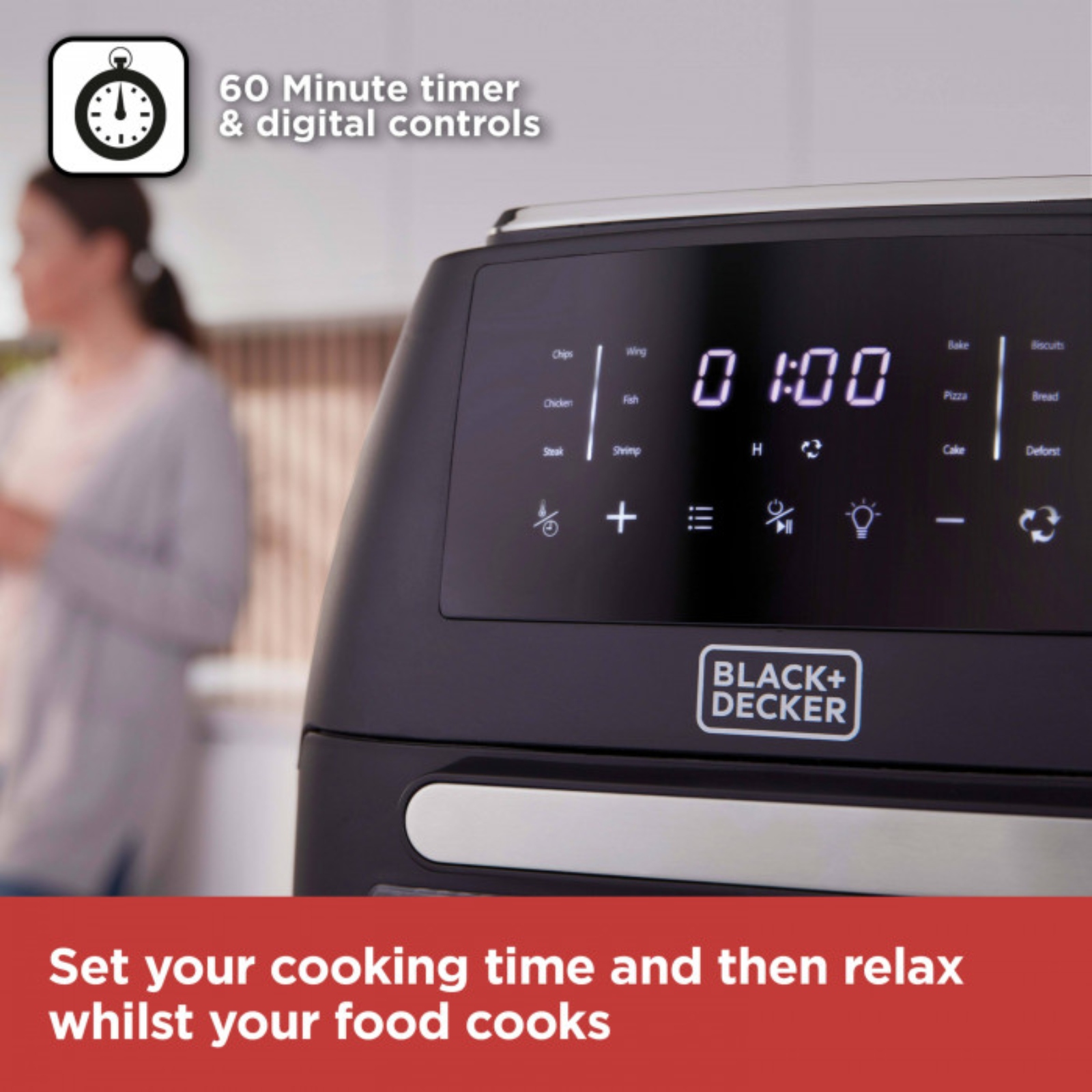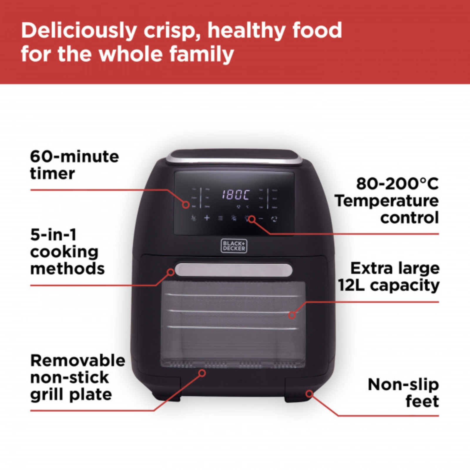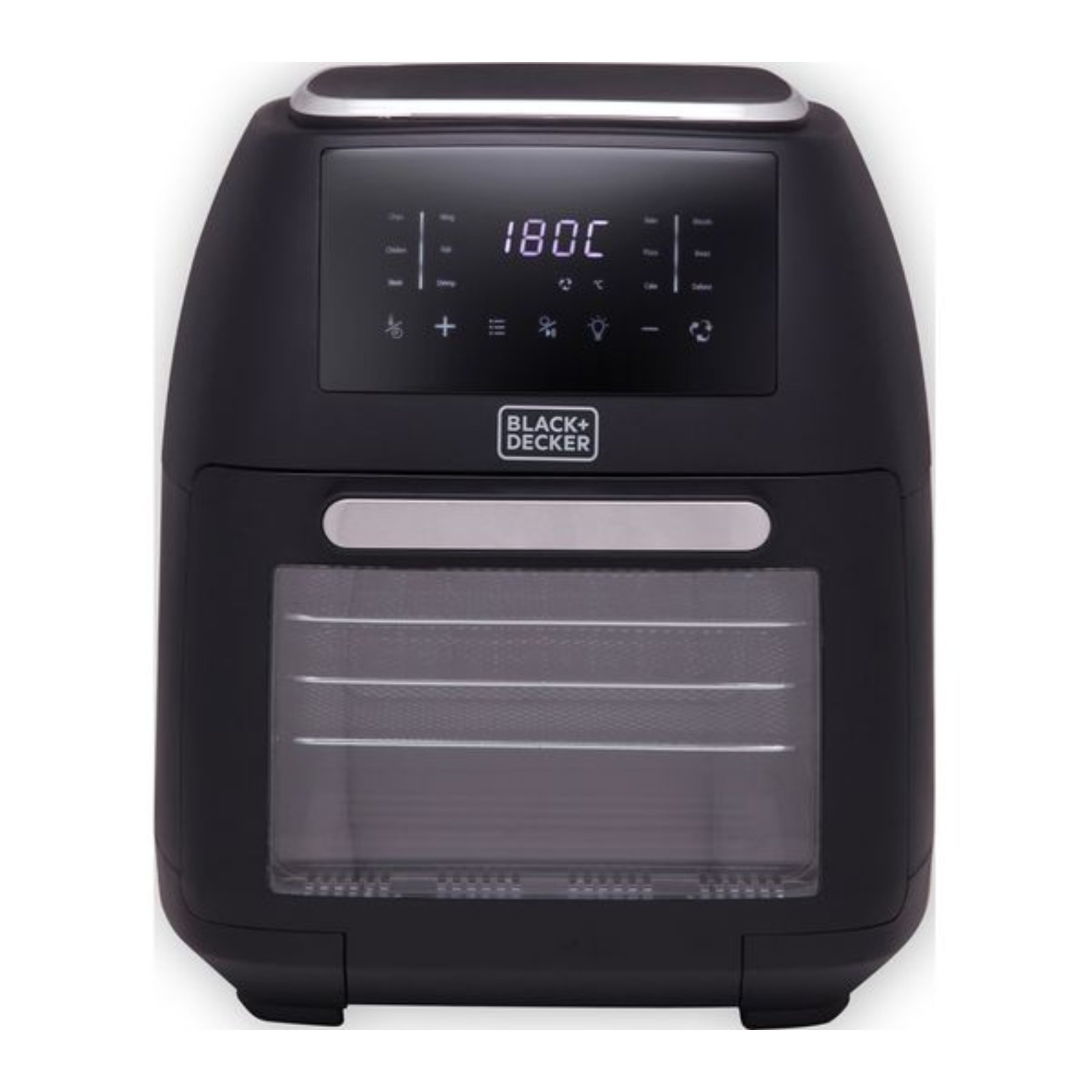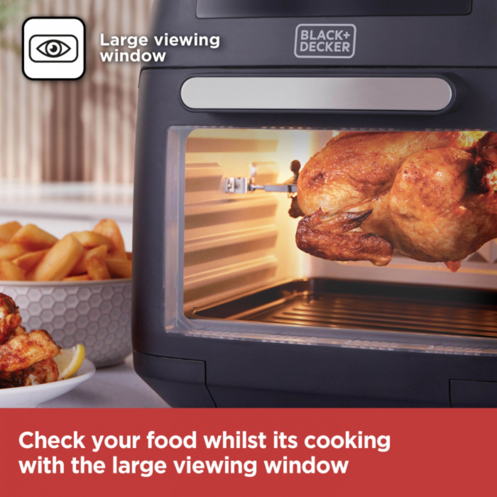 Fry, roast and bake delicious crispy chicken, golden chips and succulent meat for the whole family with BLACK+DECKER’s 12L Digital Air Fryer Oven. Less than one teaspoon of oil is required, all while keeping the same great taste, so you lose the fat not the flavour. The rotisserie function will let you cook a whole roast chicken in an hour. The viewing window allows you to monitor cooking progress without opening the drawer, saving both time and energy. Choose from 80-200 temperatures to evenly cook a wide range of ingredients, for deliciously healthy results. Add more variety to your mealtimes with 8 pre-cooking pre-sets including chips, chicken drumsticks, roast chicken, fish, prawns, steak, kebabs and dehydrate. Set your cooking time and then relax whilst your food cooks, the air fryer will automatically switch off once the timer ends – for fast and efficient cooking results with minimal effort. A pull-out drawer and removable non-stick frying basket require a simple hand wash for a sparkling clean.