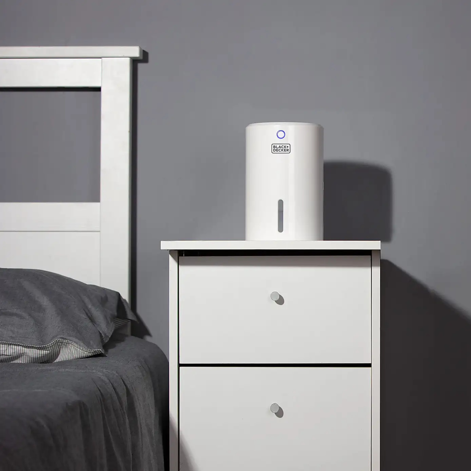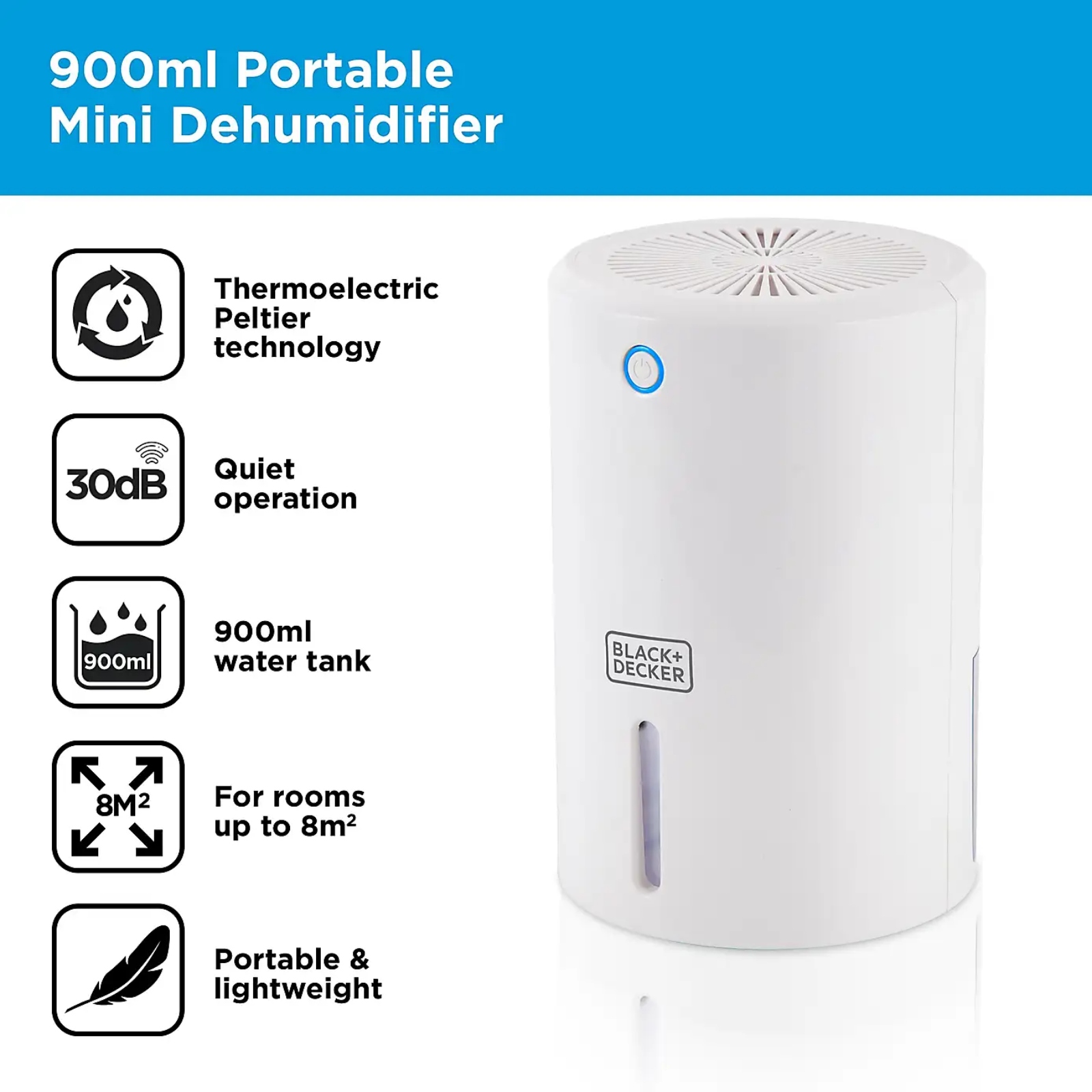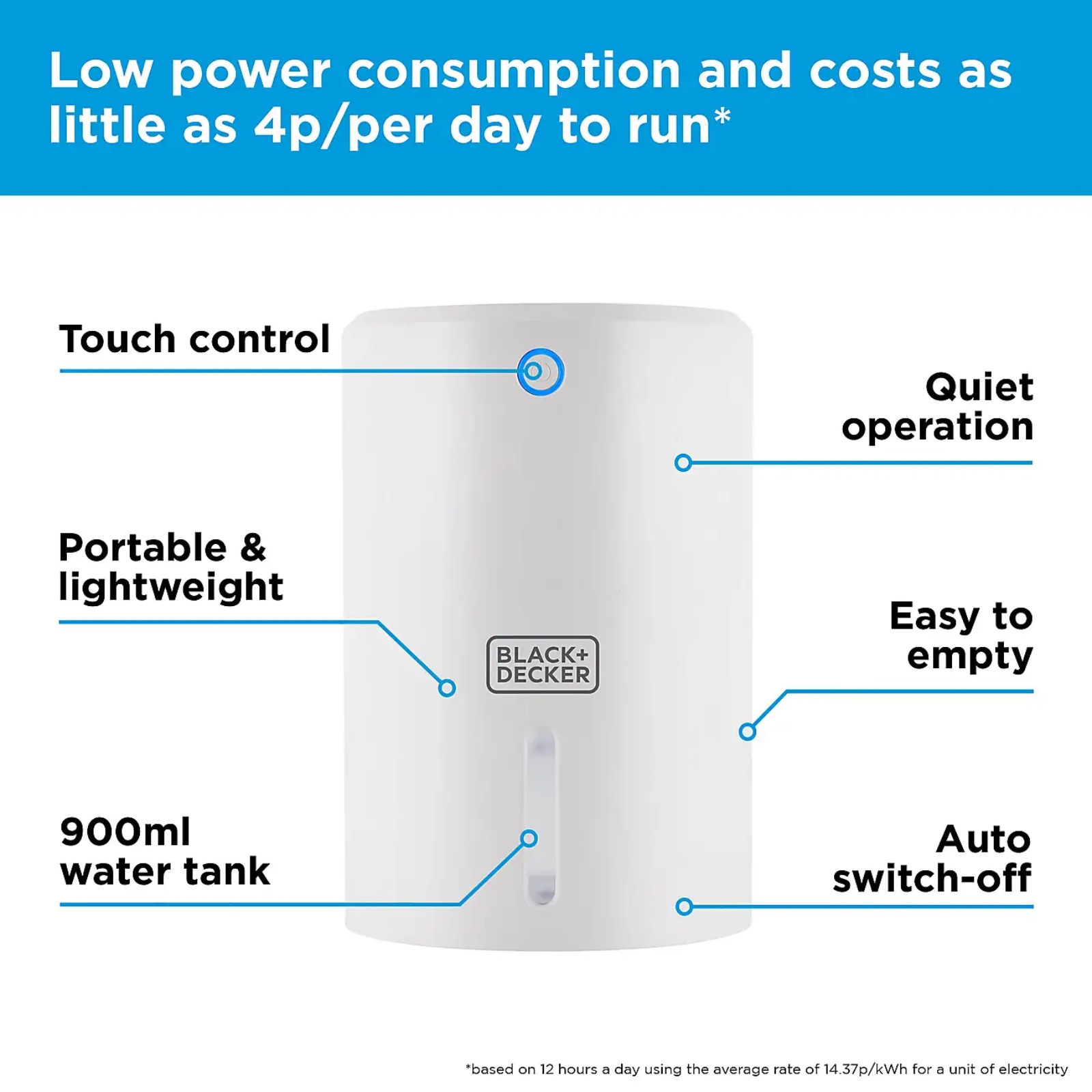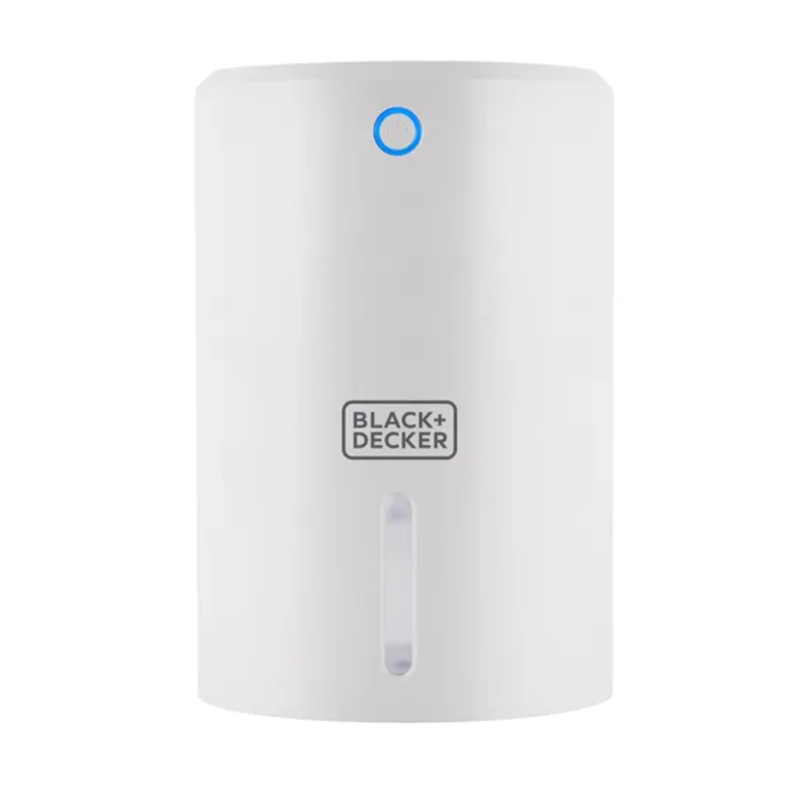 This high-performance dehumidifier by Black And Decker is perfect for creating a comfortable setting in your home. With powerful dehumidifying technology, it eliminates damp while extracting excess moisture from the air and prevents mould. Lightweight and compact by design, it is easy to move the unit around the home to achieve healthy environments throughout. Ideal for small box rooms, cupboards, wardrobes and closets. Complete with a 900ml water tank, the unit will effectively extract up to 250ml of excess moisture per day, meaning you can keep it running for a few days until the tank reaches full capacity. When the tank is full, the unit with automatically shut-off to prevent any leaks or spillages. Easy to use controls allow you to operate the unit simply from a touch of a button.