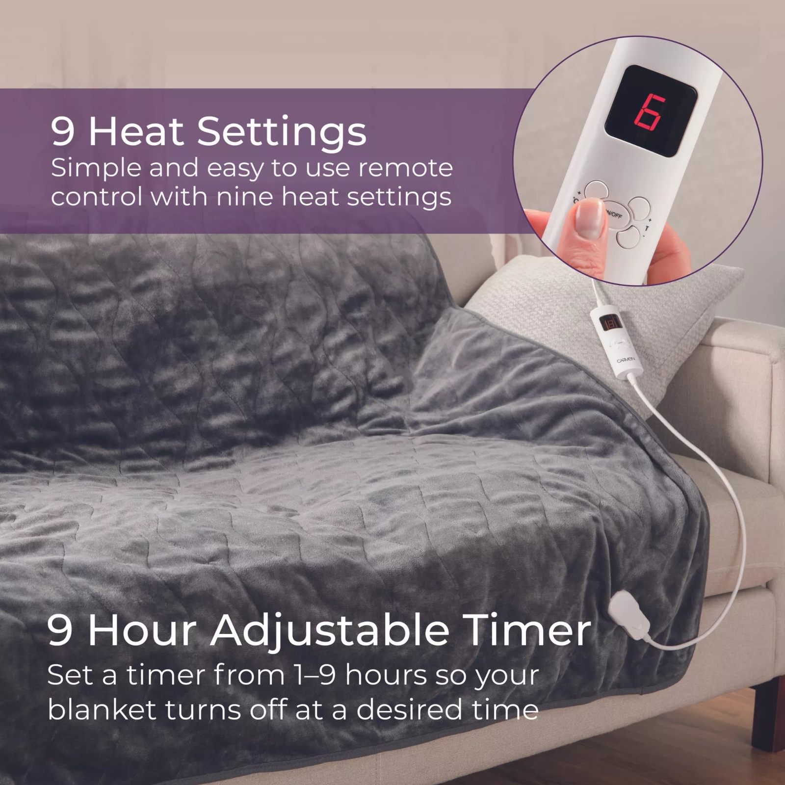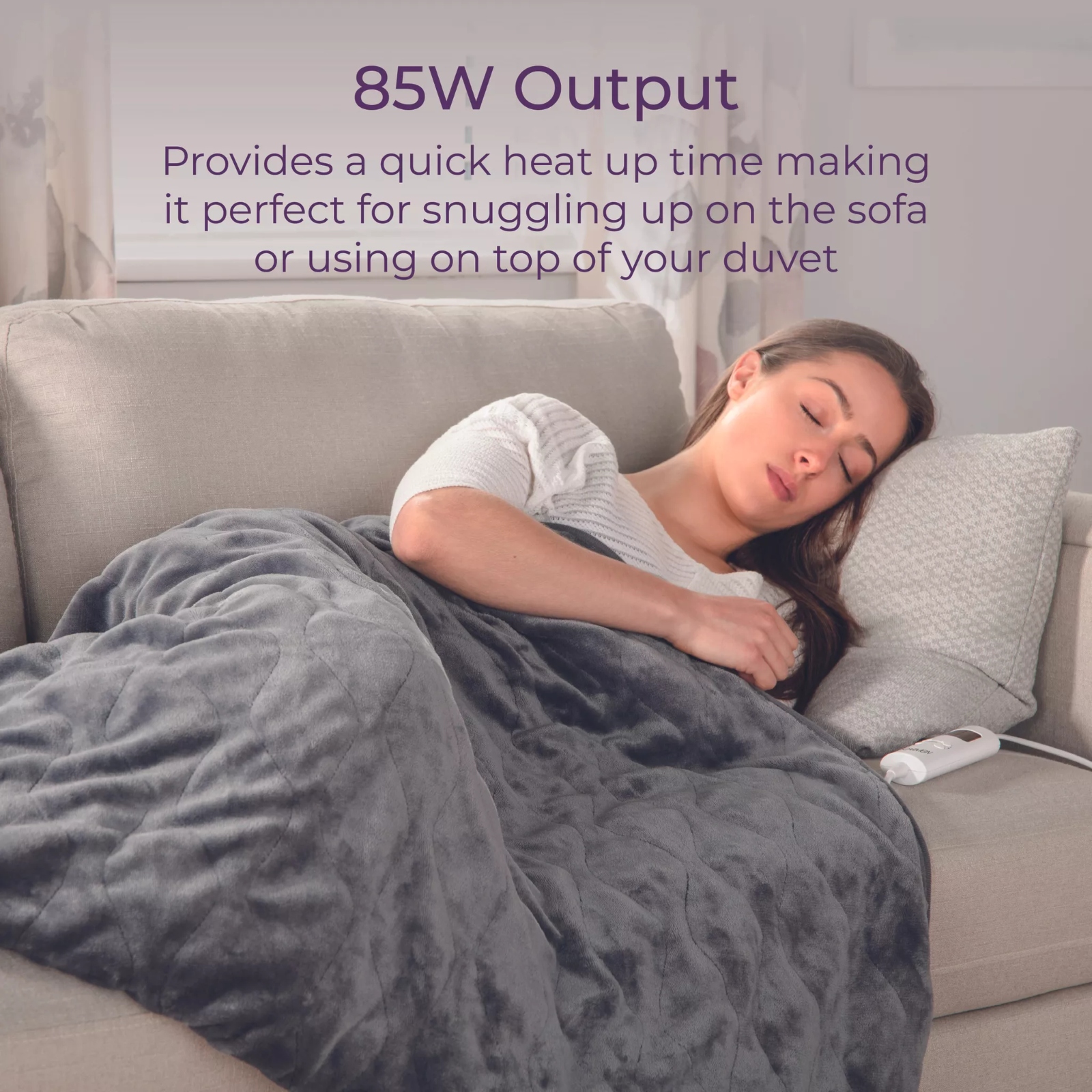 This Carmen Core Fleece Luxury Electric Heated Flow and Over Blanket features 85W output, which provides a quick heat up time making it perfect for snuggling up on the sofa or using on top of your duvet. The soft touch 230gsm luxury fleece is produced from super soft material perfect for keeping you warm and cosy. Simple and easy to use remote control with nine heat settings allows total control over the warmth of your throw, providing the perfect temperature for all your needs. The over blanket is also energy efficient and costs less than 3p per hour to run. The detachable controller lets you control the temperature and then it can be removed when the blanket needs washing. Includes overheat protection for added safety and peace of mind.