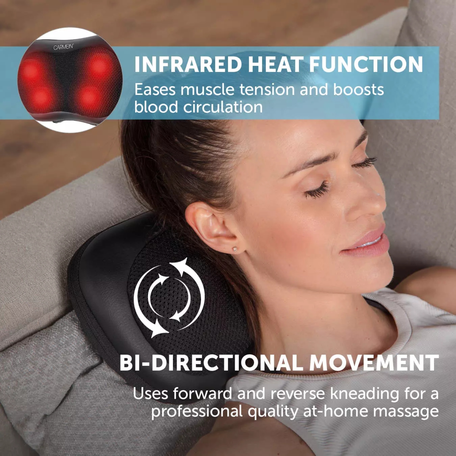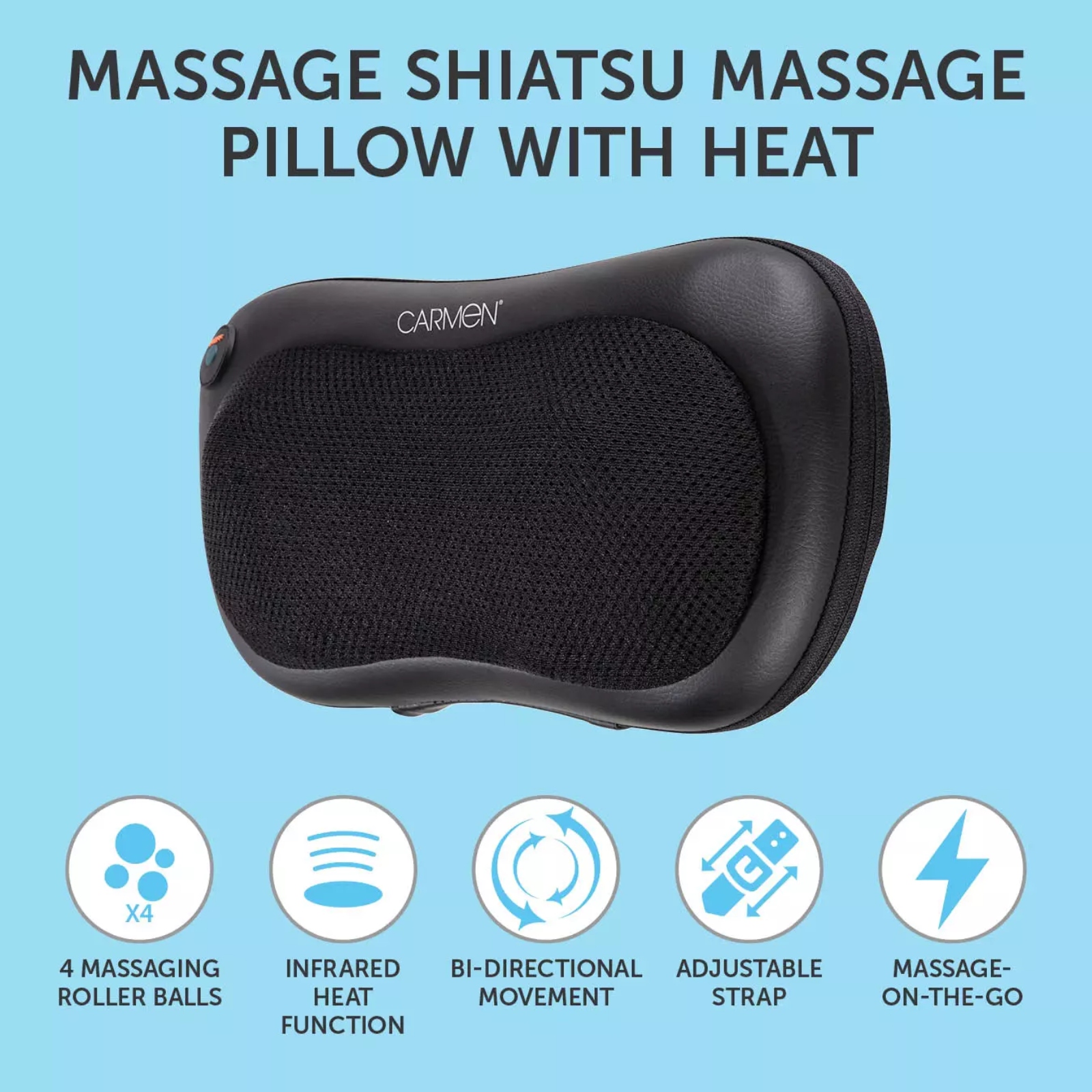 Enjoy a rejuvenating full body massage with the Carmen Shiatsu Massage Pillow. Designed with 4 different sized nodes to give you a deep tissue massage in your lower/upper back, neck, shoulder, abdomen and legs for complete body relaxation. Built-in infrared heat function targets specific areas to ease muscle tension and stress, as well as promoting better blood circulation- perfect for fitness fanatics and athletes who put tension on a specific area of the body. he bi-directional movement uses forward and reverse kneading for a professional quality at-home massage. Securely fix the massager to the back of your chair and comfortably cater to your muscle pain. Includes a home and car adaptor for a relaxing massage at home or on-the-go, so you can ease tension and stress wherever you are.