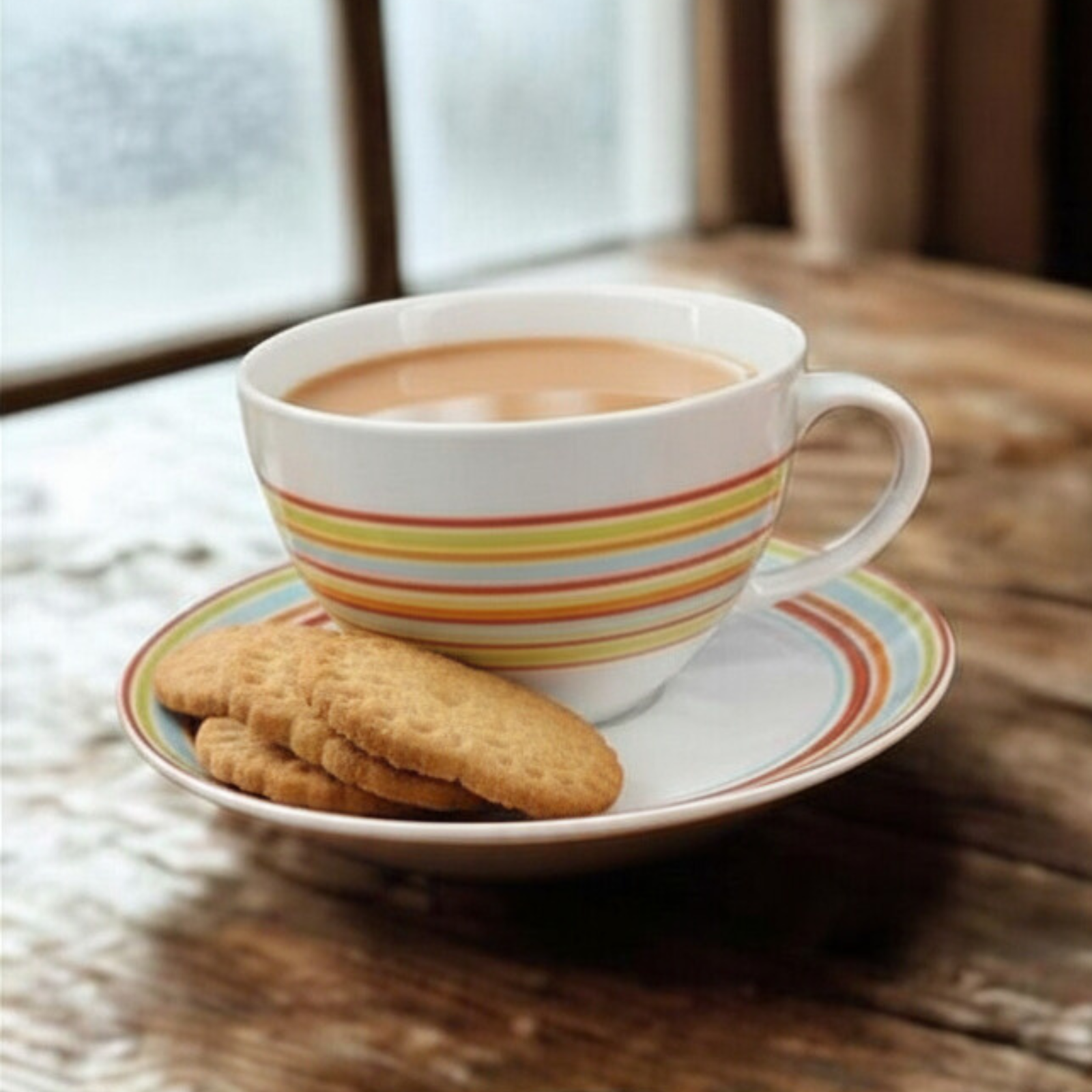 Brighten your mornings with the Citrus Stripe Jumbo Cup and Saucer Set, a vibrant addition to any kitchen. This set includes two oversized cups and two matching saucers, each adorned with a refreshing pattern of zesty lemon and lime stripes. Crafted from high-quality, durable ceramic, these “jumbo” vessels are designed for those who believe a standard mug is never quite enough. Whether you’re cradling a large latte, a comforting hot chocolate, or even a hearty serving of soup, the ergonomic handles and wide saucers ensure a spill-free, stylish experience that radiates sunshine.