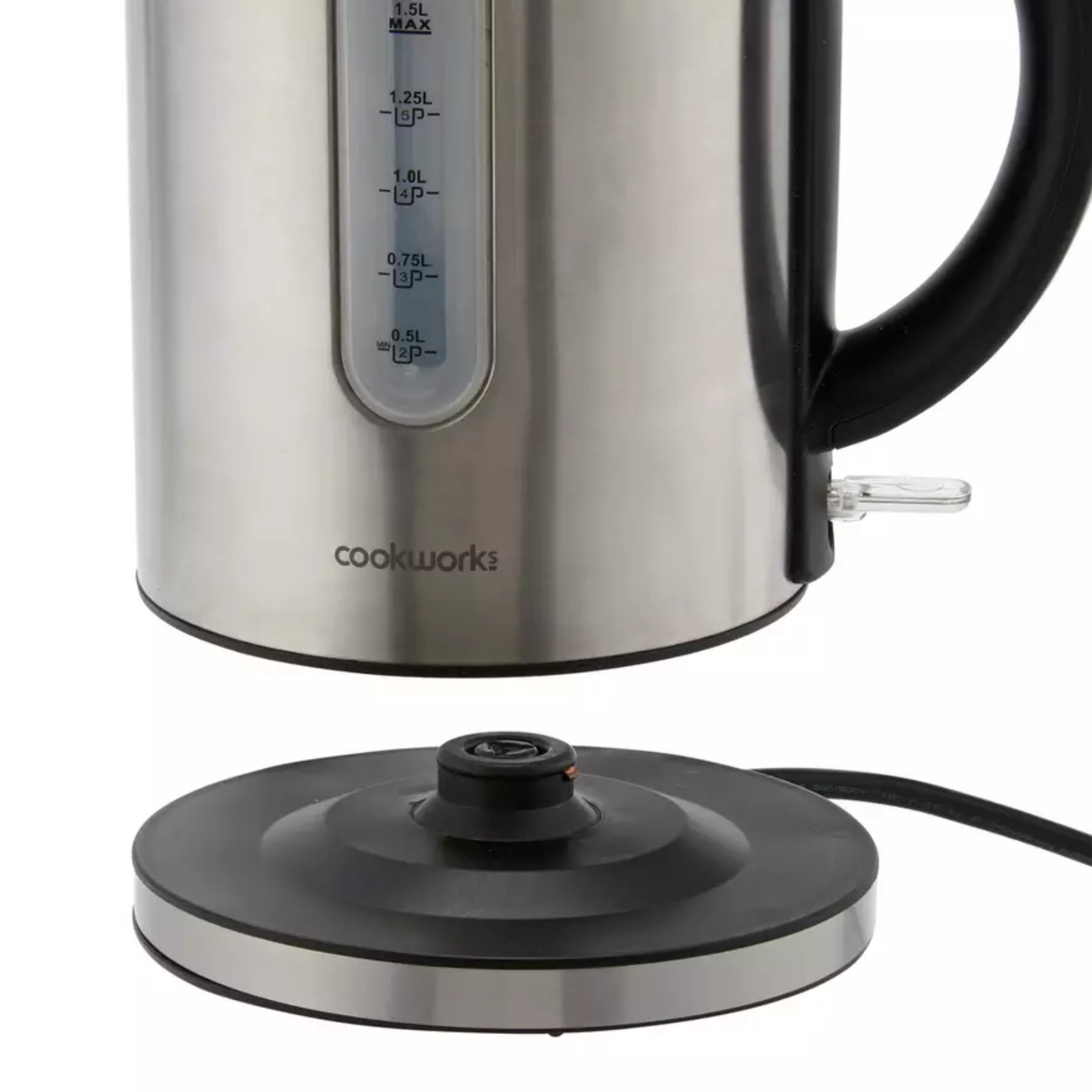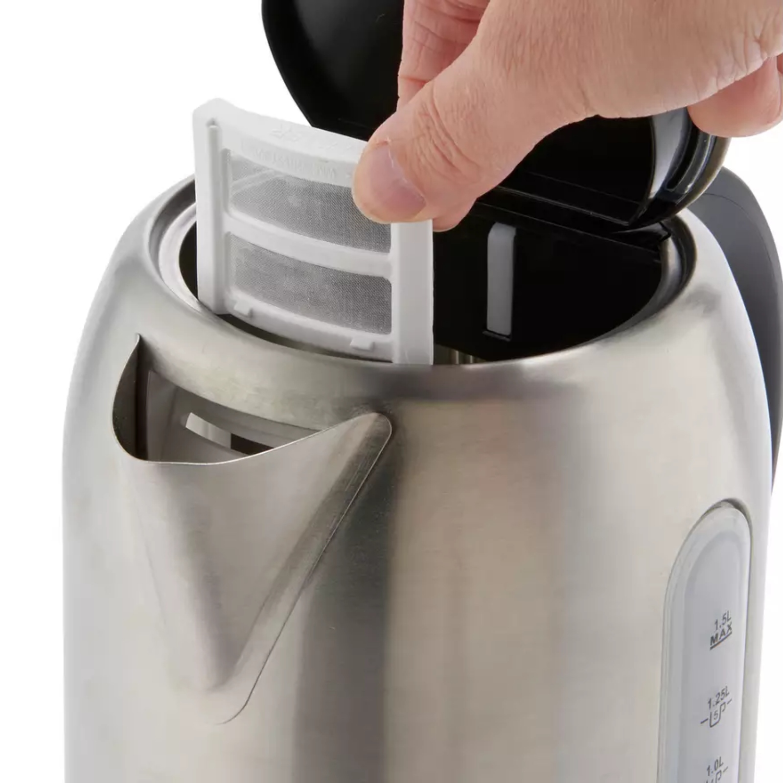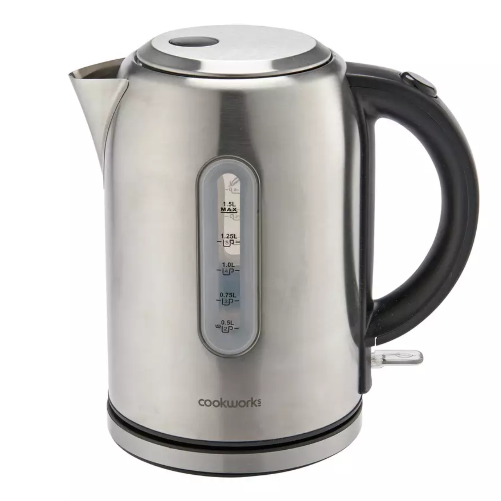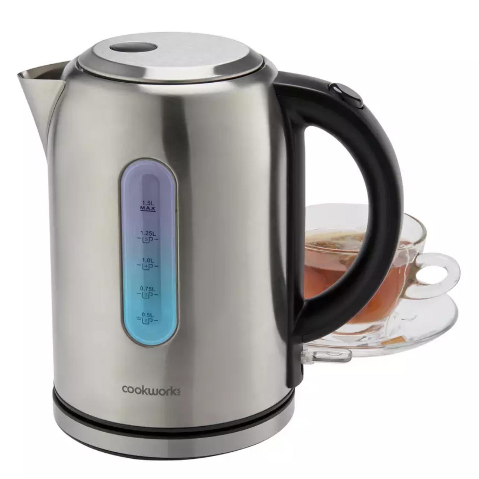 Have a quick, quiet cuppa with this Cookworks stainless-steel kettle. Cuppas all round with minimal waiting with the 1.5-litre capacity and rapid boil. Shed a light on the water level with the illuminated water window. And if you accidentally turn it on when it’s empty, the boil dry protection kicks in and helps prevent damage. You can even filter and boil at the same time. Simply remove the washable limescale filter for easy cleaning.