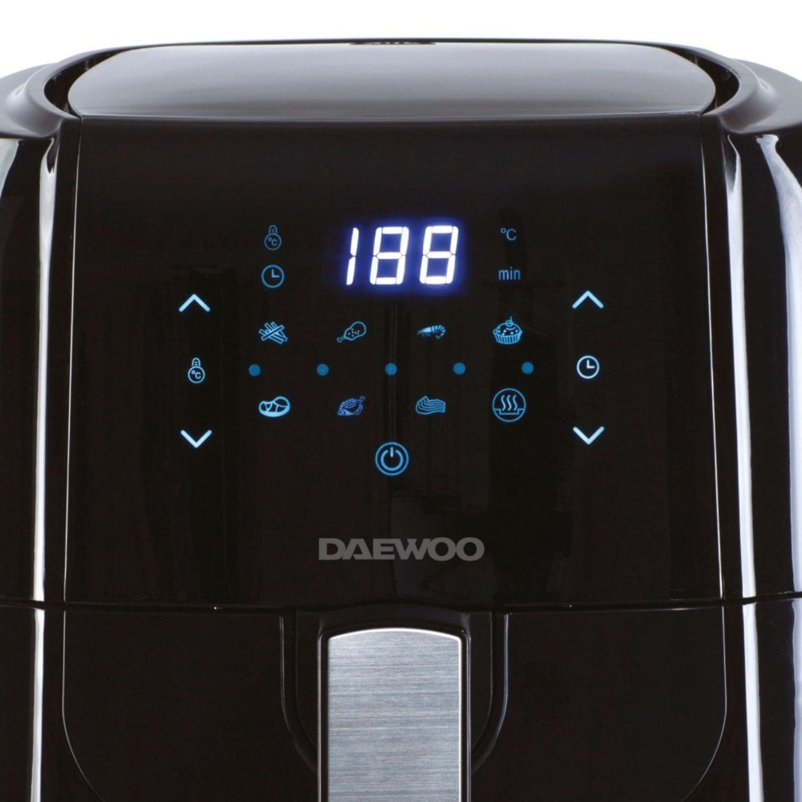 Reduce your energy bills by up to 73% with the Daewoo 5.5L Digital Air Fryer. Operating at a modest 1400W, it cooks meals faster and eliminates the need for preheating, ensuring you use less power without compromising on delicious results. With a spacious 5.5-litre capacity, this air fryer is ideal for households of 2-3 people. Whether you’re cooking for a small family or preparing a feast for one, the large capacity ensures you can handle it all with ease, making it a versatile tool for everyday use. Cooking made simple! The easy-to-use digital LED display puts everything at your fingertips. Choose from 8 pre-set functions—fries, chicken legs, prawns, cake, meat, fish, bacon, or ‘keep warm’—to fry, bake, roast, and more with just one touch. Want full control? Adjust the temperature (80-200°C) and set the 60-minute timer to customise your cooking perfectly for any dish.