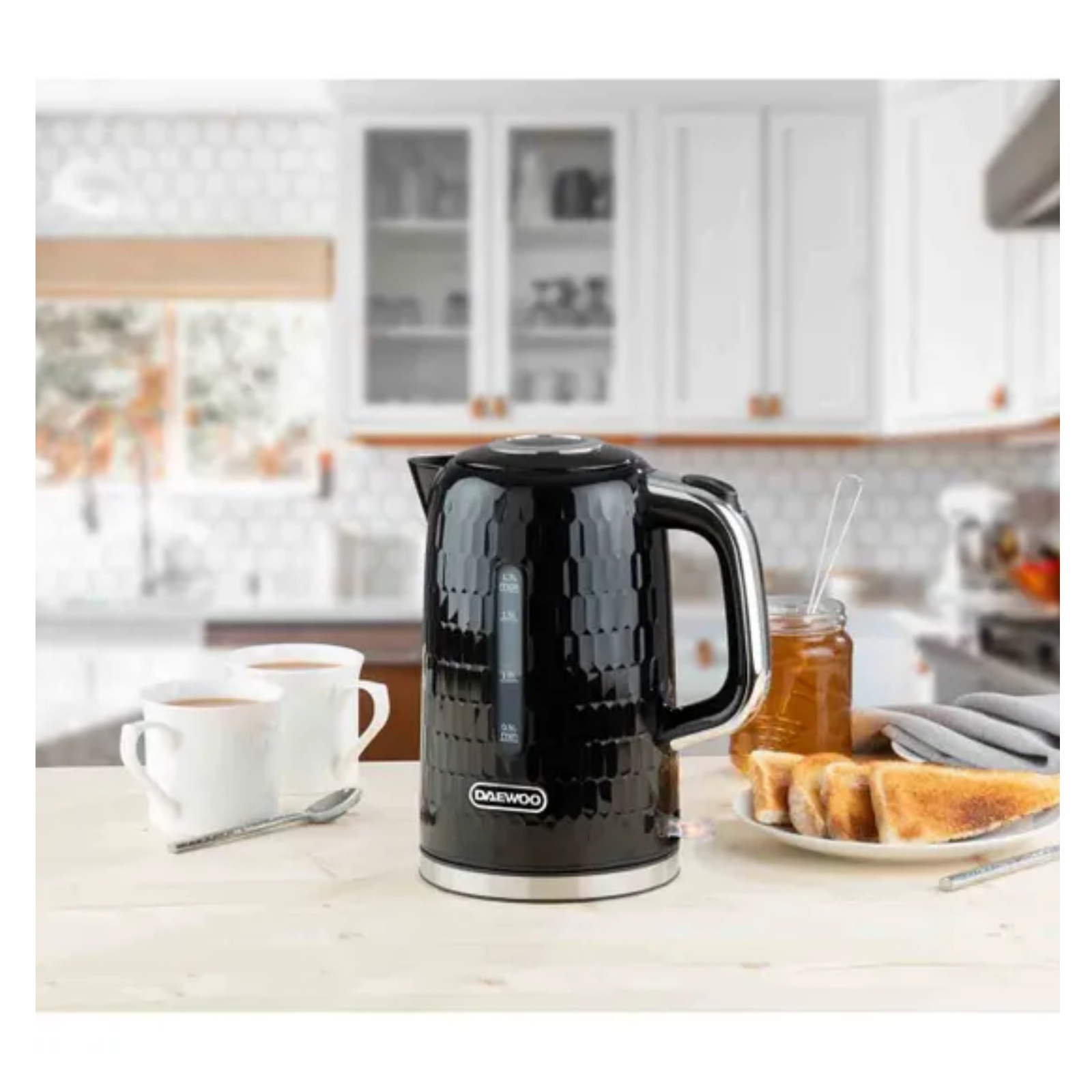 The Daewoo Honeycomb collection is a stylish, modern range perfect for refreshing any kitchen, with its glossy, textured honey comb inspired finish. The large 1.7 litre capacity is easily enough for a family home, making hot drinks or boiling water for cooking, and the powerful 3kw heating element means you won’t be waiting long for the water to boil. The kettle has a cordless design and is set on a swivel base, making it great for both left and right-handed use. The Honeycomb kettle has an extra wide opening lid to make it easier to fill, plus an easy-to-read water gauge on the side. There’s a power-on LED to show when the kettle is rising to temperature, with an auto-off feature, and removeable limescale filter.