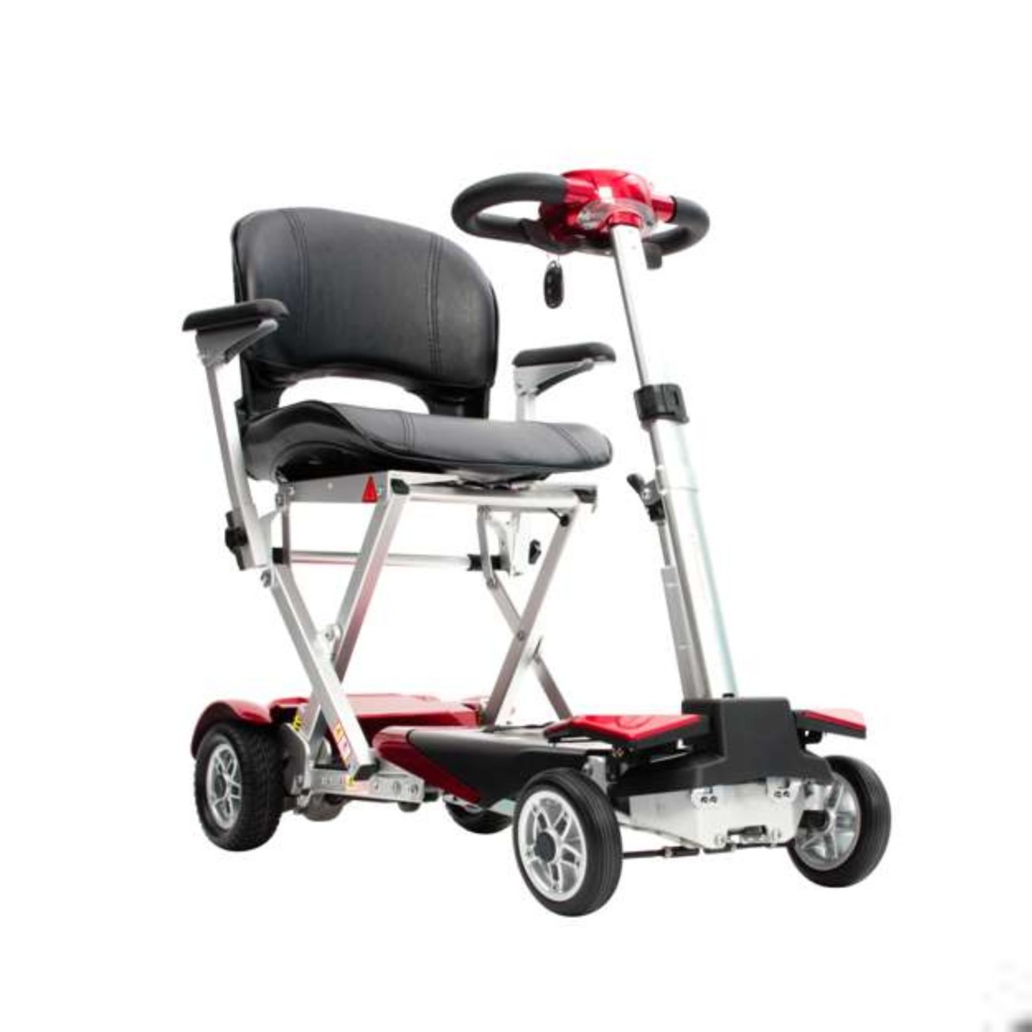 The AutoFold Elite Scooter features a striking new design with a fresh metallic silver finish and stylish silver wheel hubs. It’s a first in its class of remote auto-folding pavement scooters to feature Shock Absorbing front and rear suspension, designed to provide extra comfort for an exceptional ride. It also includes a new Delta bar and removable armrests for additional comfort, it comes with a fob for remote controlled folding operation, LED headlight and a light up digital LCD screen.
