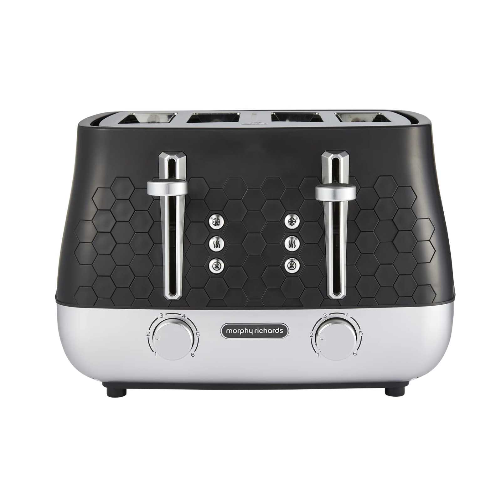 If you’re looking for a new toaster, look no further than the Morphy Richards Cassini 4-Slice Toaster! Our black toaster features a distinctive hexagonal design, creating a cohesive and modern aesthetic for your kitchen. Combining premium quality with a modern design, our Cassini toaster is crafted with multiple features to ensure a user-friendly design, this high end electric toaster will certainly make busy morning breakfast routines much easier. For instance, the high lift function allows easy and safe removal of smaller slices while the variable browning control lets you customise each slice to your ideal crispness. Not to mention, effortlessly keep your worktops clean with the convenient removable crumb tray while the illuminated control buttons offer a sleek, modern touch.