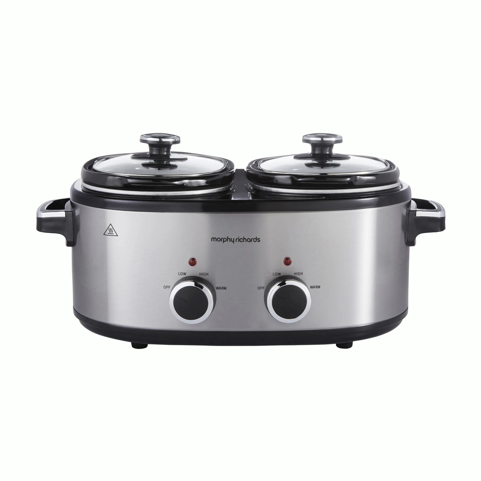 Introducing the Morphy Richards 3.8L DuoServe Double Pot Slow Cooker. Slow cookers, sometimes known as crockpots, are a kitchen essential. This slow cooker includes two separate cooking pots, meaning you can cook two different meals at the same time, making it ideal for buffets, hosting family parties or catering to different dietary requirements. For example, cook two recipes at once, like a chicken curry and vegetable curry! The independent temperature controls offer the flexibility to adjust the cooking times to accommodate different recipes. The two individual ceramic pots are 2 litres offering a combined 4 litre capacity, great for generous portions for family and friends.