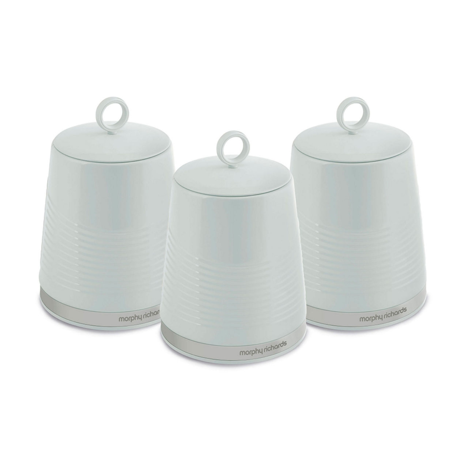 Neatly store tea, coffee and sugar on your kitchen counter with this stylish 3 piece canister set from Morphy Richards Dune range. Each canister is constructed from mirrored stainless steel to provide added durability, while the unique patterned exterior offers a contemporary visual appeal to your kitchen decor. The lids have an airtight seal to ensure the contents remain fresh and secure, while the large round loop handle gives you a comfortable grip for easy access to the contents. These canisters have a 1.3 litre capacity, letting you store large amounts of tea bags, coffee granules and sugar, making them perfect for busy households.