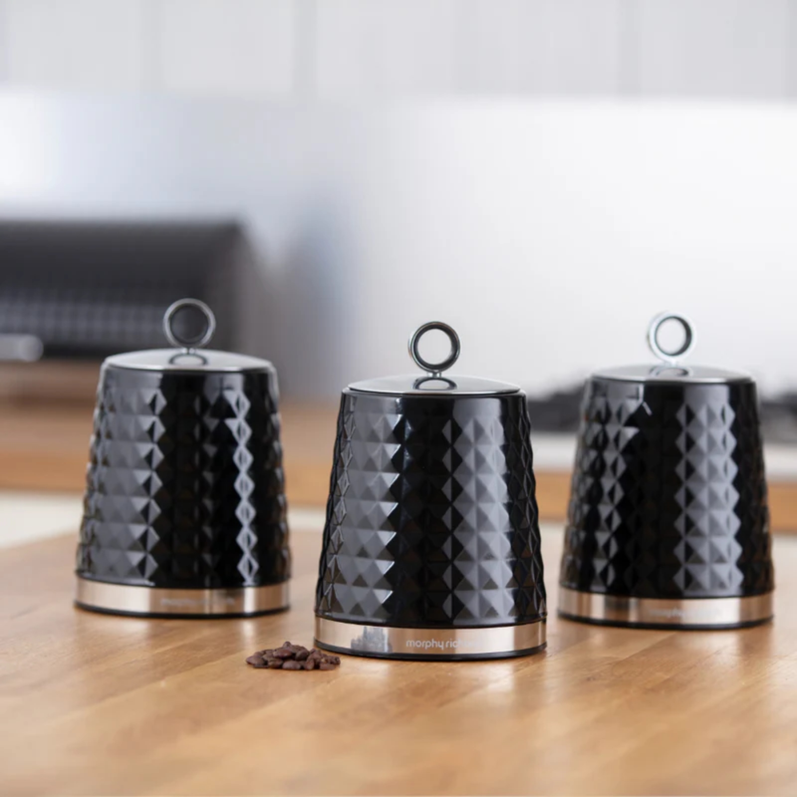 Lock in the freshness of your tea, coffee, sugar or herbs with the Dimensions canister set. Each canister is constructed from a steel body with a textured Dimensions colour coating for a sleek feature that stands out on your kitchen countertop. This set of canisters can each accommodate 1.3 litres of storage with mirror polished lids that secure the contents in place.