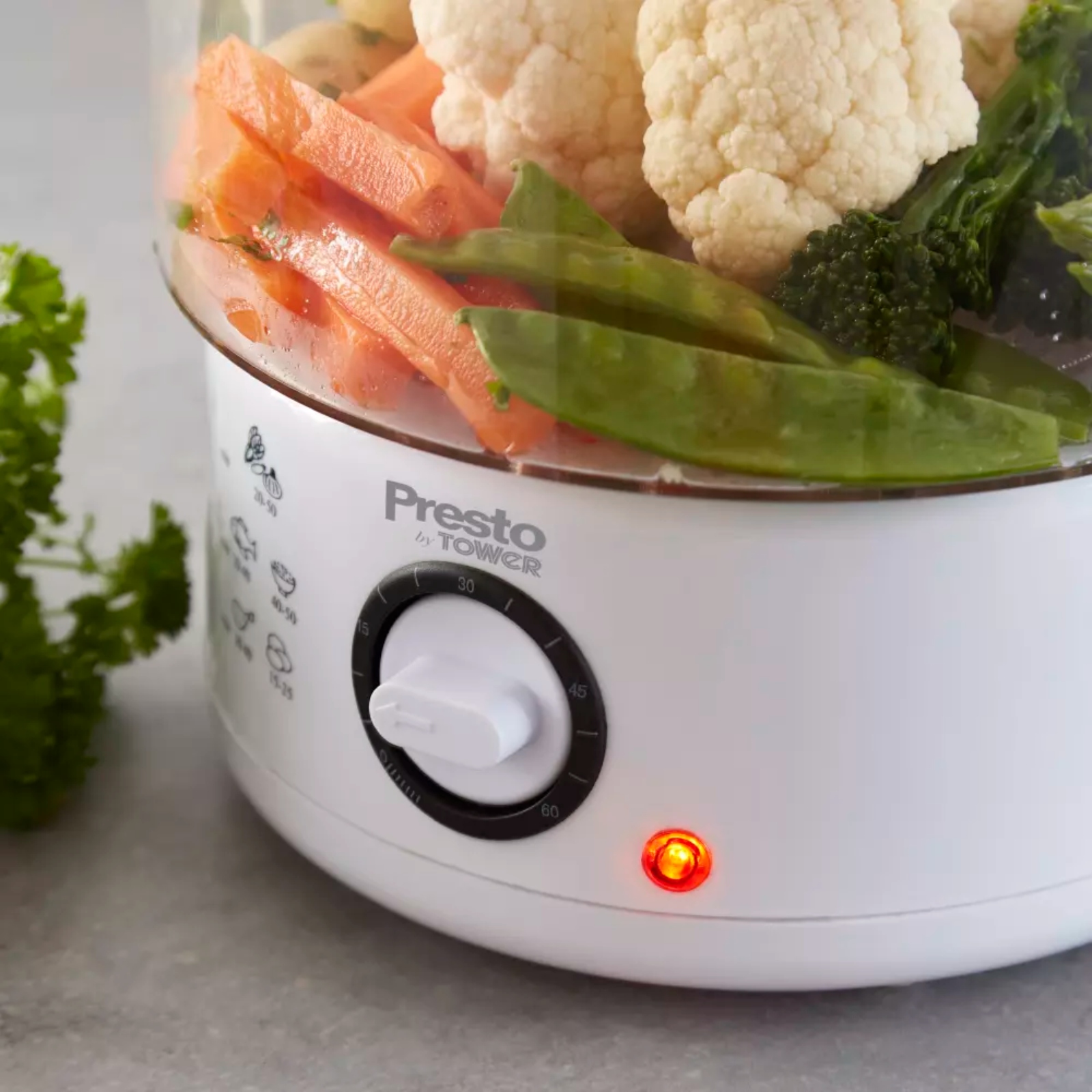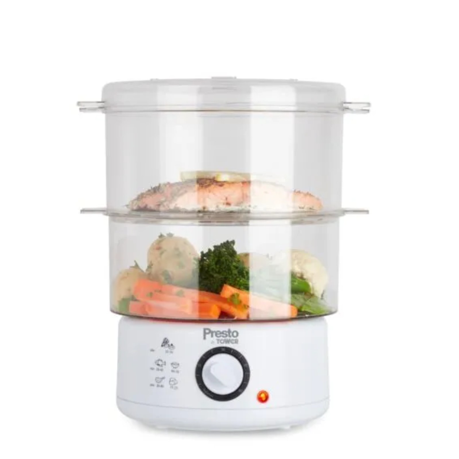 Create quick and healthy meals with this Presto 2 Tier Steamer from Tower. It features 2 x 2.4 litre tiers which are perfect for steaming portions of fish, meat and vegetables, with 400W steam-ventilated performance to lock in more vitamins and nutrients from your ingredients. The 60-minute timer provides complete control over the cook time, allowing you to schedule an end time to ensure precise results. An extendable stand offers additional space to cook more ingredients, while the included rice bowl accessory is ideal for preparing the perfect fluffy rice for your dishes. Dishwasher-safe parts provide an easy clean, with collapsible containers to save that extra bit of space in storage. The steamer has non-slip rubber feet for enhanced stability on your surfaces, complete with an automatic switch-off feature to ensure safe use.
