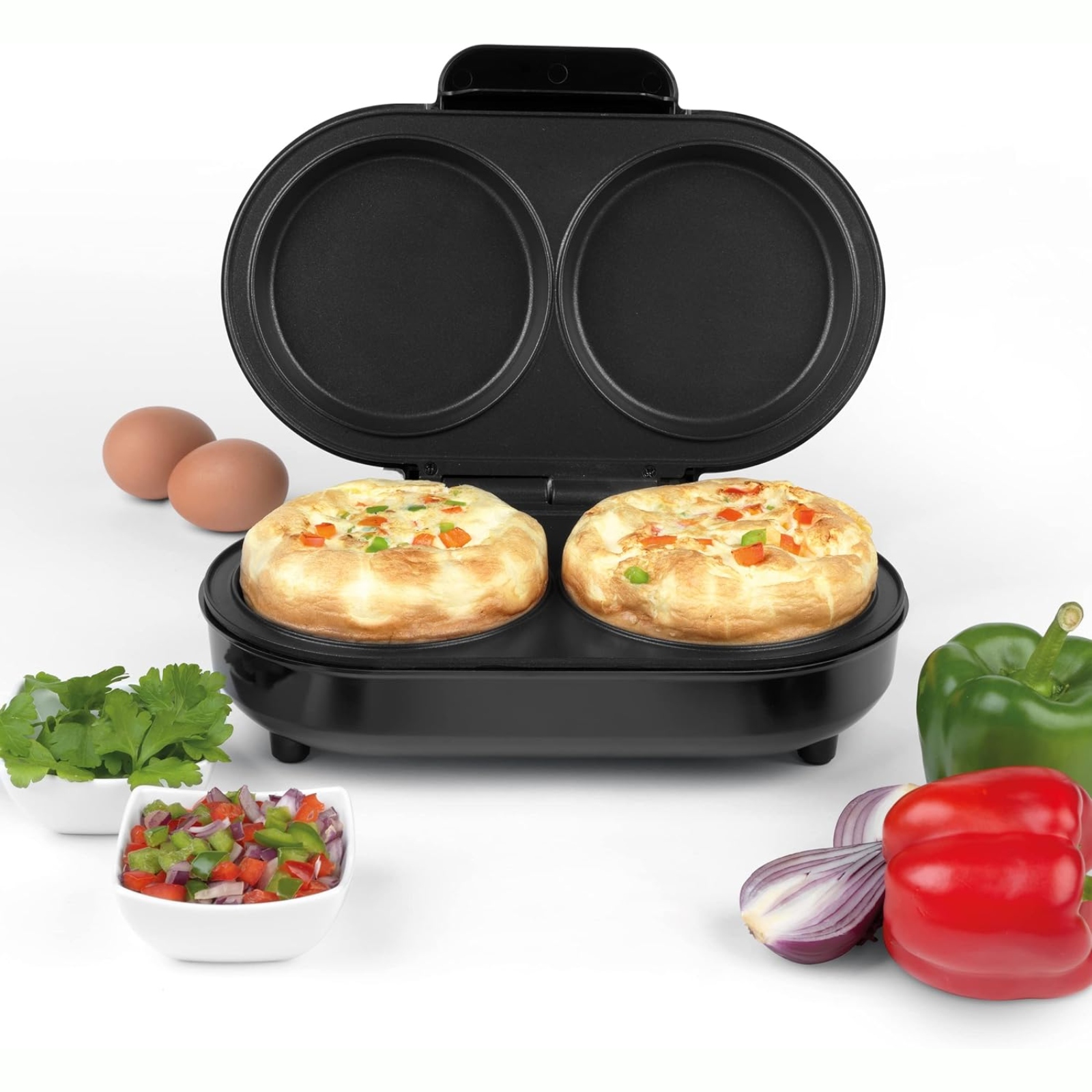 Challenge your inner chef with the XL Duo Omelette Maker from the Go Healthy range by Progress. Make more than just omelettes with the multifunctional grill, from breakfast pastries, tender chicken breasts, juicy burgers and even sweet pancakes. The extra-large dual cooking chambers allow 30% bigger fluffy omelettes in minutes; no need for flipping. With an impressive 850W power, the non-stick omelette maker is easy to clean, has ready indicator lights and cool touch handles for added safety.