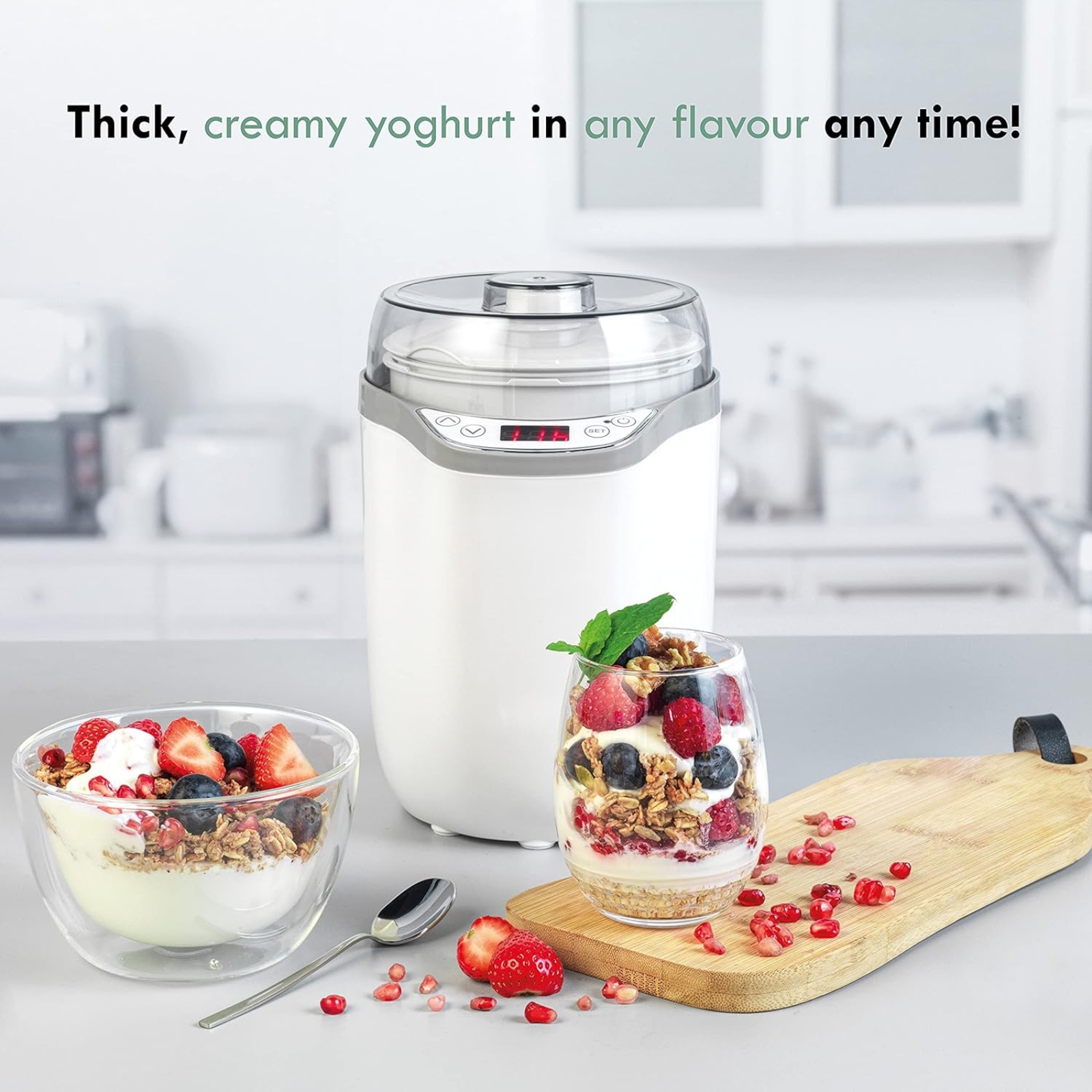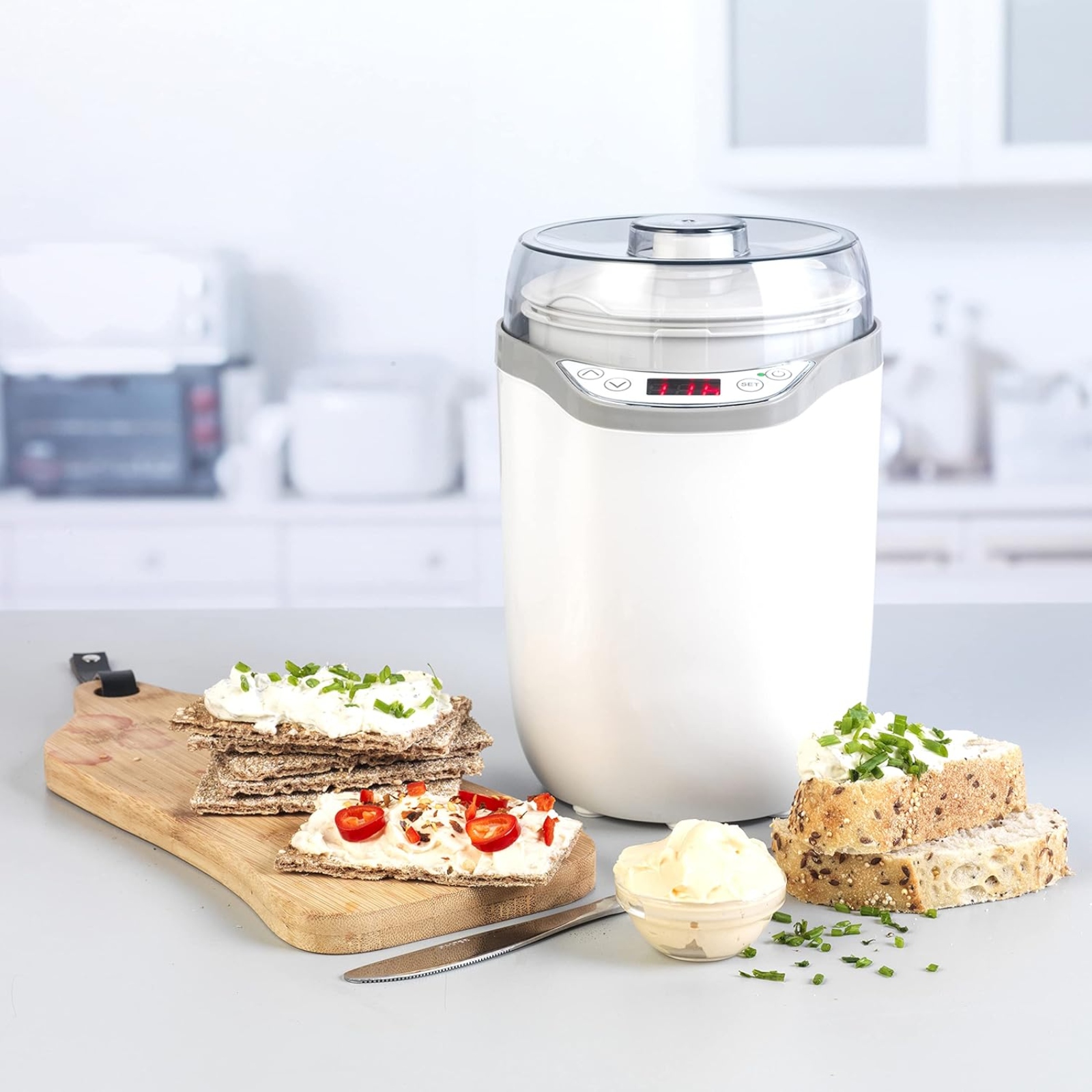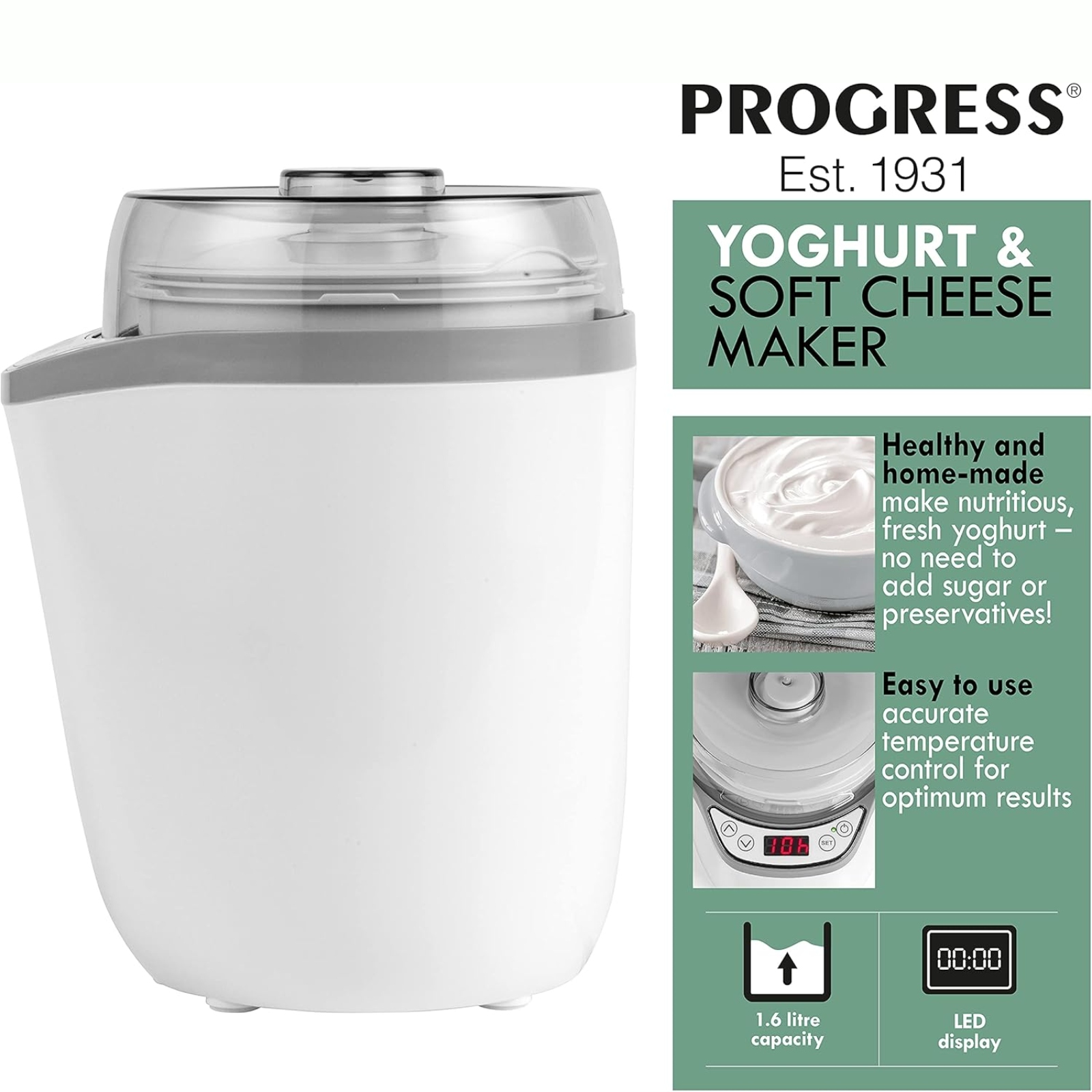 Use the Progress Yoghurt and Soft Cheese Maker to create delicious fresh yoghurt, without the need for added sugar or preservatives. Indulge in creamy yoghurts and deliciously spreadable soft cheese made at home, perfect for a yummy breakfast or an afternoon treat. Use the machine to create plain yoghurt, or use the included strainer for thicker Greek-style yoghurt, ideal for breakfasts and desserts. For a more savoury snack, use the device to create soft cheese, perfect for spreading onto crackers.