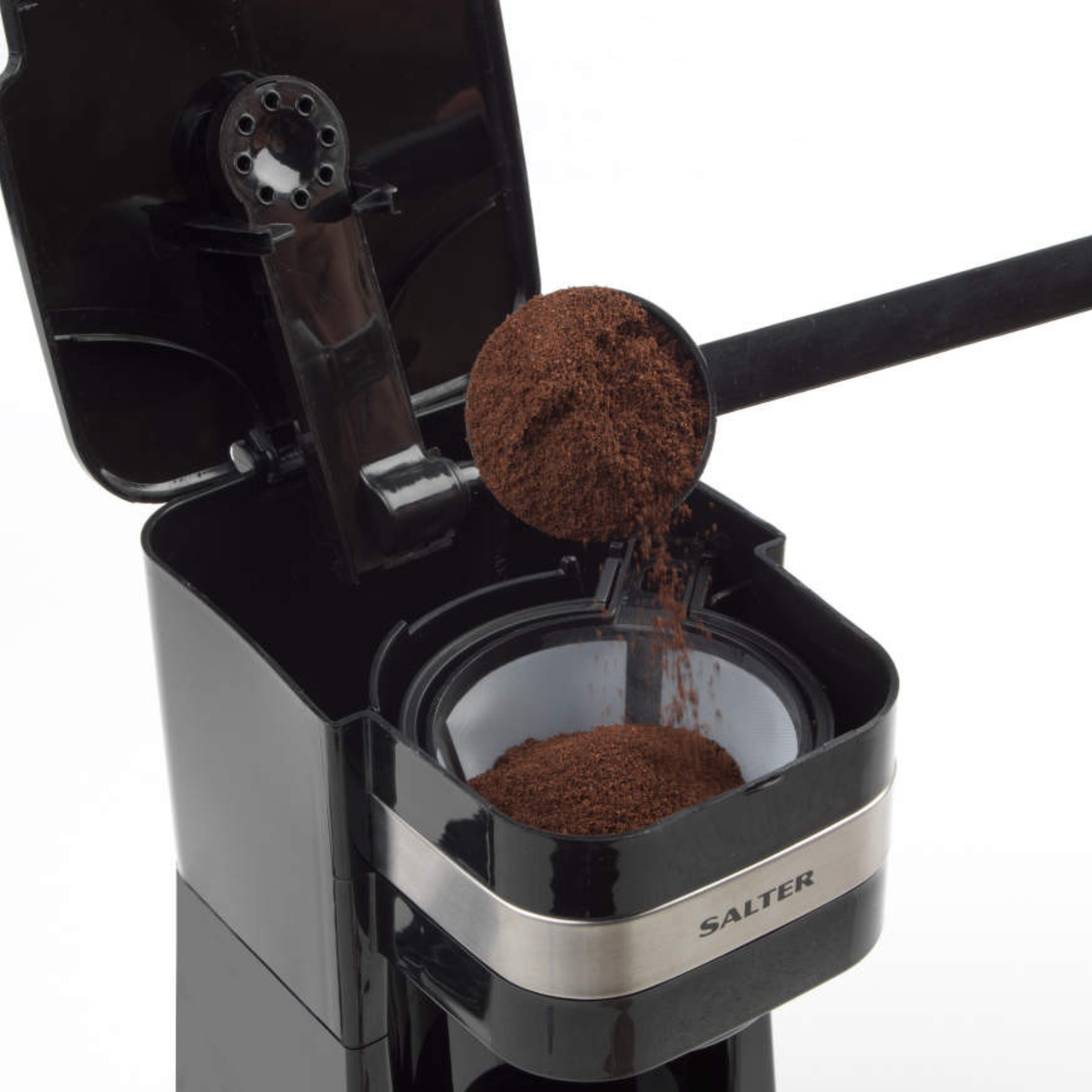 Elevate your coffee experience with the Salter One Cup Coffee Maker and have your perfect brew on the go! Designed for those needing a quick pick-me-up in the morning and throughout the day, this filter coffee machine brews a single cup in 3-4 minutes. Simply add your favourite ground coffee or coffee pad to the reusable filter and use the one-touch operation to start brewing! Ideal for the daily morning commute, a 420ml stainless steel travel mug is included so you can drink on the go!