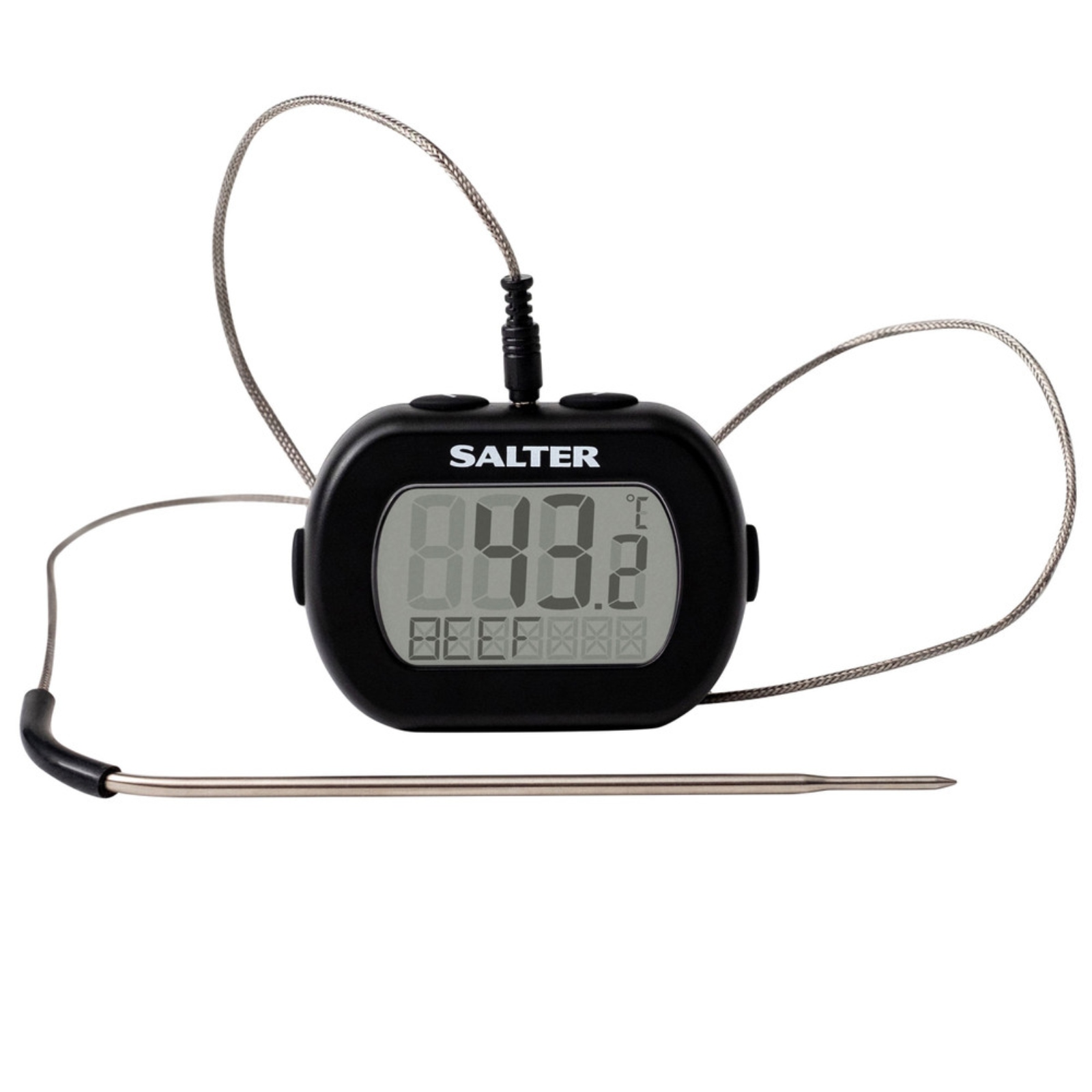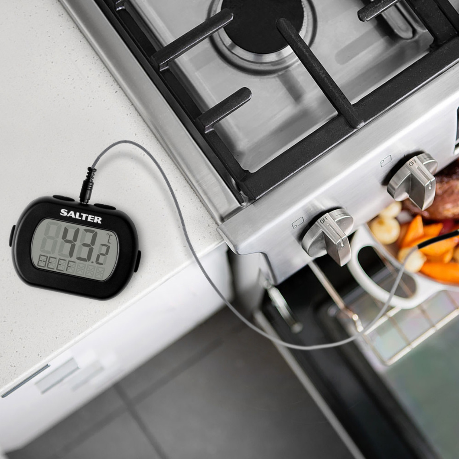 - Take the guesswork out of cooking with the Salter Premium Leave-In Cooking Thermometer, designed so you can keep an eye on your food and oven temperatures simultaneously.
