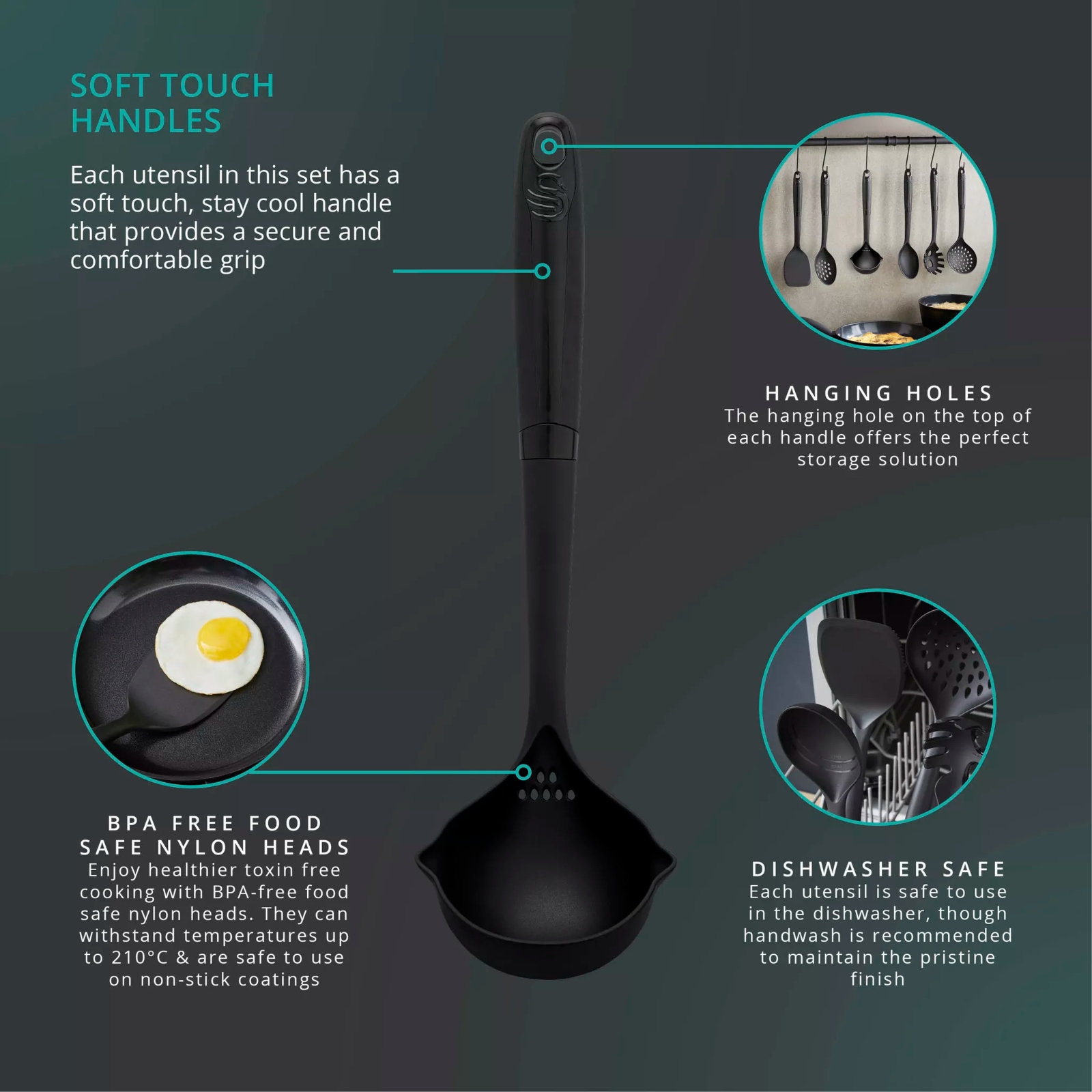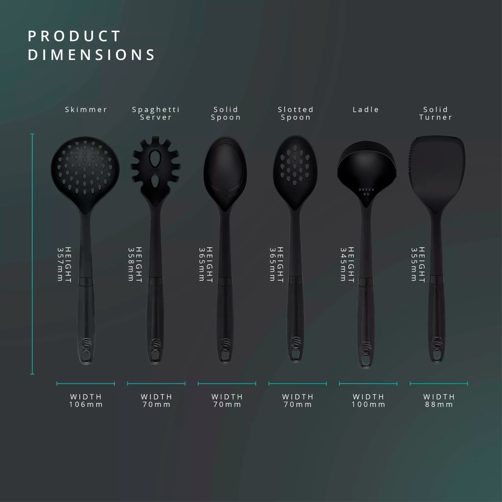 Take the fuss out of mealtimes with this 6 piece Kitchen Tool Set from Swan’s Stealth collection. This handy set features a spaghetti server, solid spoon, slotted spoon, solid turner, ladle and skimmer to assist you with a variety of everyday cooking tasks. Each utensil has been expertly made from durable nylon which is safe to use on non-stick coatings without causing damage, whilst the soft touch handles provide comfort when cooking and are heat resistant up to 210°C for safety when serving. Hanging holes offer the perfect storage solution, whilst handwash is recommended to keep each utensil in this set in pristine condition.