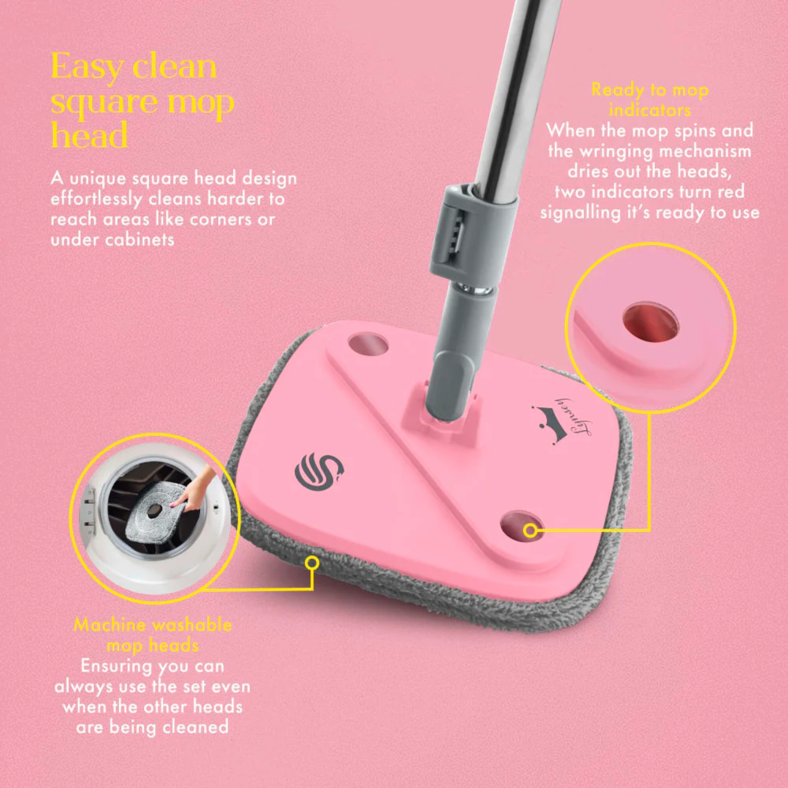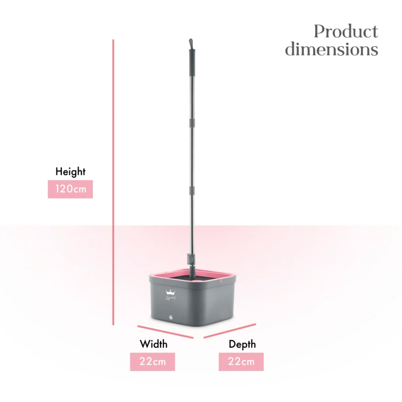 The Swan x Lynsey pink and grey turbo spin mop and bucket set is your one-stop mop to make your floors sparkle. It features dual water tanks, which separates dirty and clean water in the bucket to prevent cross contamination, so you aren’t mopping your floors with dirty water. This also uses up less water than traditional mop buckets, reducing the number of times you need to refill. To make cleaning even easier, using 13 high powered aqua jets and 360° spin cycle, the mop head fibres get agitated by the dual bristle brushes, forcing dirty water out and pushing clean water in, so you always have clean water. Two indicators will turn red when it’s wrung and ready to be used again, so no guesswork is needed. Drain the dirty water into the sink with the handy plug and add clean water in the separate hole for easy on the go filling as you clean. For tackling those hard to reach areas like corners or under cabinets, the spin mop head features a square design, giving you better cleaning results. This mop can clean a range of surfaces, including shower screens, bathroom tiles, windows, garage doors, garden furniture, wheelie bins, skirting boards, high reach kitchen cabinets, Ceilings and walls, Tile and Laminate floors. The multi-surface microfibre pad captures the dirt rather than pushing it around for more effective cleaning. The durable stainless steel handle is fully collapsible to neatly store the spray mop away in your cupboard or hang it on the wall, giving you the ultimate space-saving cleaning solution. That’s why it has the Lynsey’s crowning stamp of approval.