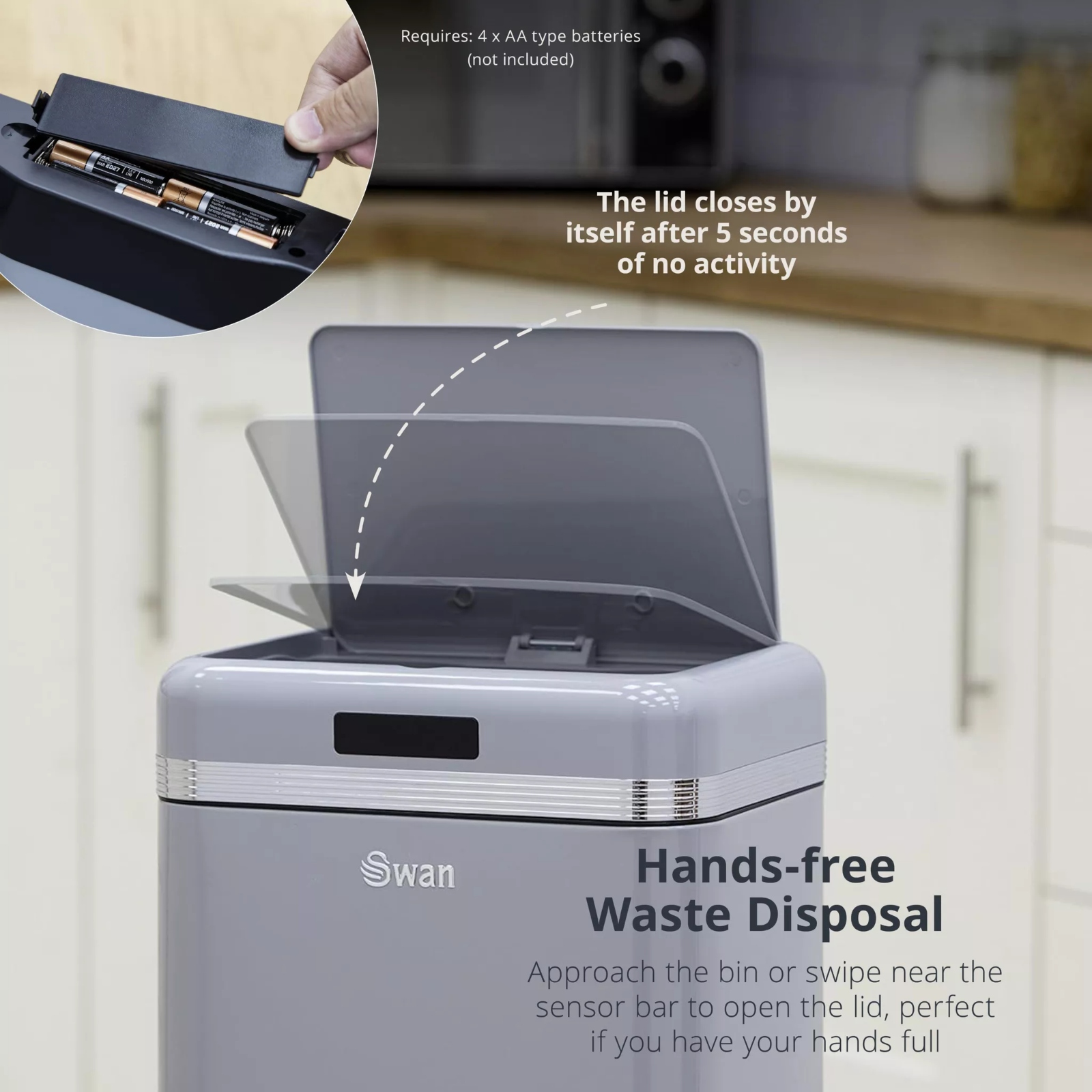 Lid sensor activates 5-15cm in front of the bin