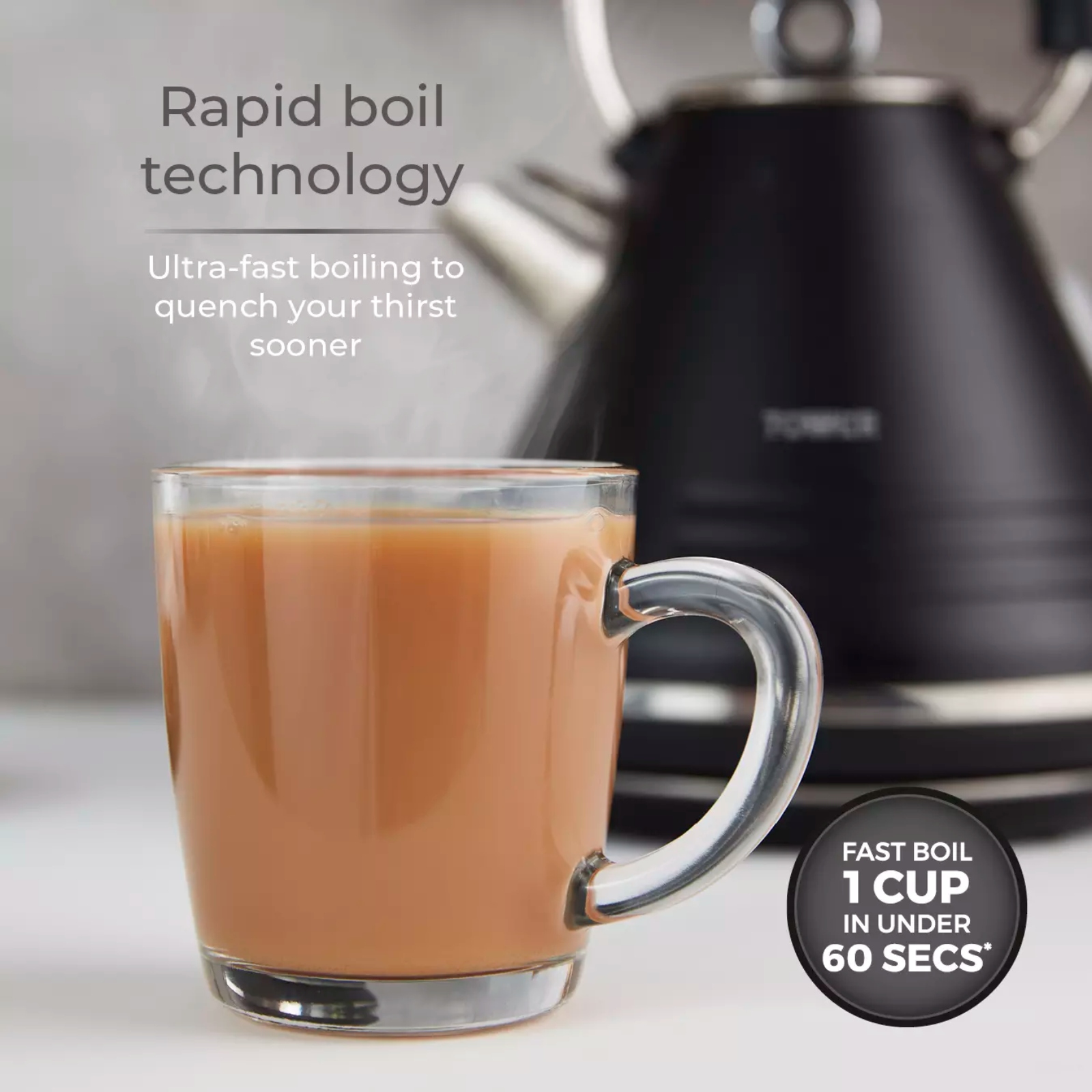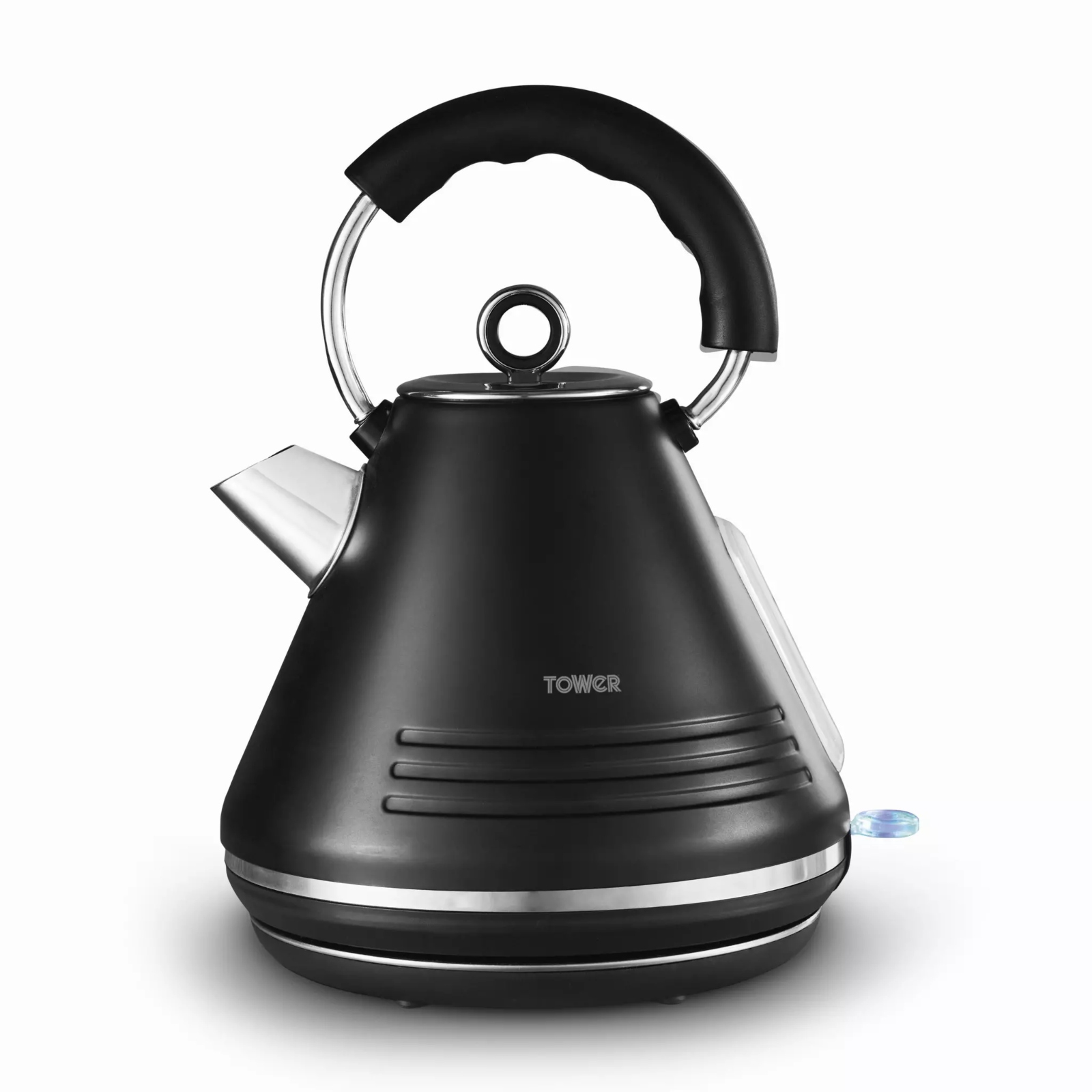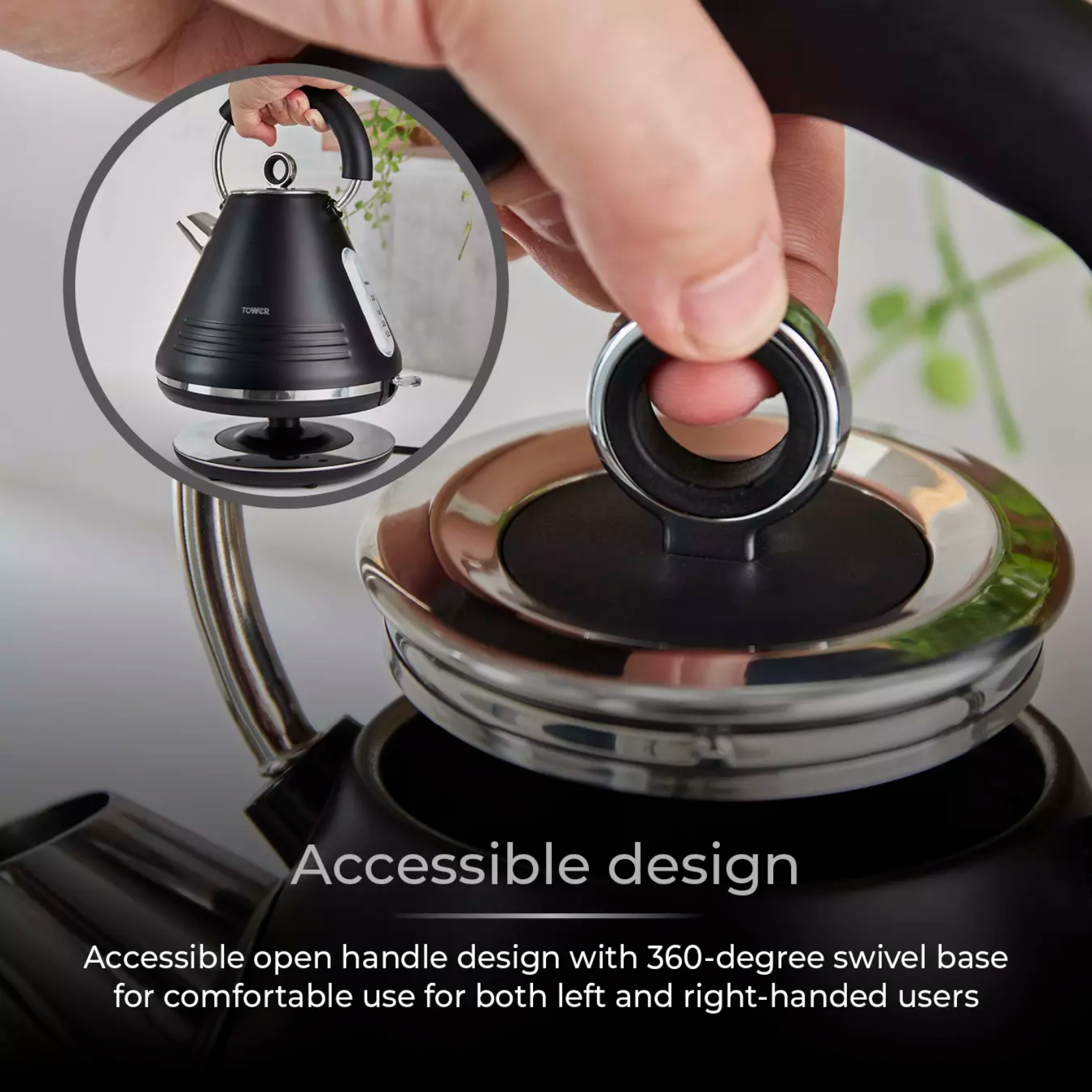 Add contemporary style to your kitchen with this Ash Pyramid Kettle from Tower. It features a sleek grey and chrome body with premium matte finish in a stylish, modern design. Rapid boil technology takes the time out of drink-making, allowing you to boil 1 cup in less than 1 minute. The large 1.7L capacity is perfect for families and busy households, holding enough water to make 7 drinks at a time. It’s simple to refill with the flip top lid and comes with a removable filter which can be rinsed under the tap to easily combat excess limescale. Its accessible open handle appearance with 360-degree rotational base makes it comfortable to lift up and refill for both left and right-handed users.