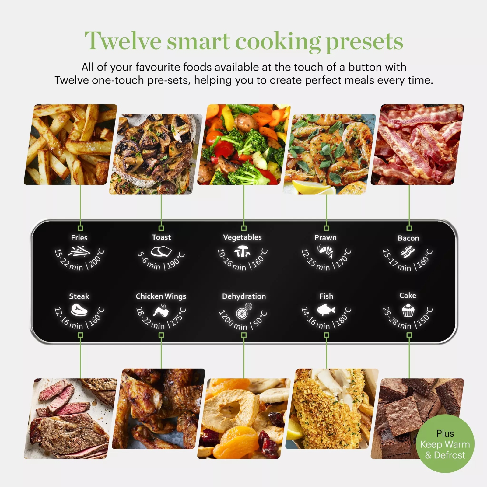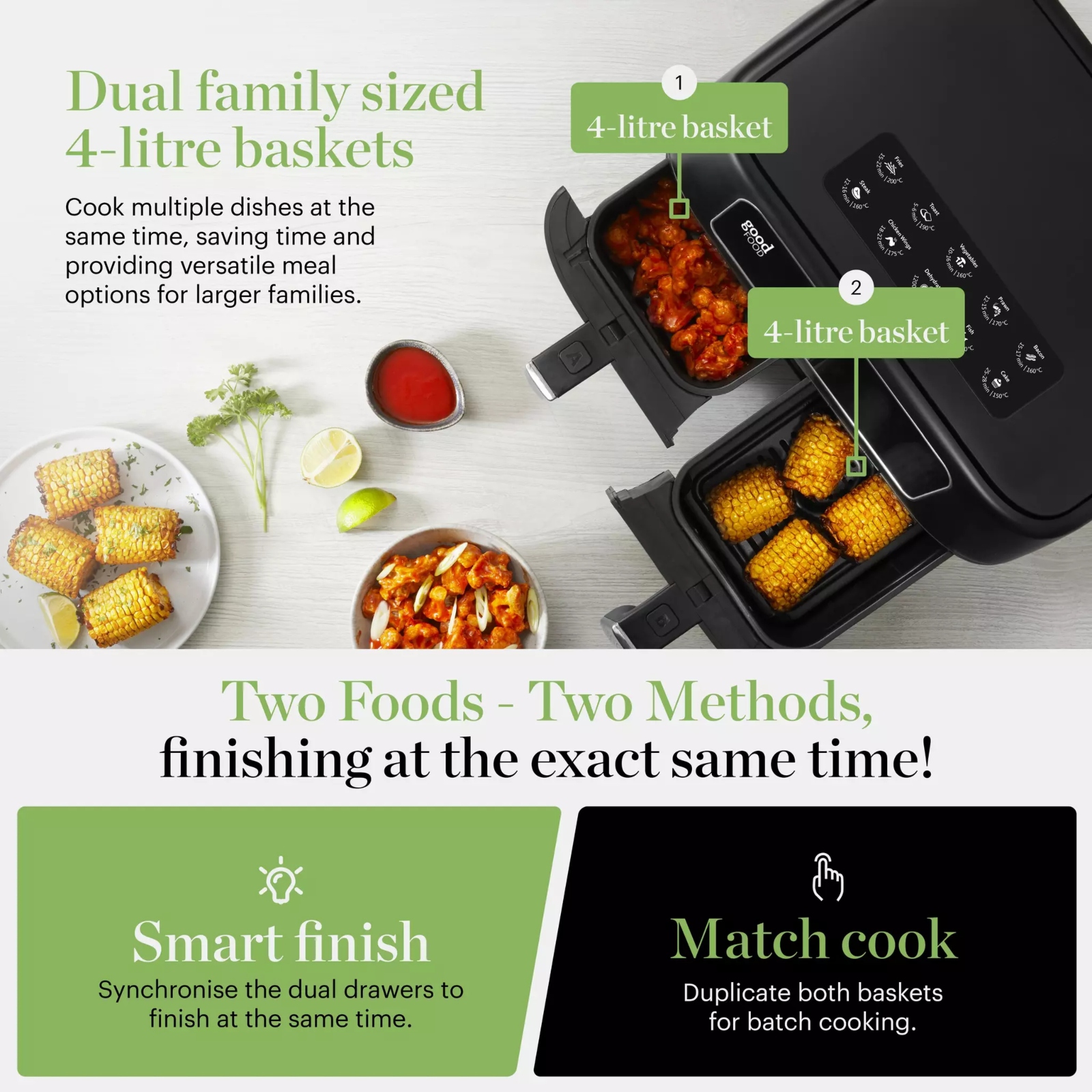 Get the most out of your kitchen with this 8L Duo Basket Air Fryer from Good Food in partnership with Tower. Specially designed to be used with the vast Good Food recipe library, it is perfect for budding chefs who want to test their skills and create family sized portions. Featuring Vortx technology, food cooks 30% faster with just one spoonful of oil required, resulting in food that has 99% less fat. It has a spacious capacity of 8L comprising of 2x 4L baskets so you can cook more of your air fryer favourites or create full family meals in no time. The Sync function ensures that food in both drawers finishes cooking at the same time for fuss-free cooking The Match Cook function expertly duplicates the cooking settings to match in both drawers, allowing you to cook enough to feed the whole family. Choose from 12 pre-set cooking options including Chips, Fish Ribs, Veg, Toast, Chicken wings, Steak, Prawn, Dehydrate, Bake, Keep Warm and defrost.