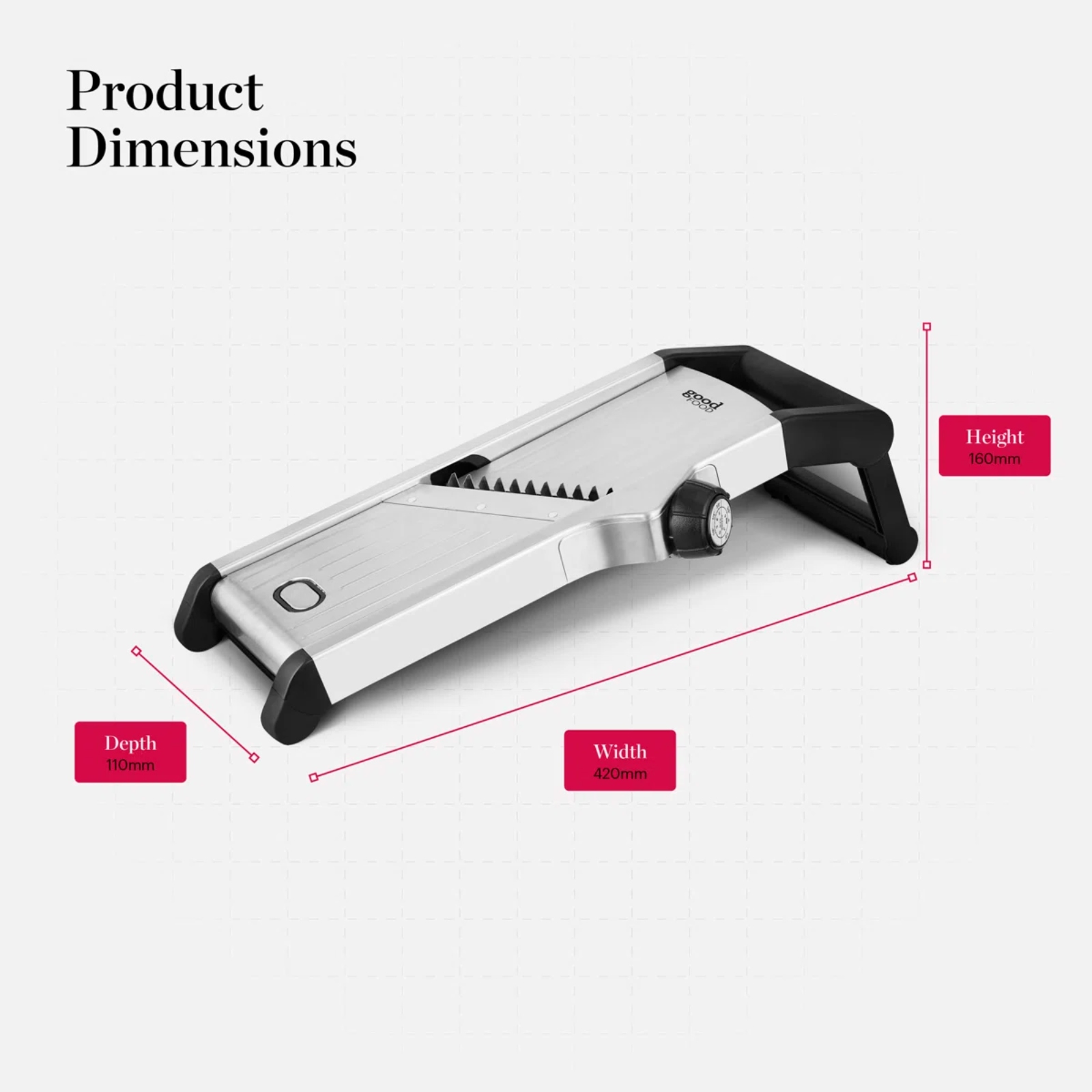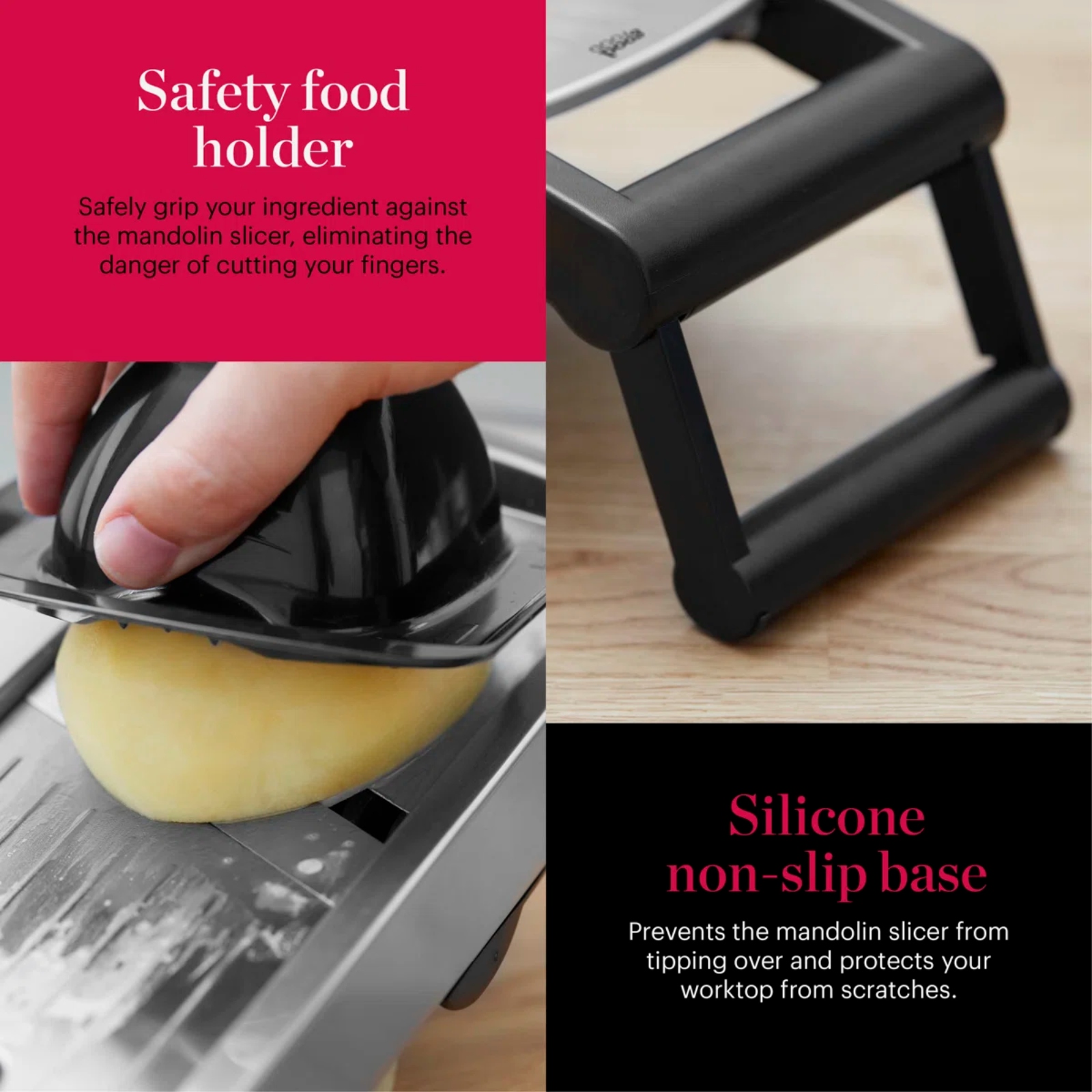 This stainless steel mandolin slicer from Good Food in partnership with Tower is your versatile kitchen companion for chopping and slicing. Crafted from high quality stainless steel and food safe plastic, this slicer combines durability and functionality for toxin-free food prep, making it a must-have tool for every home chef. The precision steel blades effortlessly cut through a wide range of ingredients, creating perfectly uniformed slices with ease. So, say goodbye to uneven slices and reduce your food prep time substantially. Whether you’re slicing vegetables for salads, julienning potatoes for fries, or creating decorative garnishes, this mandolin slicer delivers professional results every time. With its adjustable settings and interchangeable blades, you’ll have full control over the thickness of your slices for fully customised cuts to suit your needs. Its silicone non-slip feet and food holder ensures stability and comfort during use, making slicing a breeze. Cleaning the adjustable mandolin slicer is easy, requiring just a simple wash in warm soapy water. It also features a folding leg to make it compact for easy storage in any kitchen drawer or cabinet. A safety cover is included when the blades are not in use for added peace of mind. Simplify slicing and unleash your inner chef with this essential kitchen gadget.