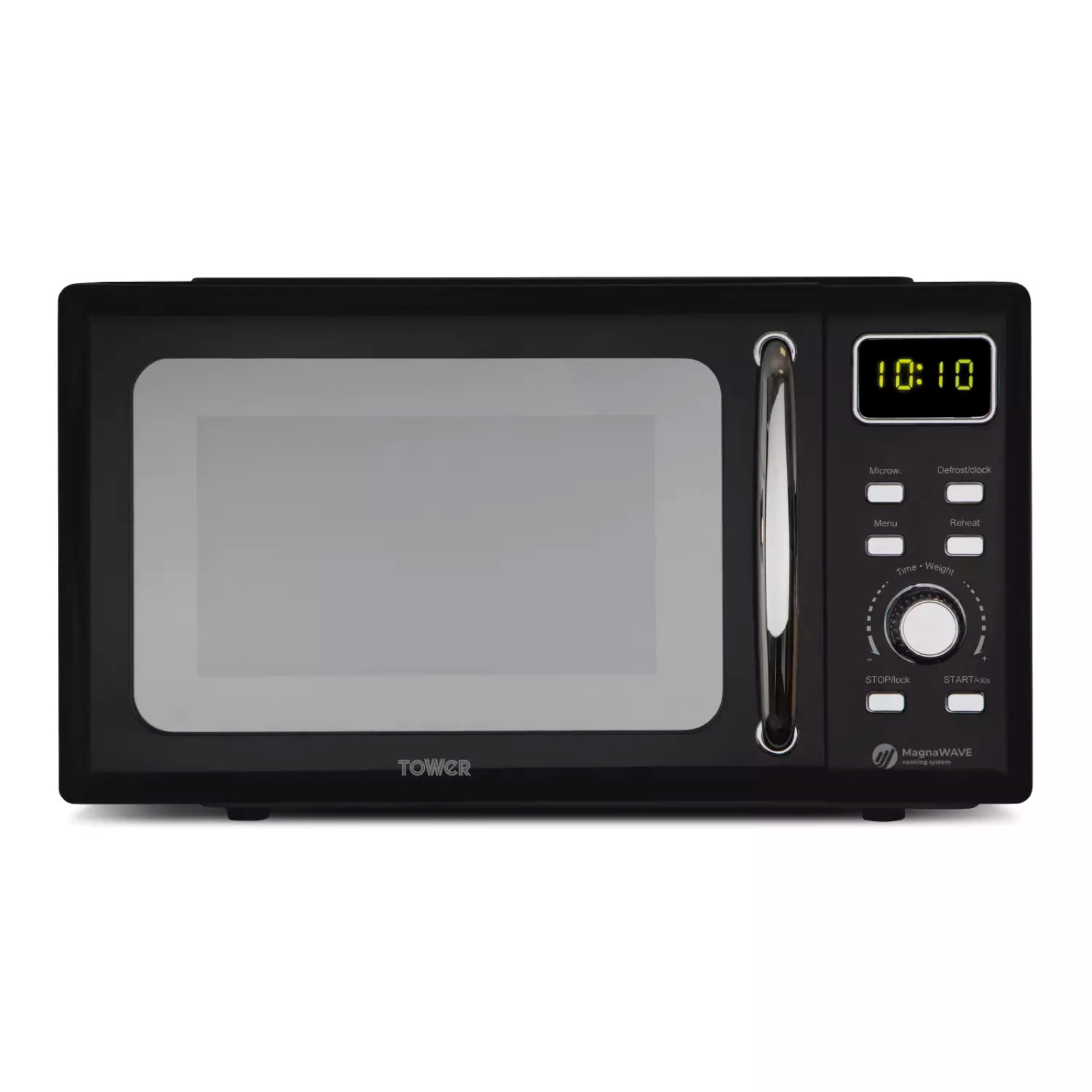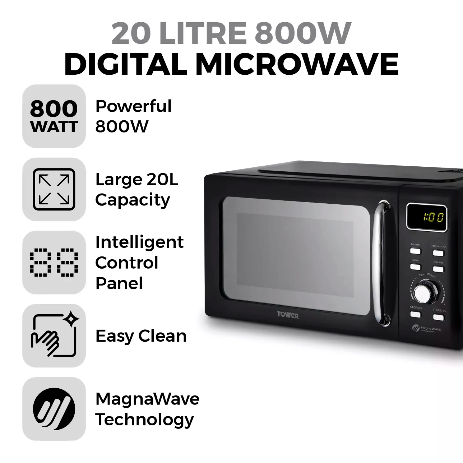 Cook up fuss-free everyday meals for the whole family with the 20L Digital Microwave from Tower. Powered by Magna Wave technology, concentrated waves circulate to ensure heat is distributed evenly for a well cooked meal – keeping intense flavours for amazing results with every use. This microwave features a powerful 800W output for faster cooking and heating, with 5 heat settings that can be adjusted to suit your needs. The huge inner 20 litre capacity can easily fit a standard 10” dinner plate, giving you versatility to use large dishes to cook for the whole family. Its 60-minute timer provides enough time to cook your meals with complete precision so they’re ready to serve, whilst the defrost function cooks meals from frozen in minutes – ideal for leftovers or a speedy emergency snack. 8 cooking pre-sets let you add variety to meal times with choices including potato, pasta, pizza, popcorn, vegetable, beverage, meat & fish. The intelligent control panel features large buttons and dial control to use the pre-set functions, defrost settings & manual selections, with a stay cool ergonomic handle for easy open and closing. A high quality glass turntable ensures your food is cooked thoroughly with delicious results, while its sleek mirror door looks great in modern kitchens. The easy to clean interior requires a simple wipe clean after use, to keep your cooking space hygienic and free of any leftover food.