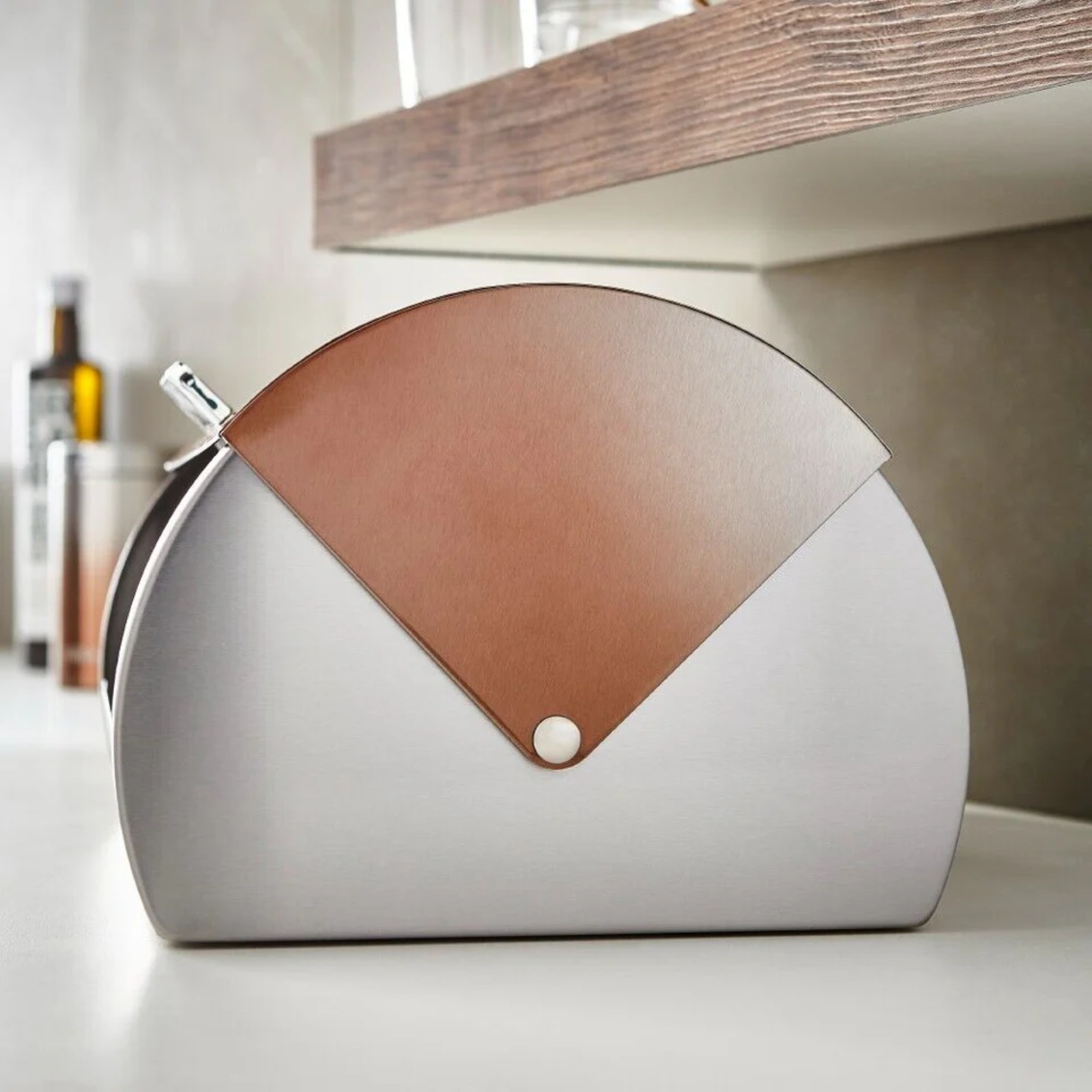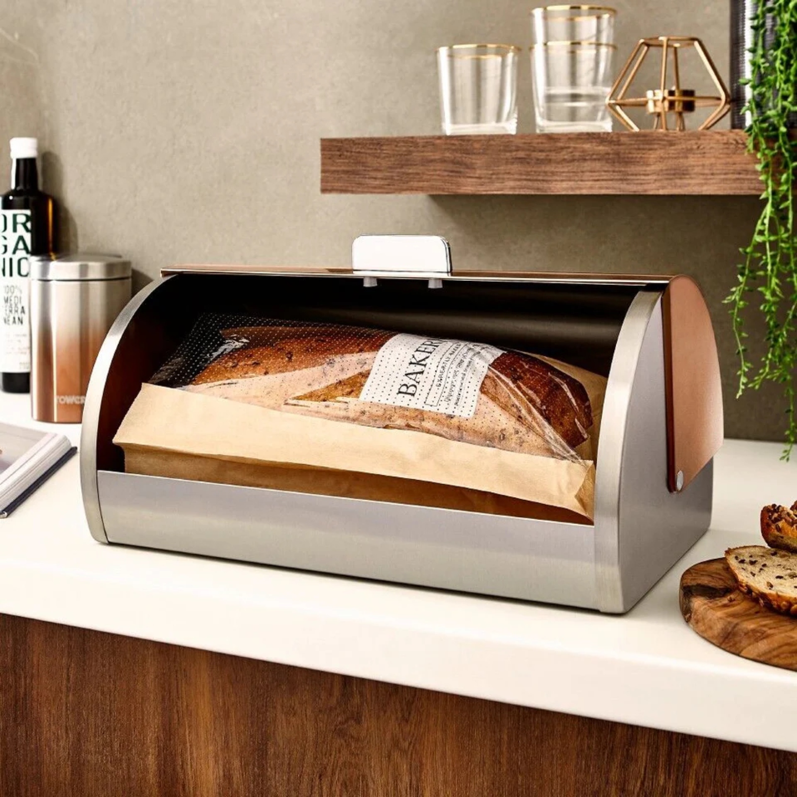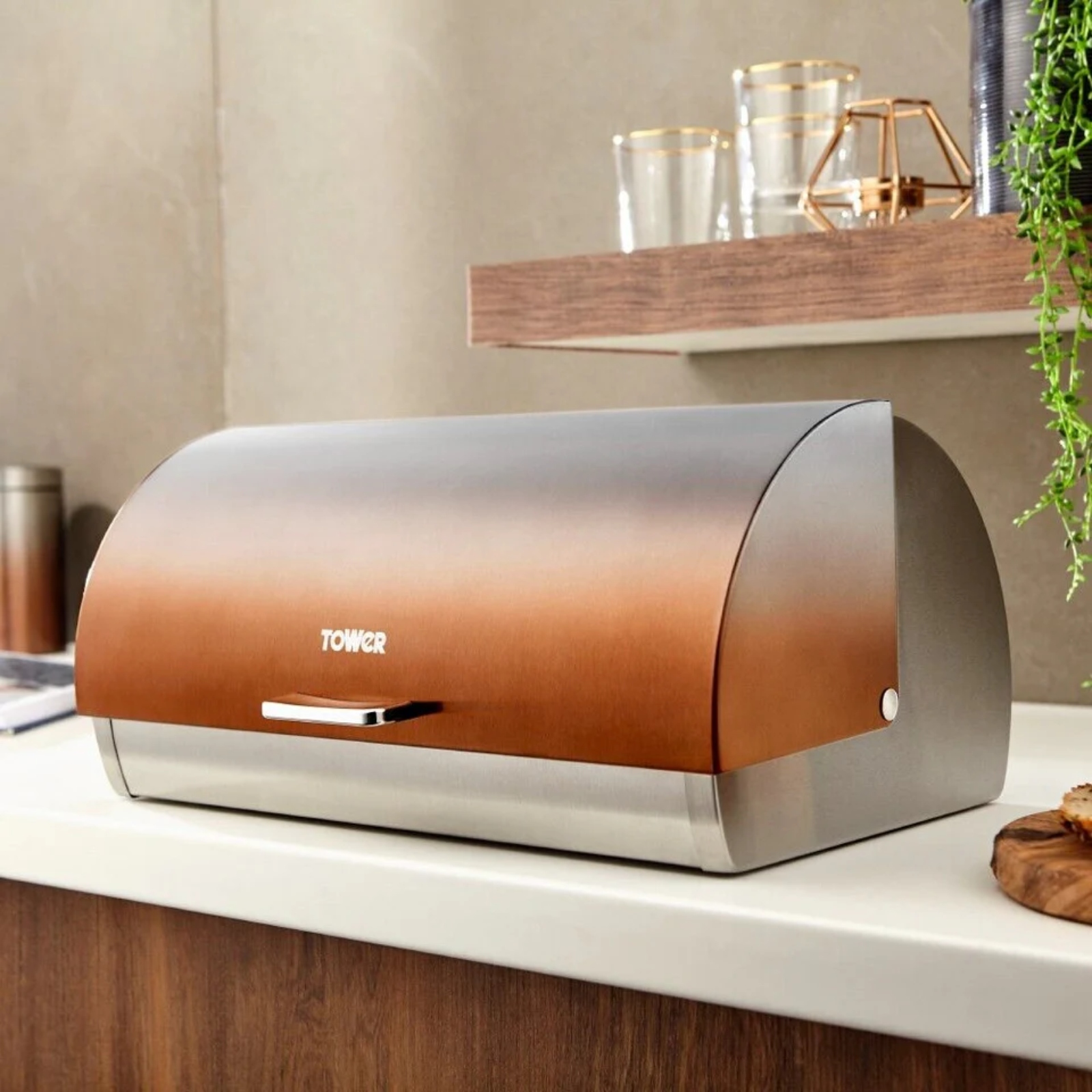 Store your fresh baked goods in style with the Tower Infinity Ombre bread bin. Its stainless steel body is coated with metallic copper shading to bring added dimension to your kitchen. The roll top bread bin features a large inner capacity, providing plenty of storage space to easily fit in your loaves, bagels, muffins and more. Its innovative ventilation design helps keep the contents fresh for longer, while the roll top lid provides easy access to your stored baked goods. The Ombre bread bin is built from durable metal, making it easy to clean by wiping it down with a damp cloth to maintain its polished look.