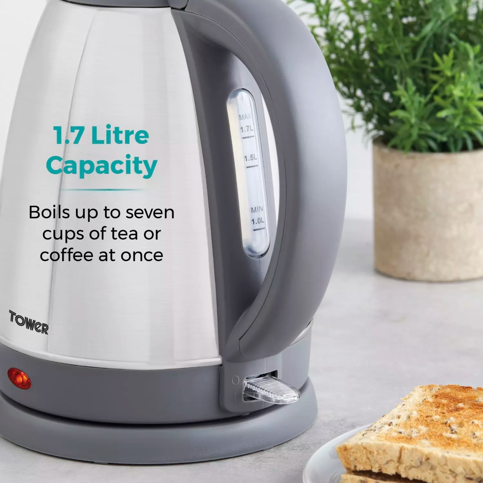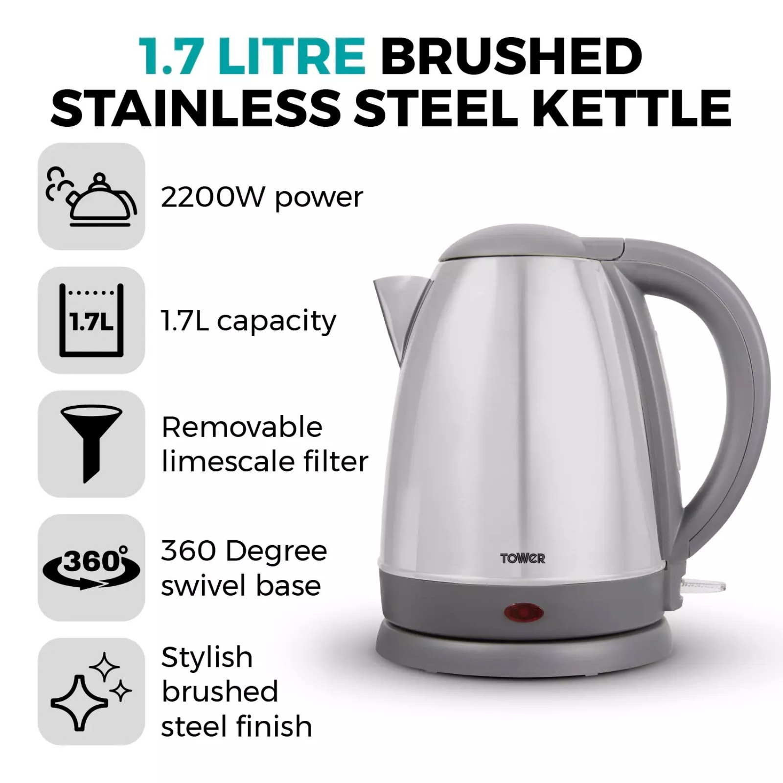 The Tower PT10072P Presto 1.7L Polished Stainless Steel Kettle is a 2200W electric kettle designed for quick, efficient boiling, capable of preparing up to 7-8 cups from a single fill. It features a contemporary, durable stainless steel finish, a 360-degree base for left and right-handed use, and a hinged lid for easy, one-handed operation.