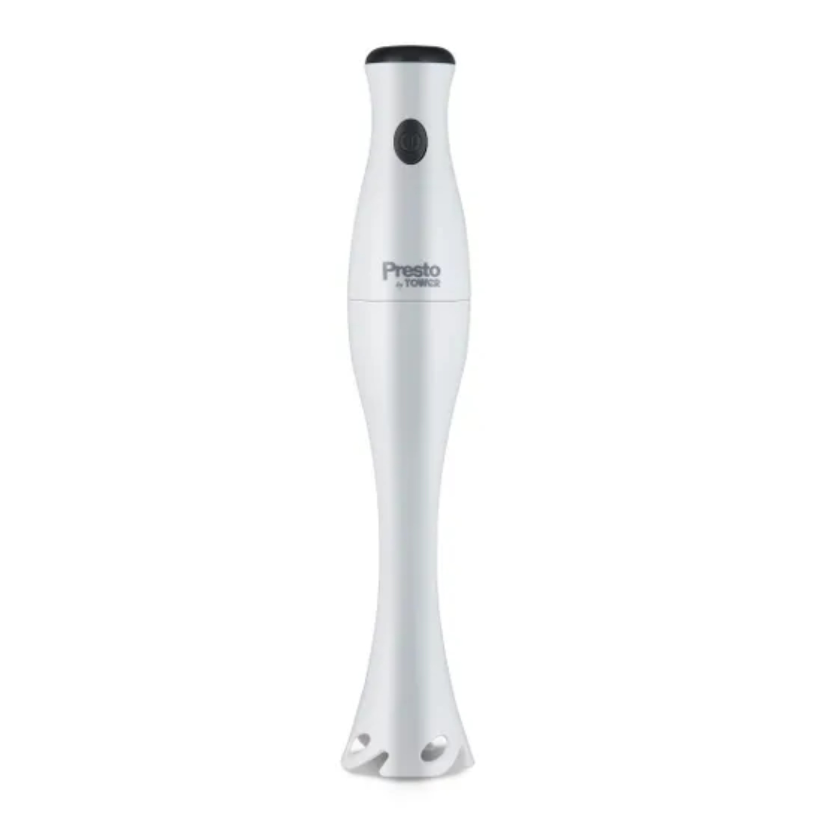 Create easy delicious soups, sauces, dips and many more with the Tower PT12044WHT Presto 250W Hand Blender. The hand blender features high–performance stainless steel blades, perfect for handling a wide range of fruits and vegetables. Simple one touch and one–speed operation, allowing you to make quick and easy meals and drinks with a press of a button. The ergonomic design has a locking mechanism ensuring you get a comfortable grip of the hand blender every blend. Clean with ease after every use, by putting the hand blender under the tap for a quick rinse. The Tower PT12044WHT Presto 250W Hand Blender also comes with a handy hanging loop for easy storing in a cupboard or on a kitchen utensil rack.
