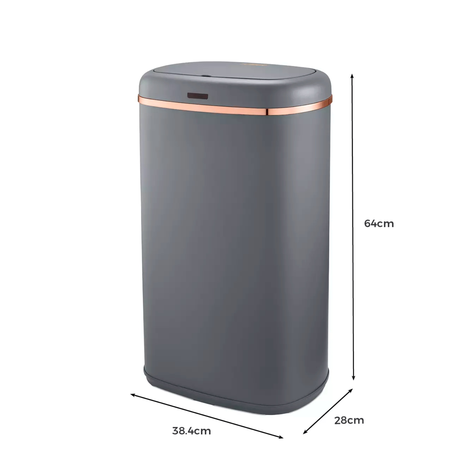 Featuring touch-free opening, this Tower Cavaletto 58L Sensor Bin finished in grey with rose gold accents, lets you dispose of household waste hygienically with one swift hand motion. The lid will automatically close after 5 seconds of inactivity, locking in any unwanted odours! There’s also an on/off button which puts the bin into manual mode. Made from robust stainless steel with a non-corrosive colour coating, this large capacity senor bin easily meets your everyday needs. A bin liner retainer ring will keep the liner in position, reducing mess and making it easier to swap liners over.