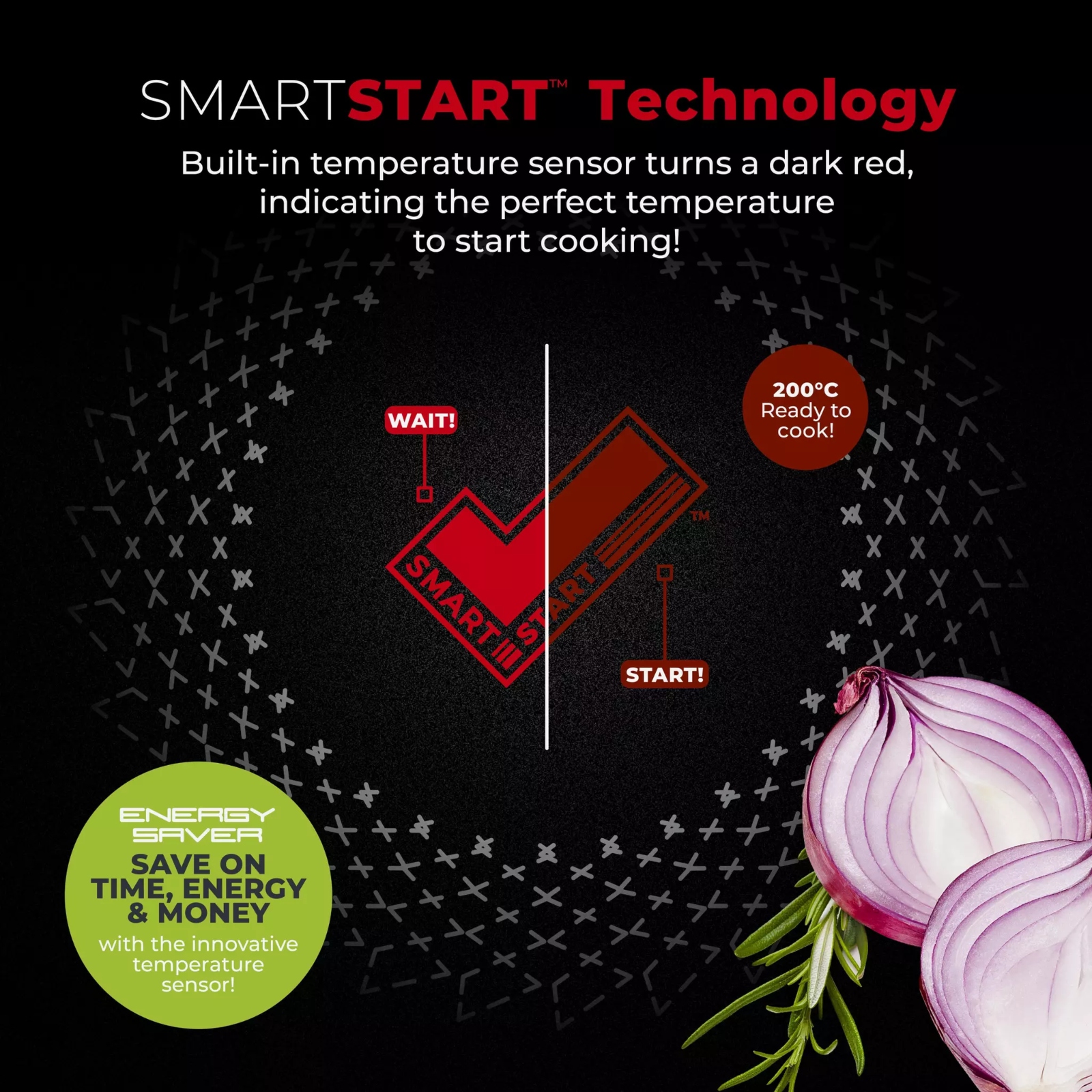 Presenting the innovative SmartStart technology, the 4.5mm forged aluminium multi-pan enables you to start cooking like a Pro. Perfectly cook a juicy steak by keeping an eye on the indicator tick in the middle of the pan. Presenting the innovative SmartStart technology, the 4.5mm forged aluminium multi-pan enables you to start cooking like a Pro. Perfectly cook a juicy steak by keeping an eye on the indicator tick in the middle of the pan. When it changes to dark red, the optimum temperature of 200 degrees Celsius has been reached, so it is ready for you to add your ingredients. The 6 layer non-stick Aeroglide Ultra interior coating is 15x stronger than standard non-stick coatings.