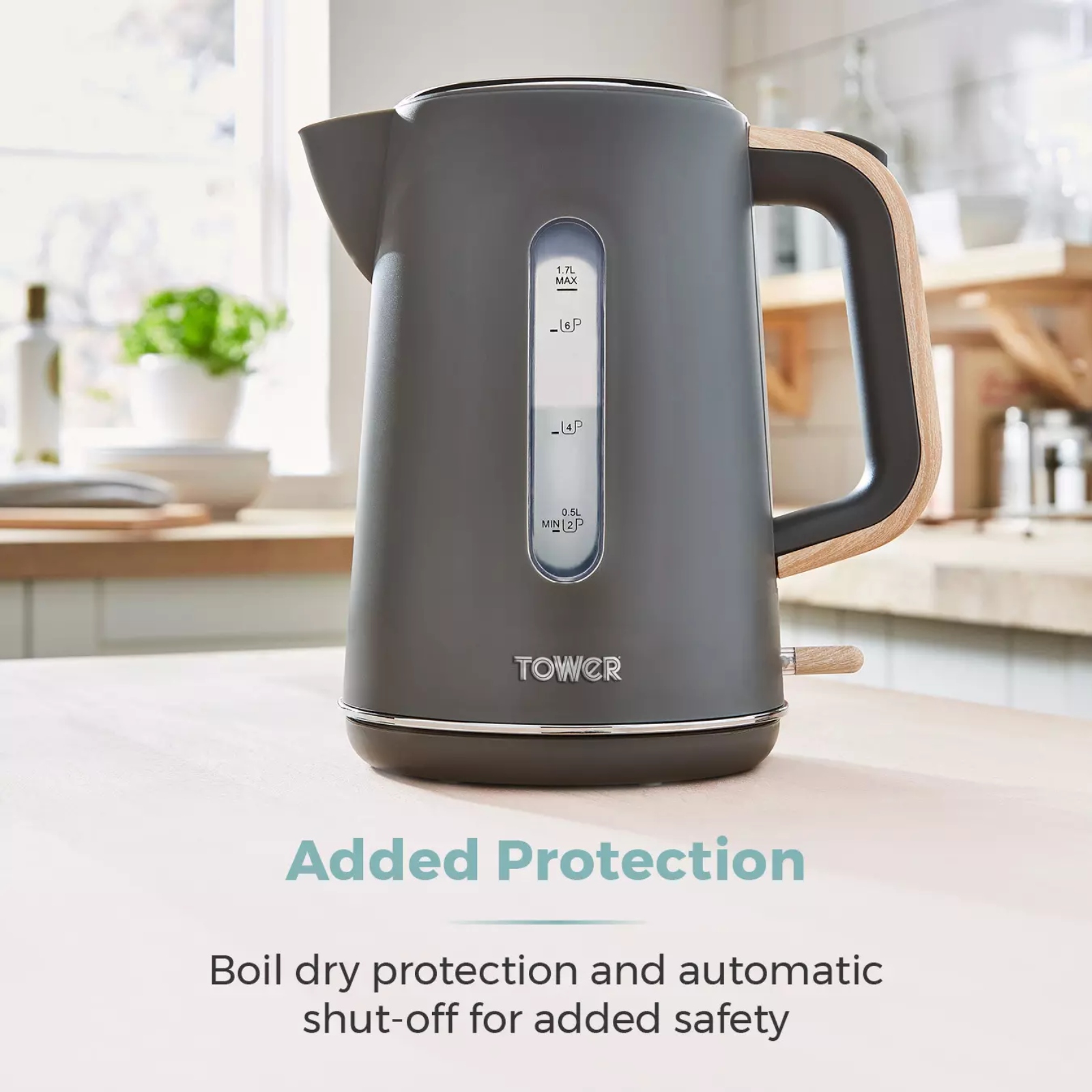 Enjoy a nice hot drink with this 1.7 litre kettle. The black and wood effect is inspired by Scandinavian design, which uses neutral colours that has the ability to match with any kitchen dcor. With its 1.7 litre capacity and rapid boil you can make up to 7 hot drinks from a single fill in a matter of minutes, making it perfect for friends and family gatherings. It also includes a 360 degree swivel base with integrated cord storage so your work surface can remain tidy. The addition of boil dry protection and auto switch off ensures added safety and reliability.