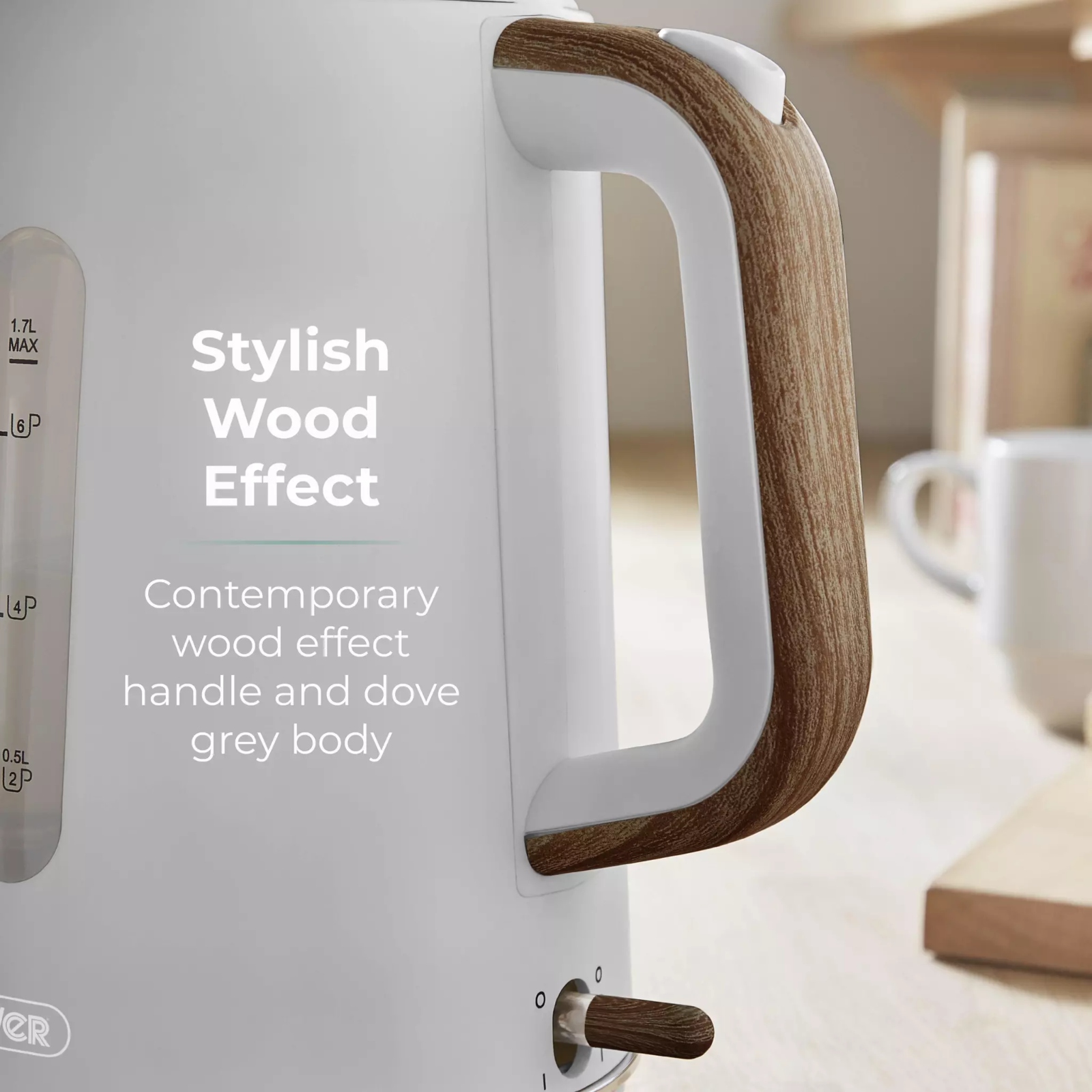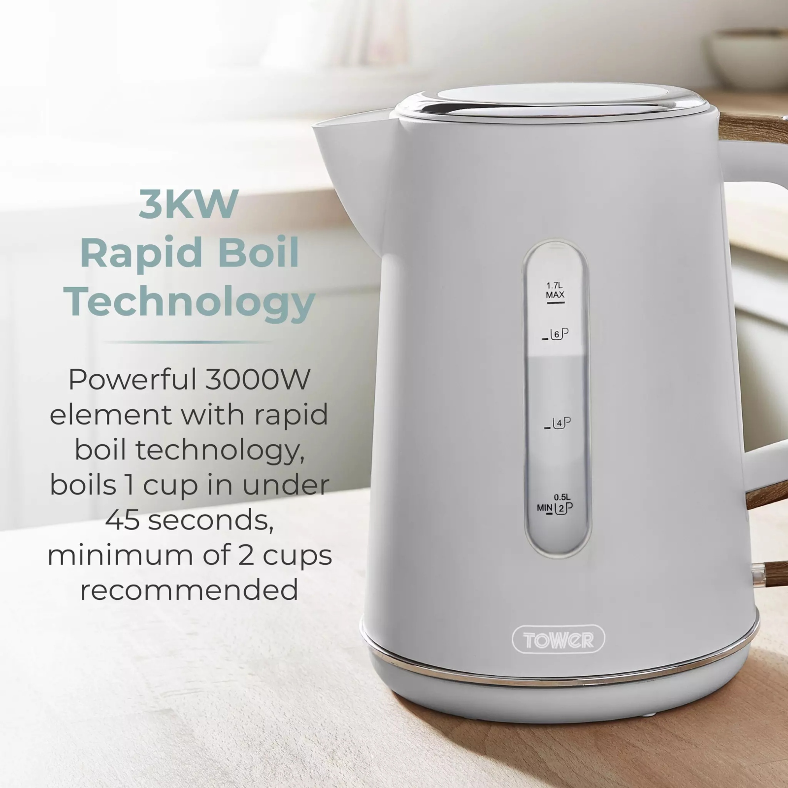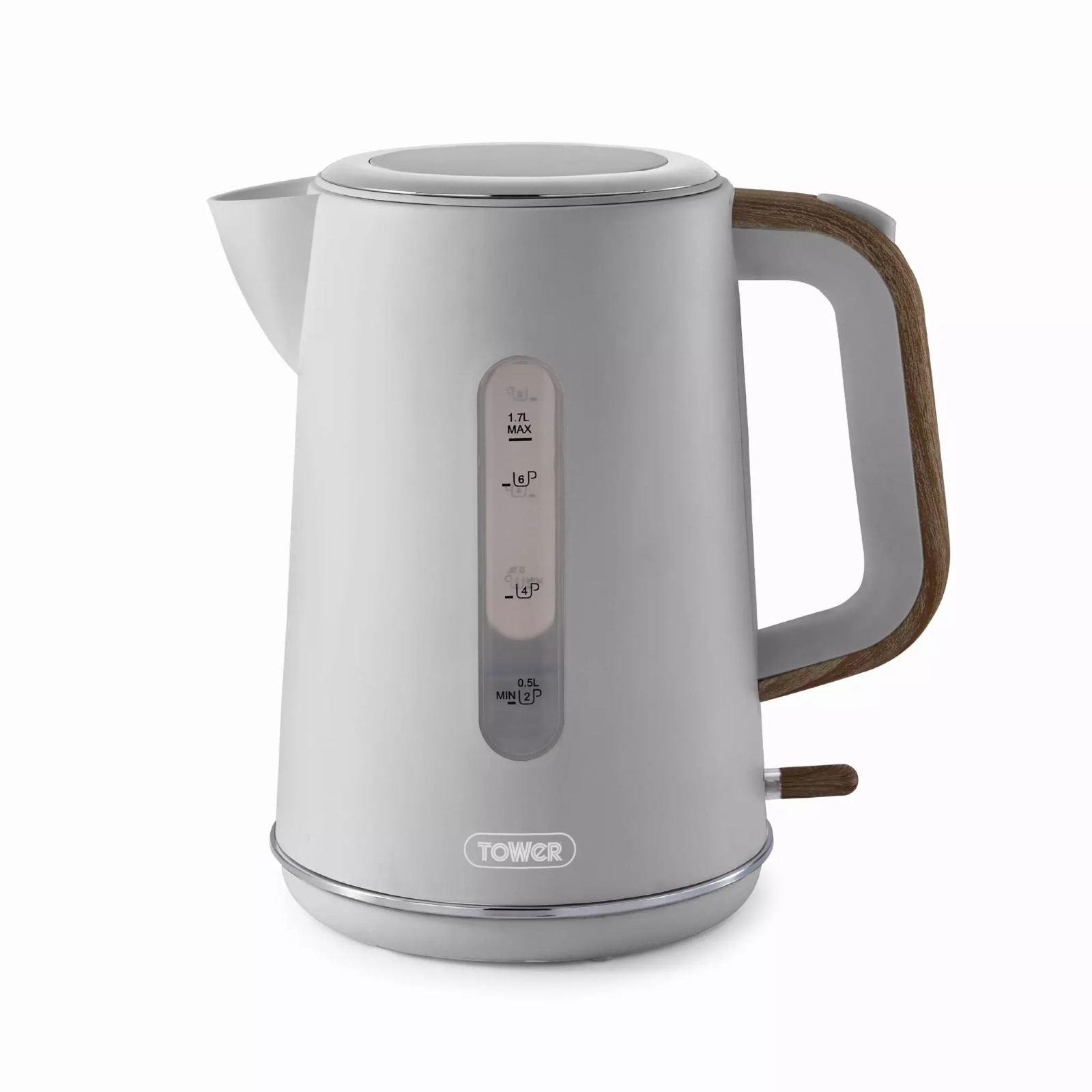 Enjoy a tasty brew with this Tower Scandi 3.kW cordless kettle. The 1.7L capacity lets you make up to 7 cups of tea or coffee from a single boil, perfect for playing host to family and friends. With rapid boil technology, the kettle boils in minutes so you can enjoy your beverage in no time. Featuring a design inspired by Scandinavian minimalism, this kettle has a neutral coating with wood effect accents, which fits perfectly in any kitchen décor. Includes a push button lid, making it easy to refill, while the integrated cord storage keeps your kitchen countertop looking tidy. Automatic shut-off and boil dry protection provides added safety once the kettle has boiled.