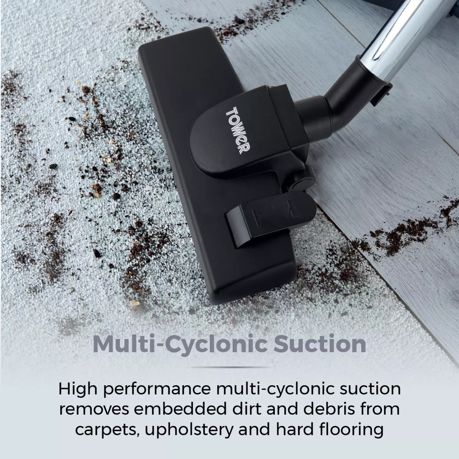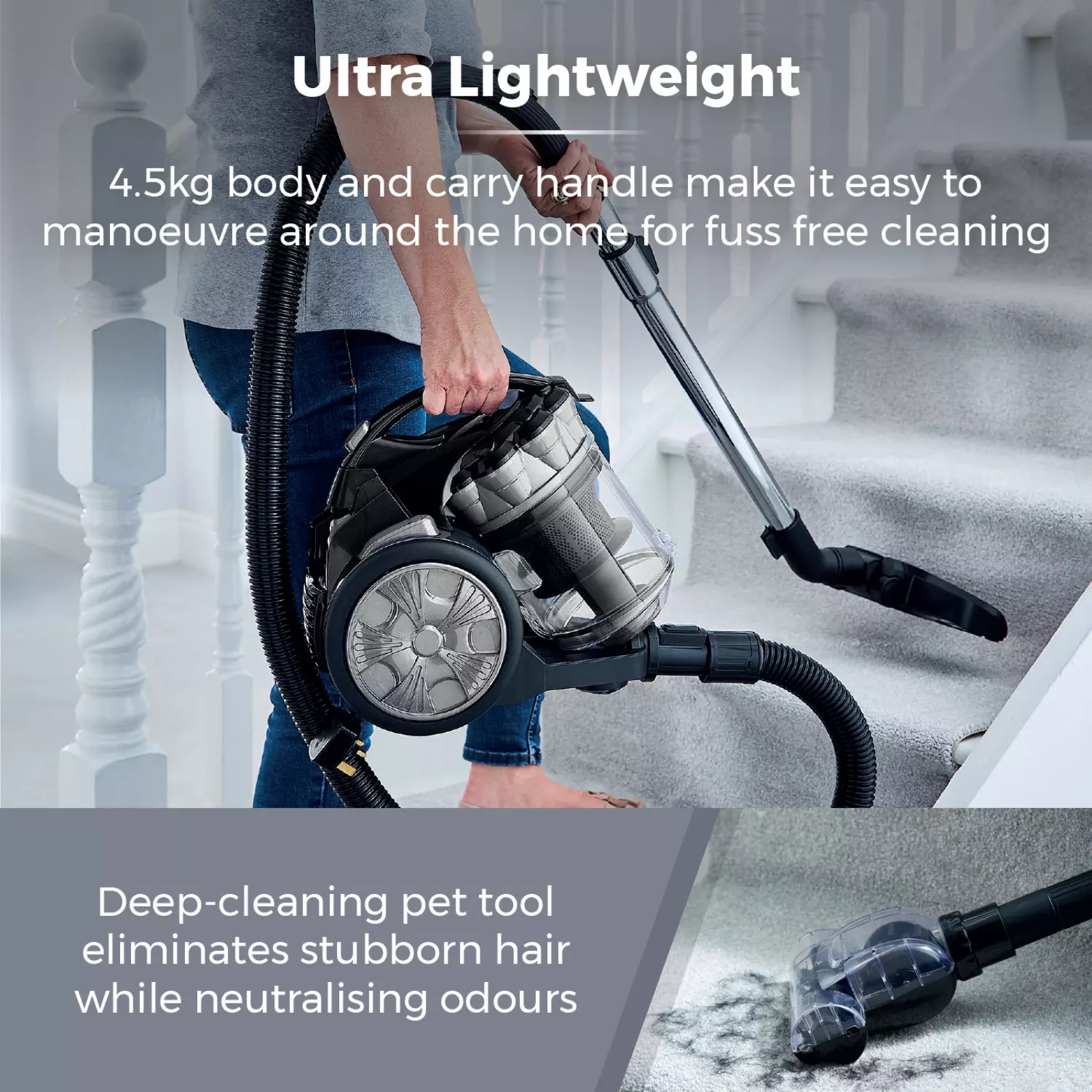 Packed with powerful suction and a high-performance motor, Tower’s bagless cylinder vacuum is engineered to remove embedded pet hair with ease. The vacuum cleaner utilises multi-cyclonic technology with optimised suction and enhanced filtration to effortlessly collect stray hairs and dust particles. A 2-in-1 crevice tool is included for vacuuming those hard-to-reach areas, while the pet tool is specifically designed to remove moulted fur from carpets and furniture. Its built-in HEPA filter eliminates allergens by containing dust, pet dander and pollen promoting a comfortable living environment. The motor is both strong and silent, operating at a low-decibel output to prevent any noise disturbance for family or neighbours. A 2-litre dust compartment provides a large capacity for collecting dirt and dust which can easily be disposed directly into the bin. The integrated carry handle provides hassle-free movement up and down stairs, complete with lengthy 5 metre cord to extend the vacuum’s reach.