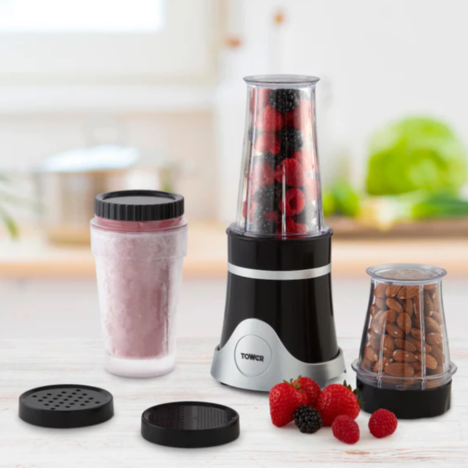 Perfectly blend whole host of ingredients from one compact table blender, featuring included attachments to maximise your blending capabilities. The robust stainless steel cutting blades provide an efficient chopping ability that makes quick work of your ingredients. The attachments include 500ml cup convenient for smoothies and shakes, 300ml cup for pastes and purees, 400ml freezer cup for your frozen creations and shake/steamer lids for taking your drinks and snacks with you. The ergonomic design provides comfortable grip during high powered blending, housed within compact design for easy handling and storing after use.