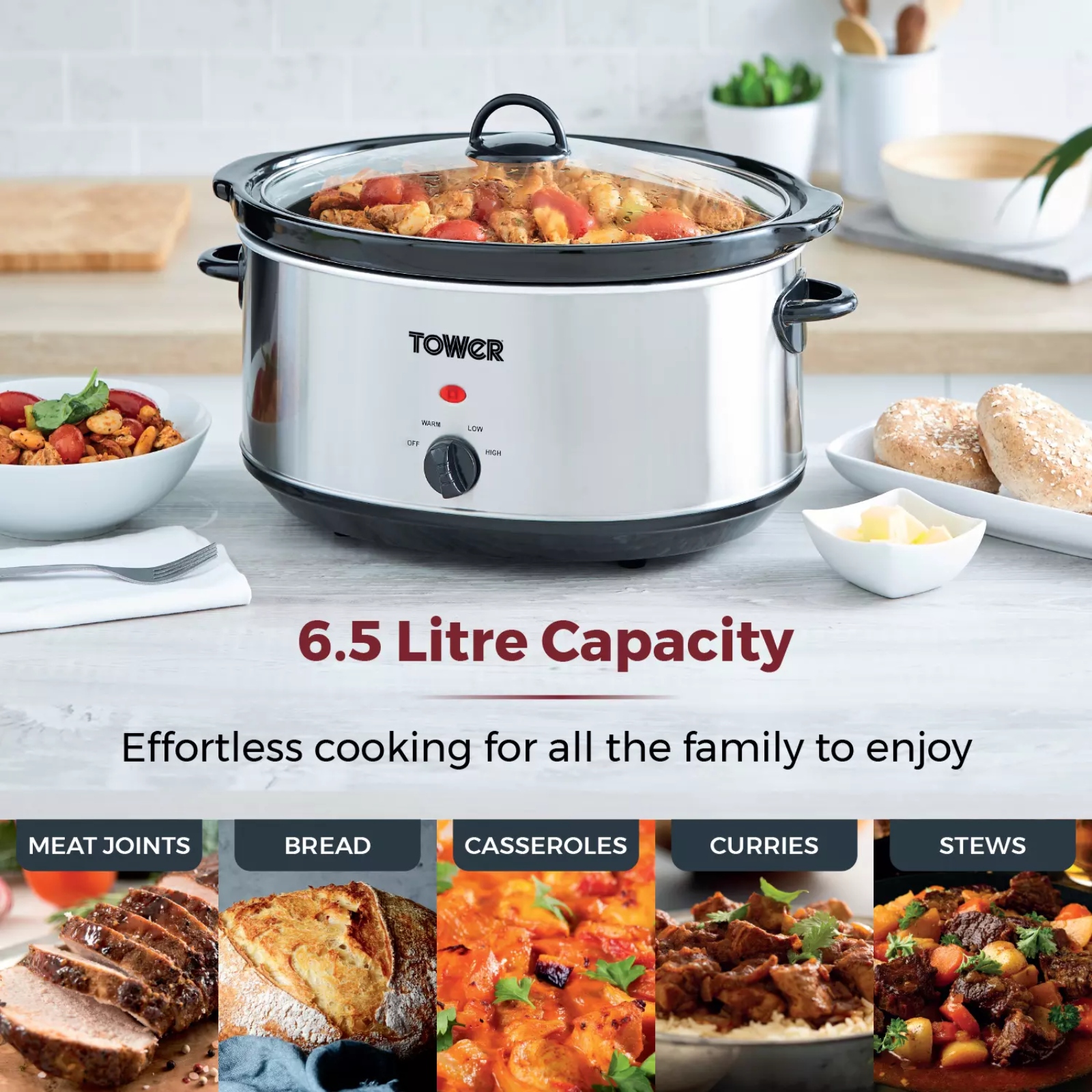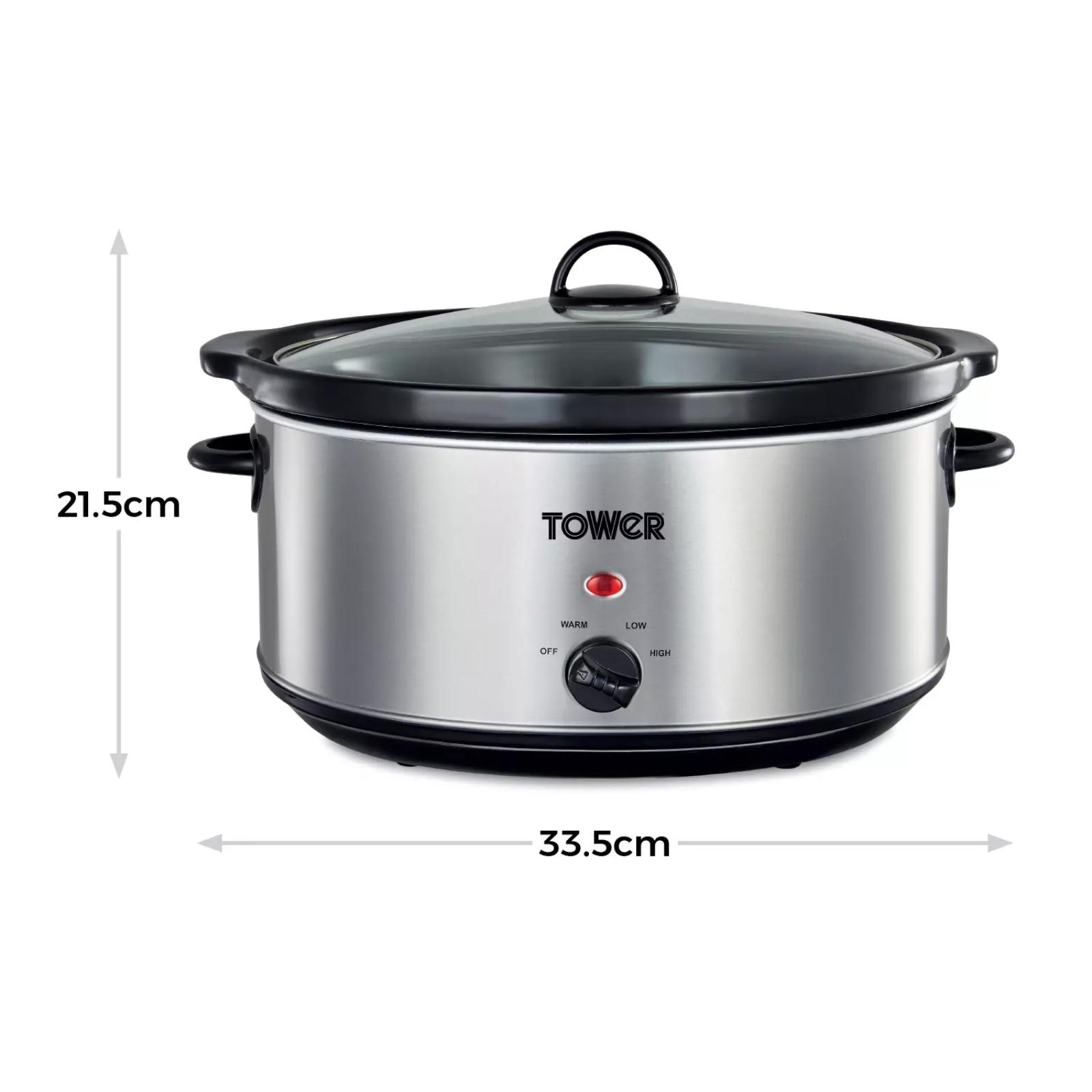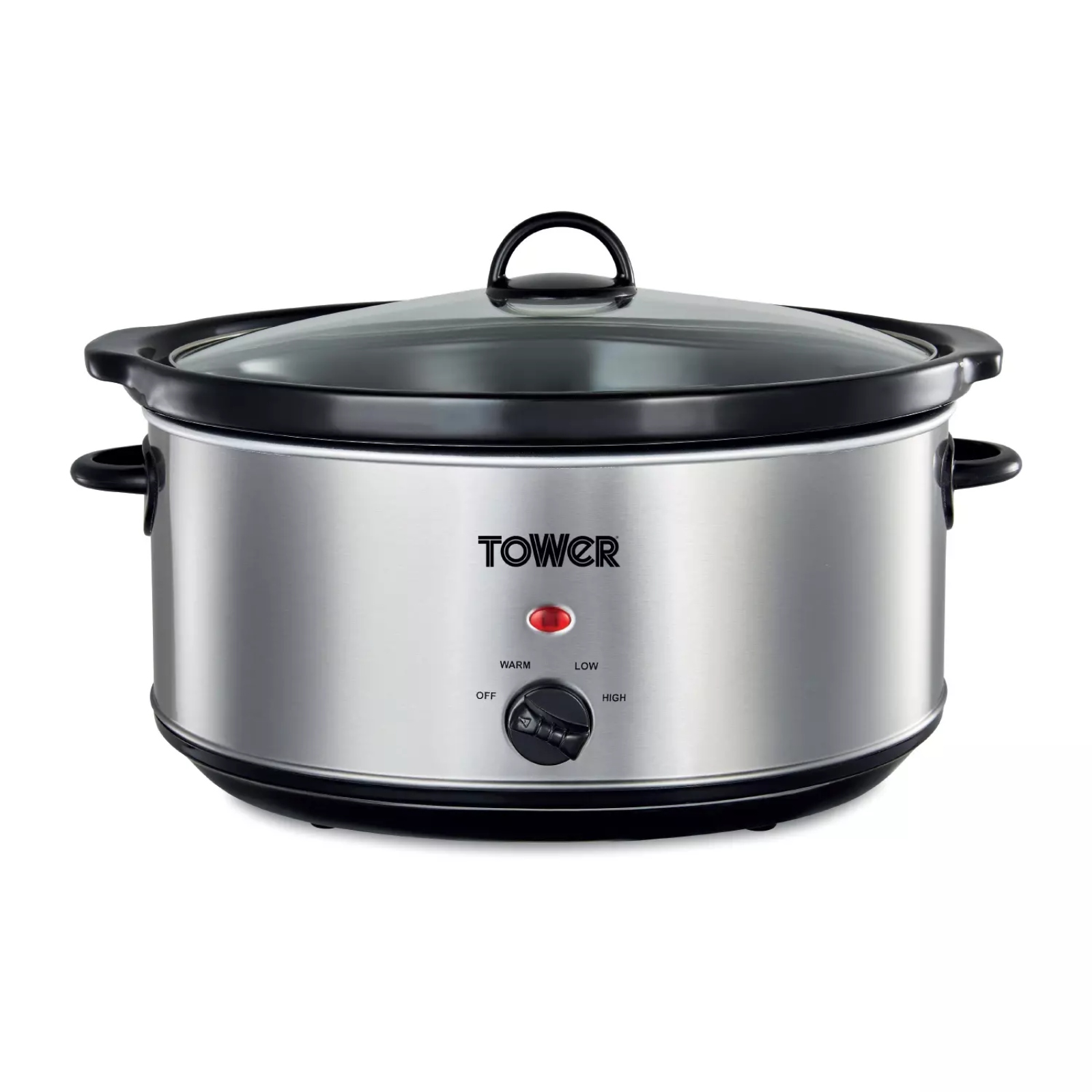 Presenting a one-stop pot for cooking all of your curries, soups and casseroles, this stainless steel Tower manual slow cooker makes preparing family meals hassle-free. With a large 6.5 litre oval cooking pot you have ample space to serve the family a delicious meal or even storing some away for a few days. The simple to control dial offers 3 heat options for cooking at low or high temperature as well as a keep warm function so your food is cooked throughout the day, ready for when you get home from work. Constructed using stainless steel, this slow cooker is highly durable and long-lasting, while the cool touch handles make for safe and comfortable handling. The toughened glass lid features a hinge lid design for easy opening and serving, while the removable inner cooking pot is dishwasher safe, making it easier to clean up after use.