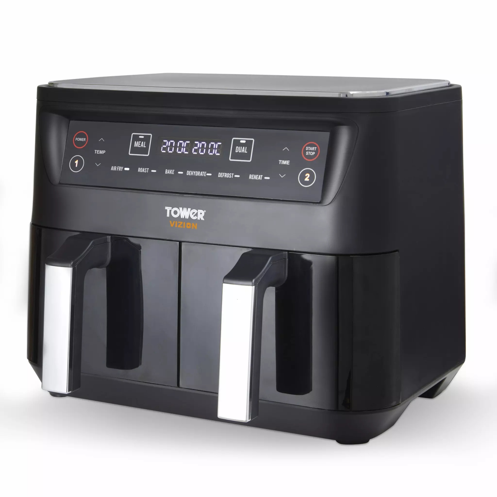 Exclusive to Tower Air Fryers, Vortx technology rapidly circulates hot air around food. Cooking up to 30% faster than a conventional oven and using 99% less oil, allowing you to save up to 70% on your energy. Two cooking baskets are better than one! Complete with two large 4L baskets, providing ultimate air frying versatility. The combined 8L capacity can feed the whole family at once. The Vizion Dual Basket Air Fryer has large viewing windows built into the front of each drawer.  Complete with cooking lights inside each basket you can keep a constant eye on progress without ever needing to open the drawers again. When cooking different foods with different cooking times in each basket, the Smart Meal function will do the thinking for you. At the touch of a button, Smart Meal will control cook times so that both baskets finish cooking at the same time.