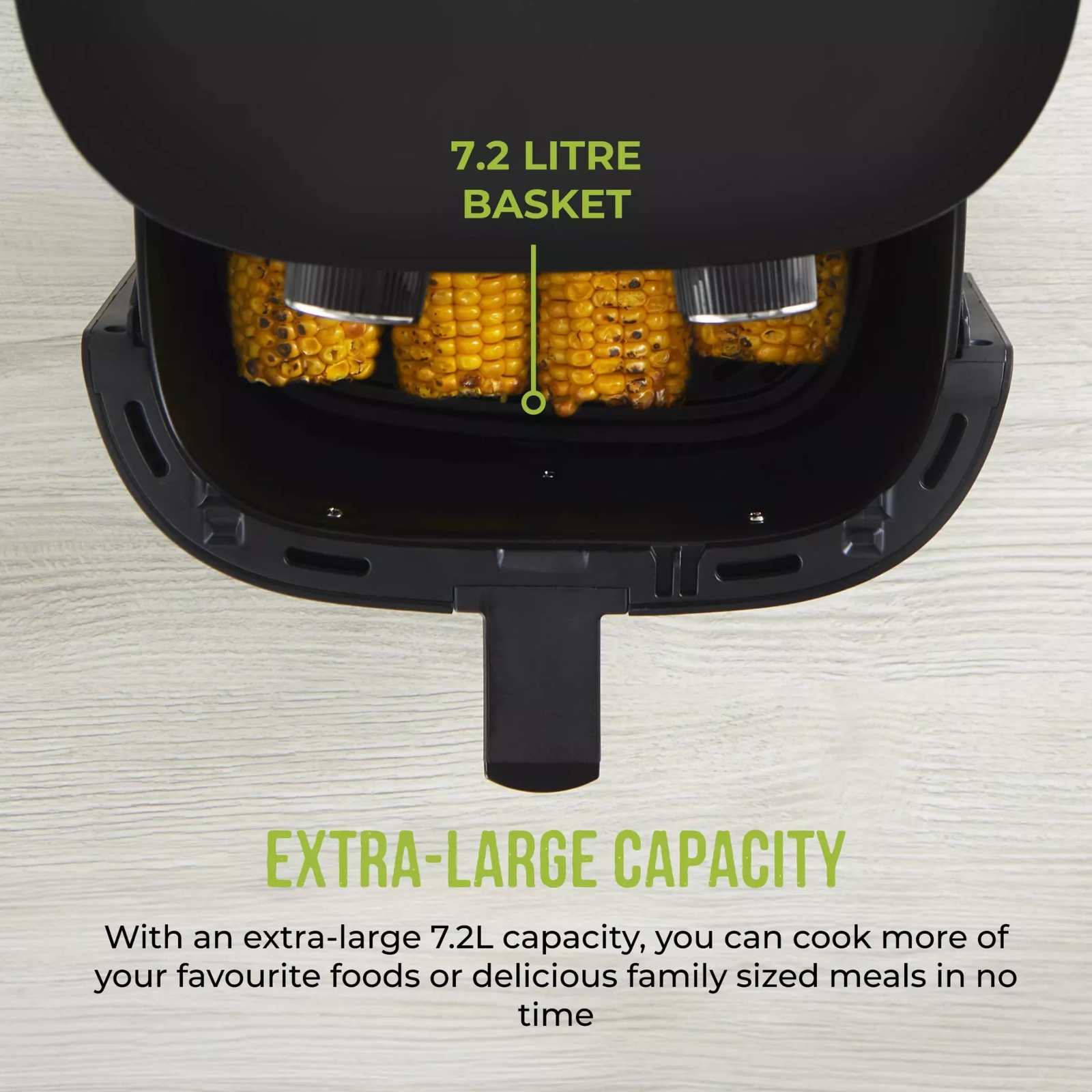 Featuring Vortx technology, food will cook 30% faster than in a conventional oven, for delicious crispy meals that requires little to no oil. Cook delicious, healthy meals for the whole family with this 7.2L Air Fryer from Tower. A large capacity basket lets you cook enough larger portions of the food you love, perfect for family mealtimes. The easy to use dials will let you set the temperature and 60-minute timer with ease, whilst special indicator lights will turn on and off to let you know when the optimum temperature has been reached. A non-stick removable grill plate allows for simple cleaning so cooking is fuss-free from start to finish, whilst non-slip silicone feet keep the air fryer secure on the worktop. The cable can be tucked under the appliance when not in use for easy storage.