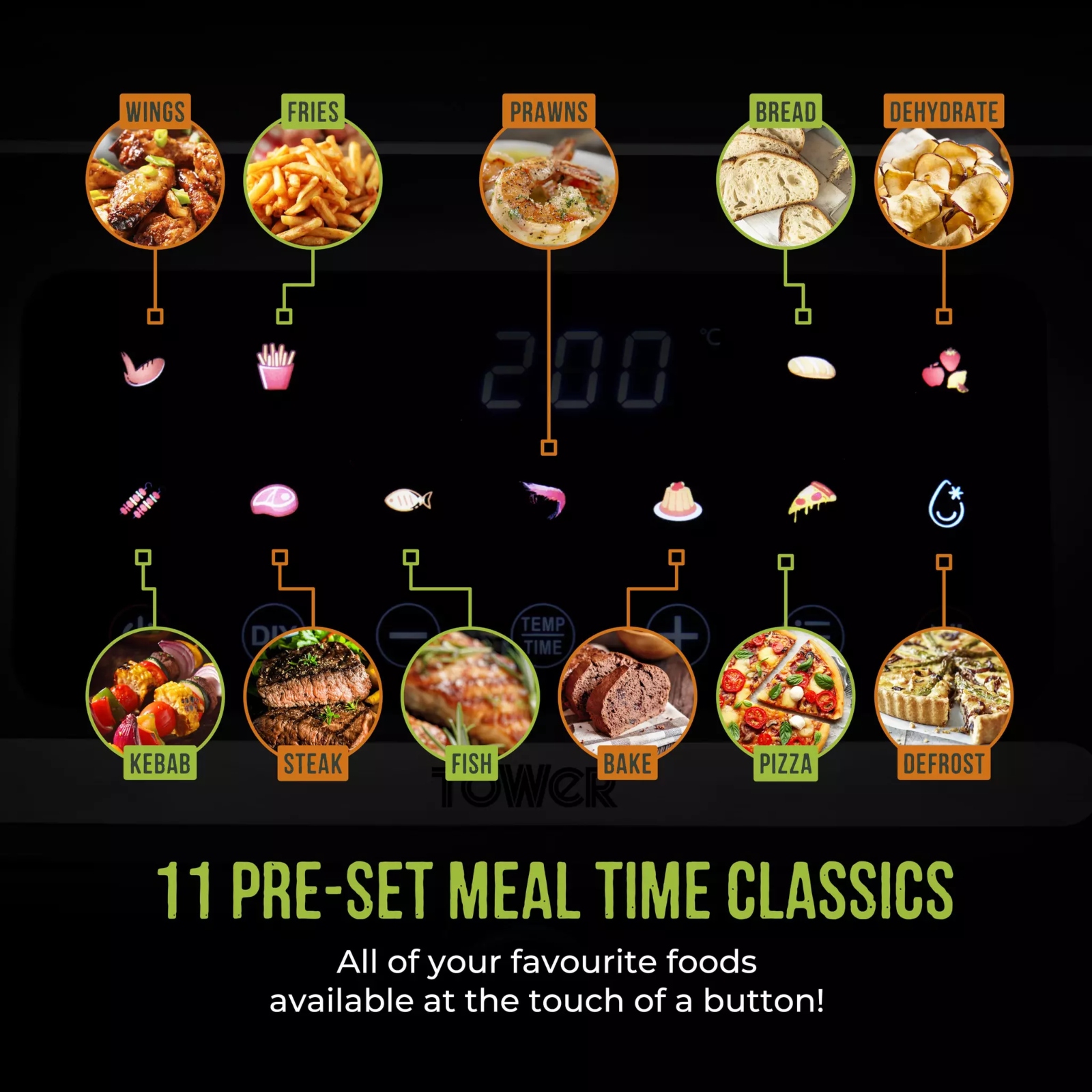 Enjoy seamless and fuss free cooking with this 5L Vortx Air Fryer with Digital Colour Display from Tower. Individually coloured icons will let you set the time, temperature and cycle between cooking pre-sets for a seamless cooking experience, whilst the 5L capacity will let you cook meals for the whole family to enjoy. Exclusive to Tower Air Fryers, Vortx technology rapidly circulates hot air around food. Cooking up to 30% faster than a conventional oven and using 99% less oil, allowing you to save up to 70% on your energy. Due to the smaller design, there is less packaging required, creating a more eco-friendly device without losing any cooking power. 11 one-touch cooking pre-sets take the guesswork out of cooking, whilst the manual DIY mode will let you experiment with unique recipes and tailor your recipes to suit different tastes. Non-slip feet keep the device safely and securely on the counter, whilst the 85cm power lead lets you put the fryer wherever you like on your countertop