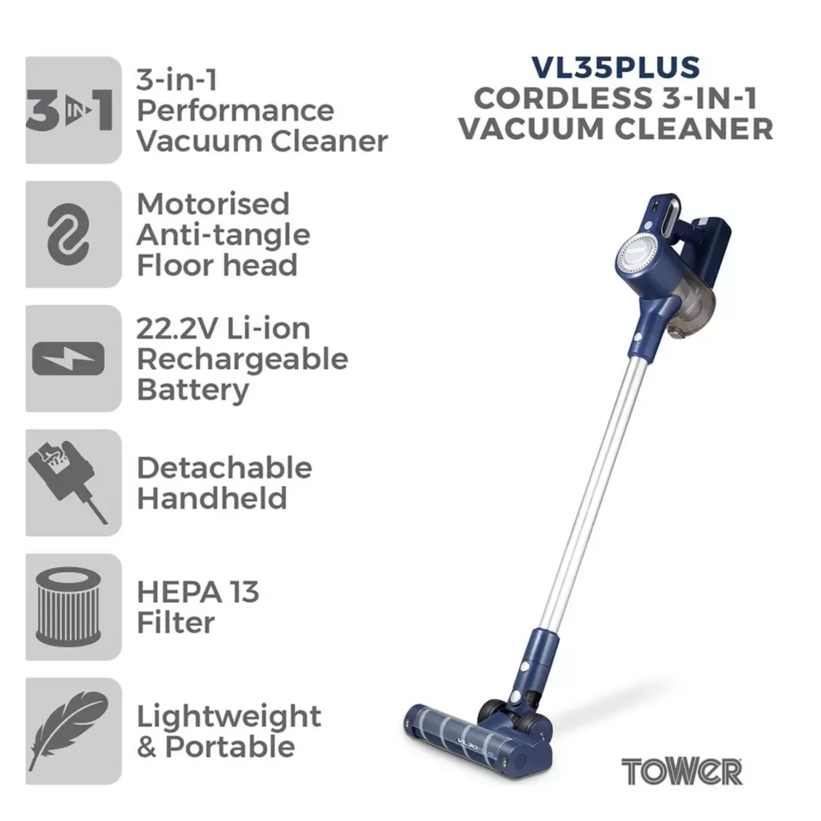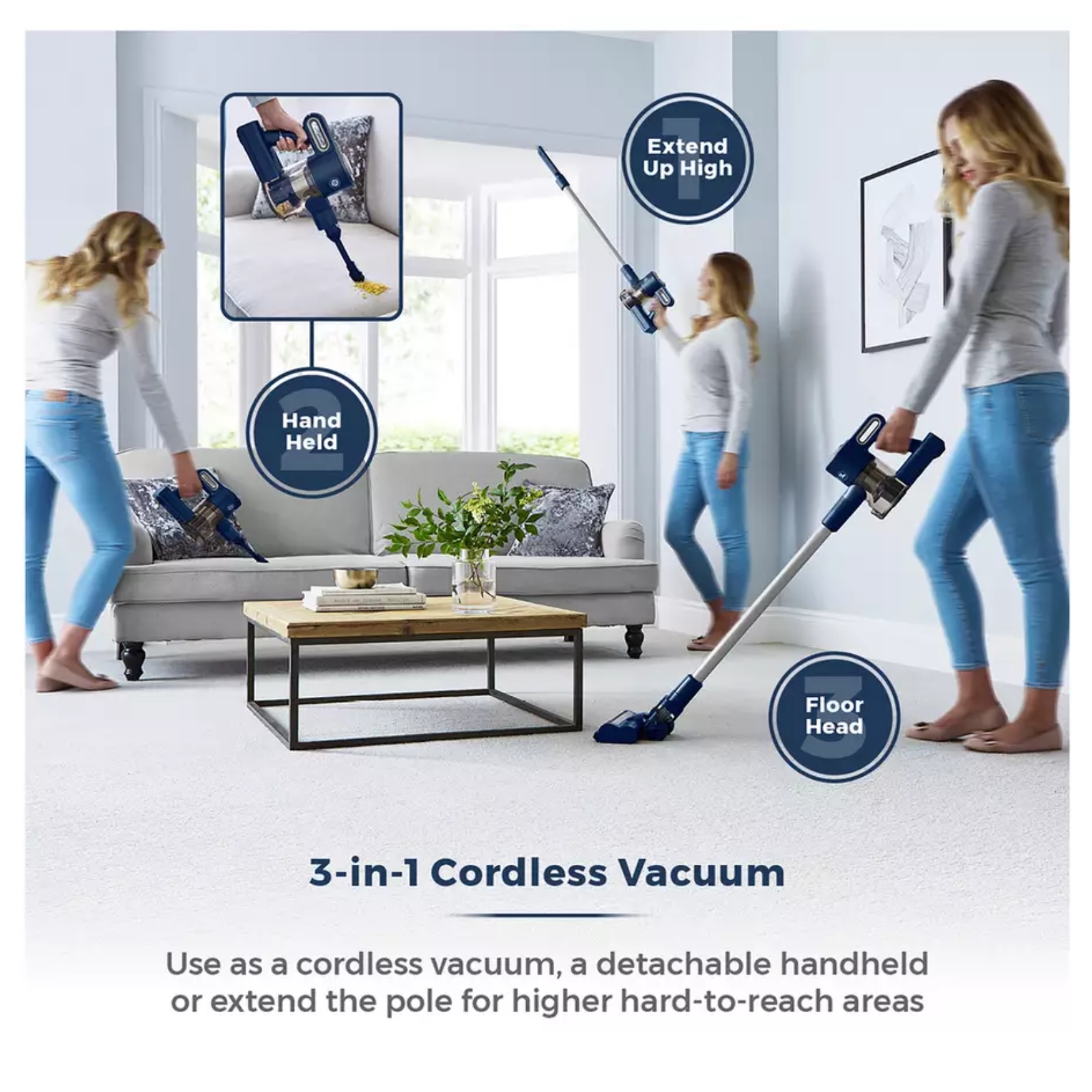 Introducing the VL35 Cordless 3-in-1 Pole Vacuum, a powerful and efficient cleaning tool for your home. Its rechargeable battery provides up to 35 minutes of run time, while the cyclonic suction easily breaks down dirt on all floor types. Use it as a cordless vacuum for floors, detachable handheld for cars and upholstery, or extend the pole for hard-to-reach areas.