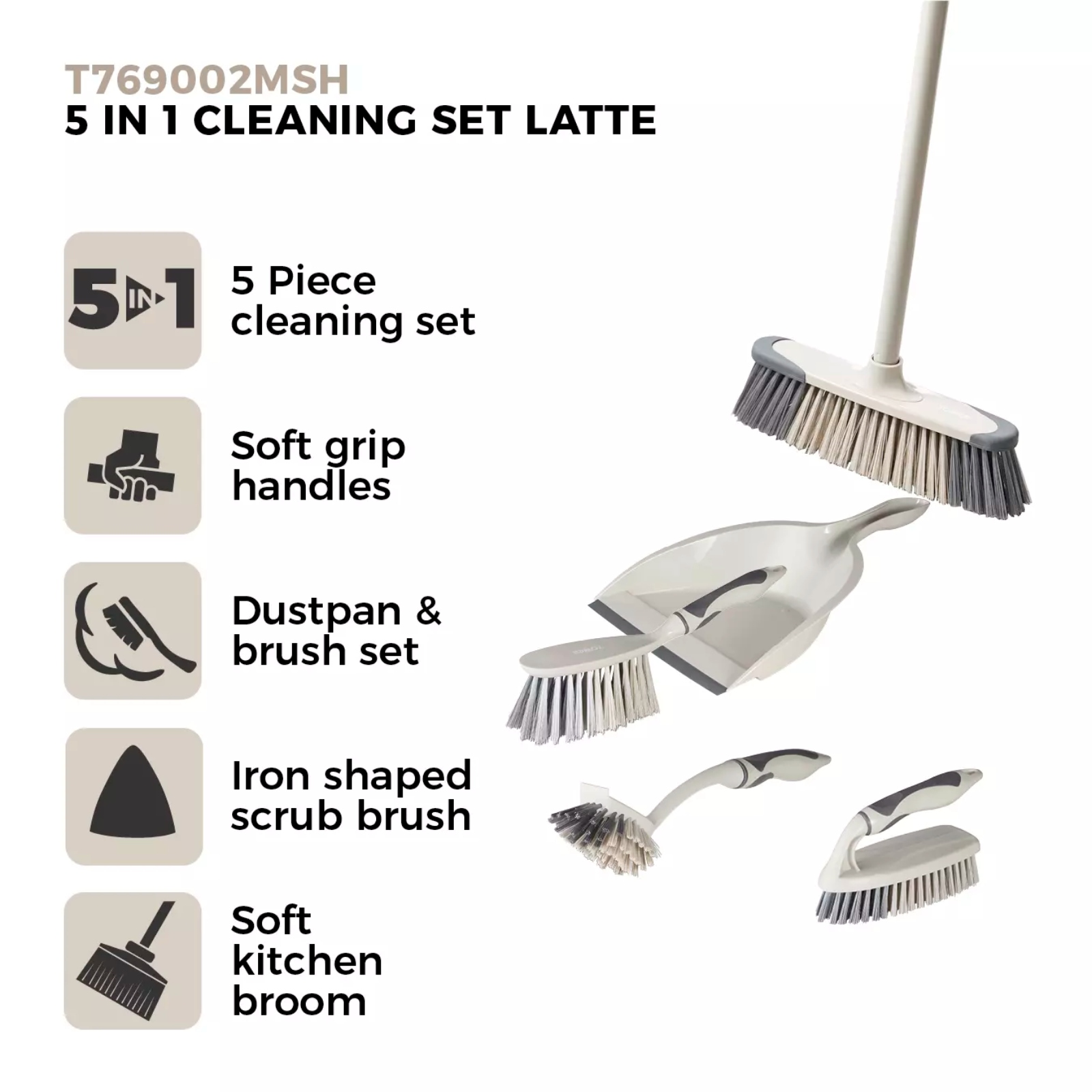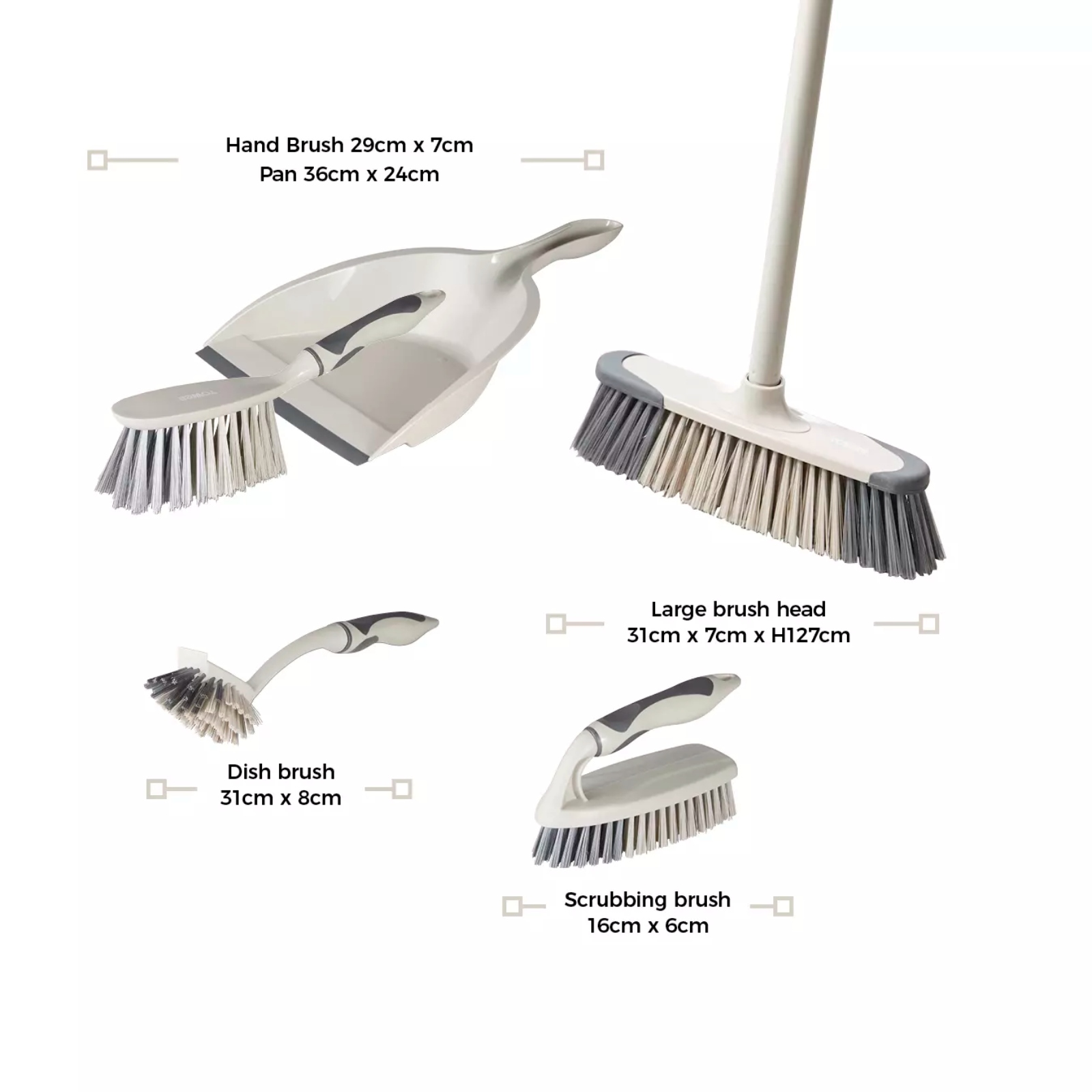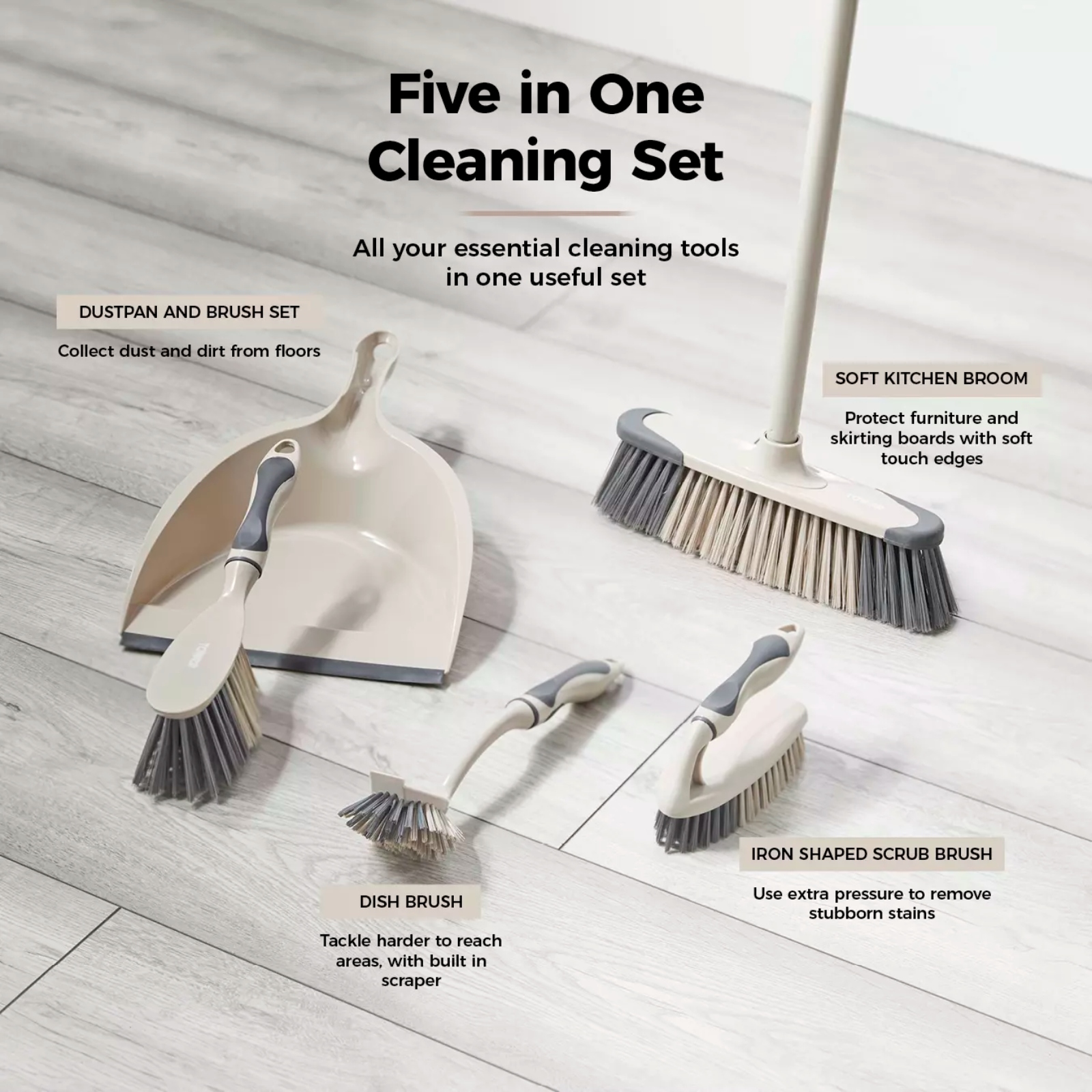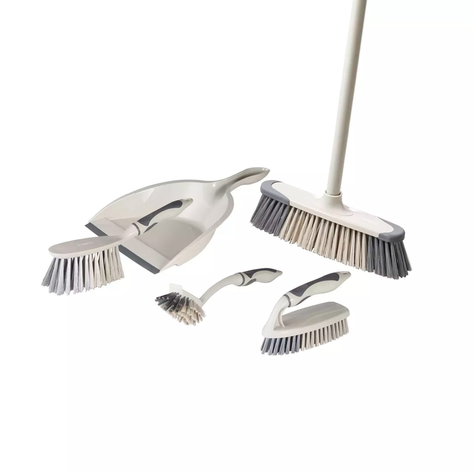 This Tower 5-in-1 brush set has all the tools you need for a thorough clean of your house. The set includes; a soft kitchen broom for brushing up without any risk of damage to the skirting boards and furniture; dust pan and brush for collecting dust and dirt particles off work surfaces; dish brush for harder to reach areas; and iron shape scrub brush to remove dried on stubborn stains easily. Each brush features an ergonomically designed soft touch handle for complete comfort and control, which is perfect for those longer cleaning sessions.