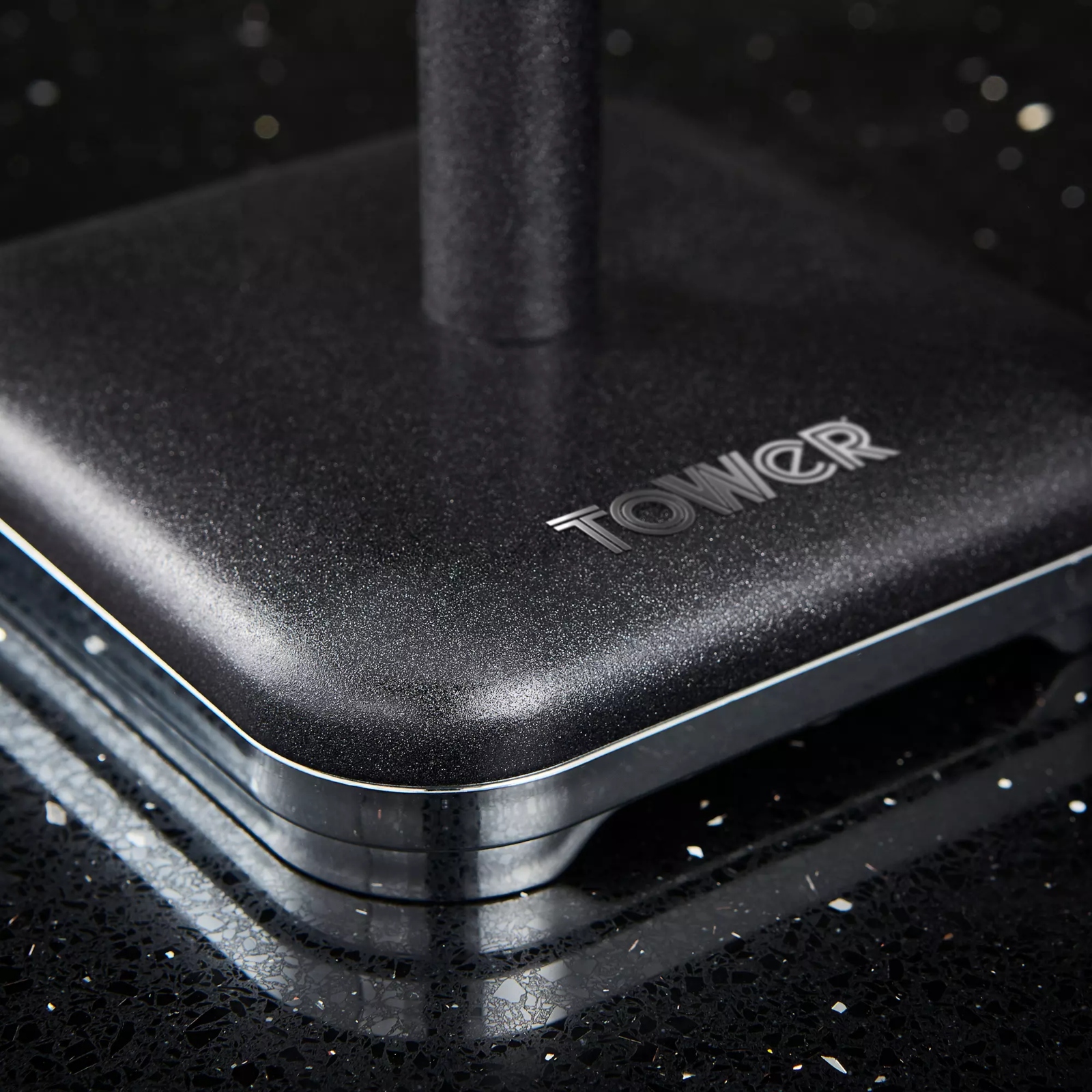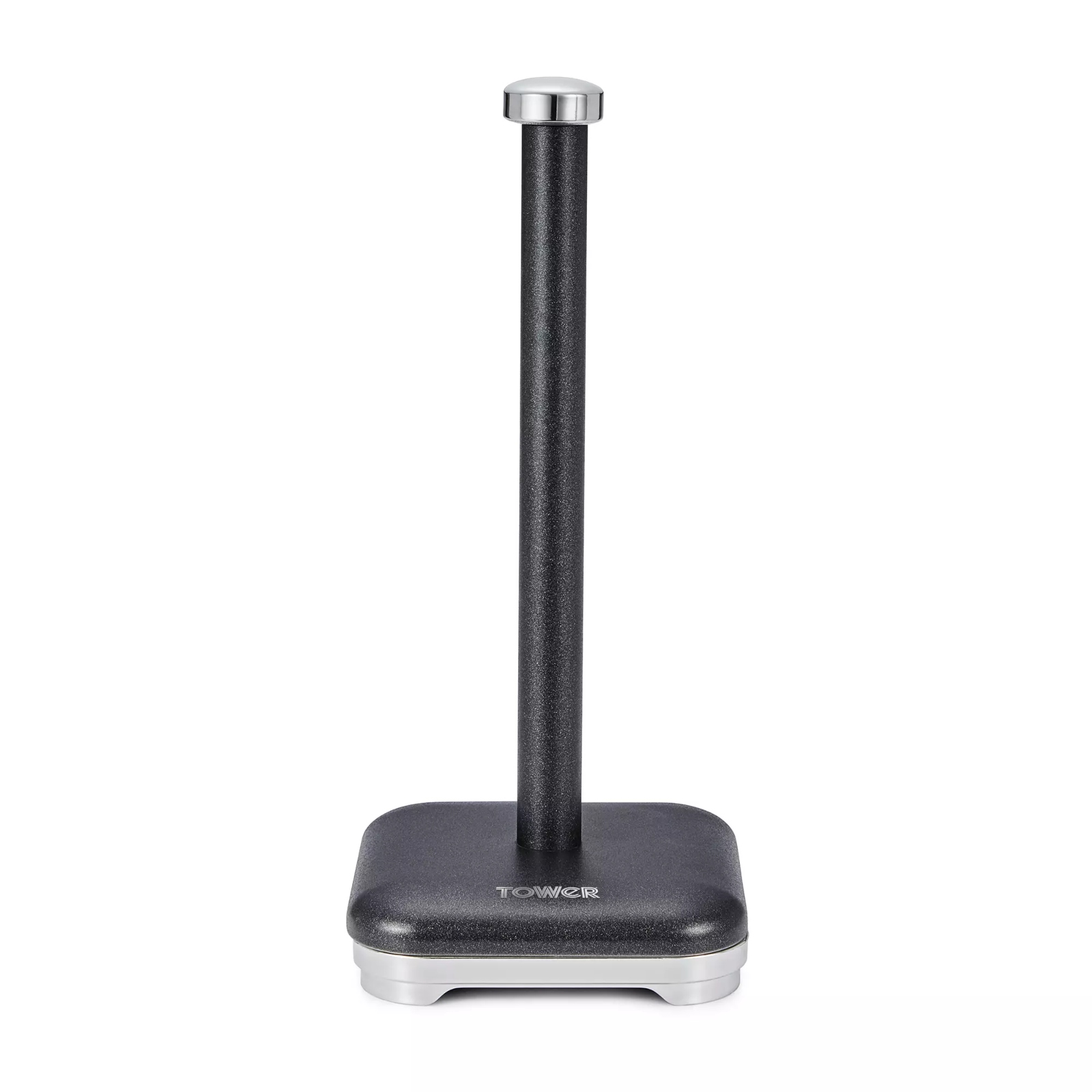 Secure your kitchen roll amongst the shimmer embellished design of this towel pole holder from Tower. Consisting of a stainless steel structured body and base, this towel pole features a black colour coated glitz finish to add a glistening feature to your kitchen. The towel pole design can accommodate all standard size kitchen rolls, securing your paper towels in place for easy retrieval when performing clean ups. The cap and base are coated in chrome plating, combining durability with a glamorous design that only requires a simple wipe clean for easy maintenance.