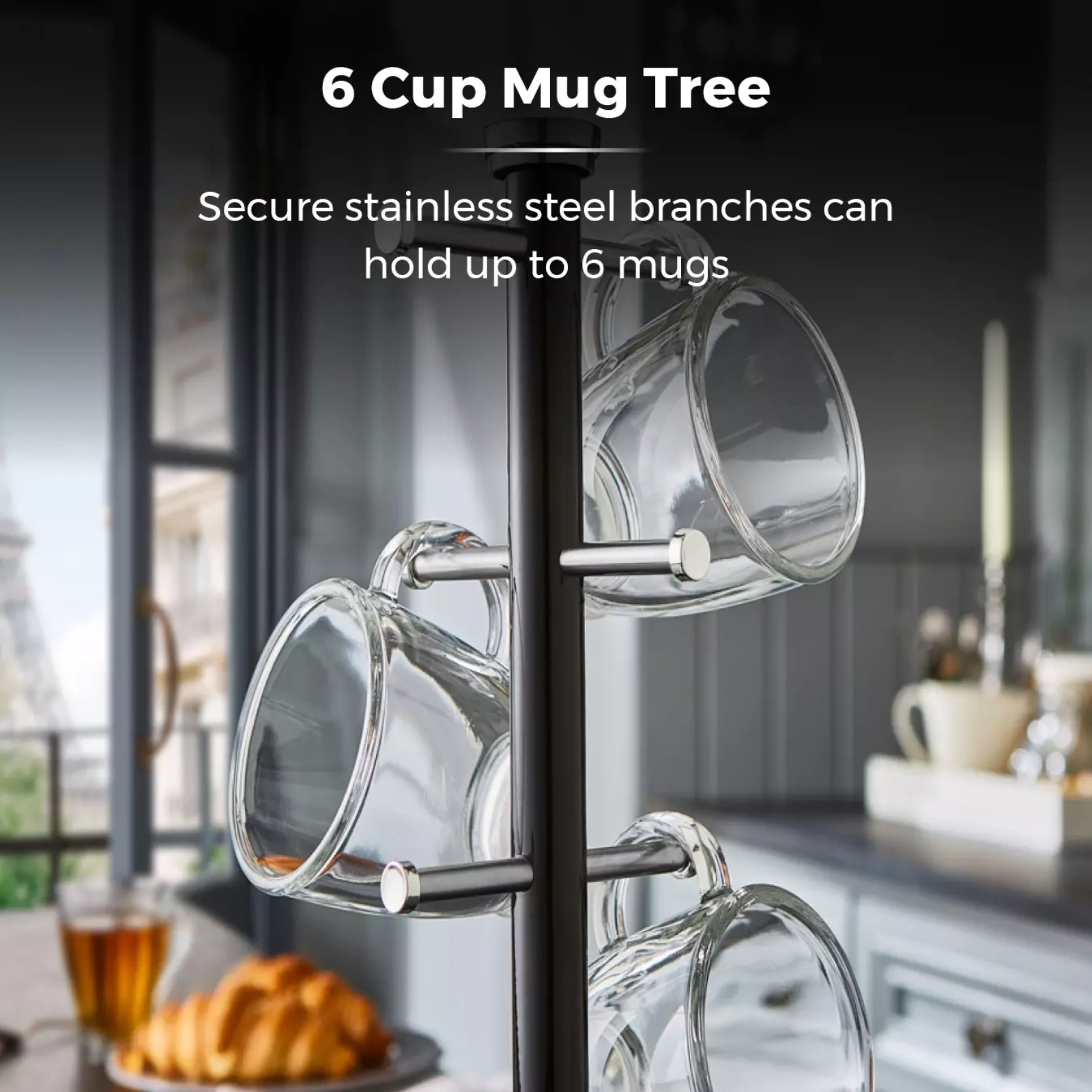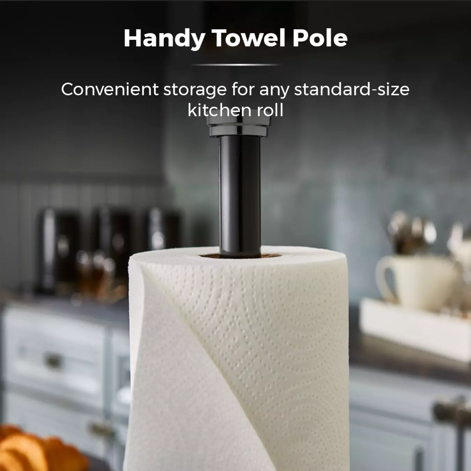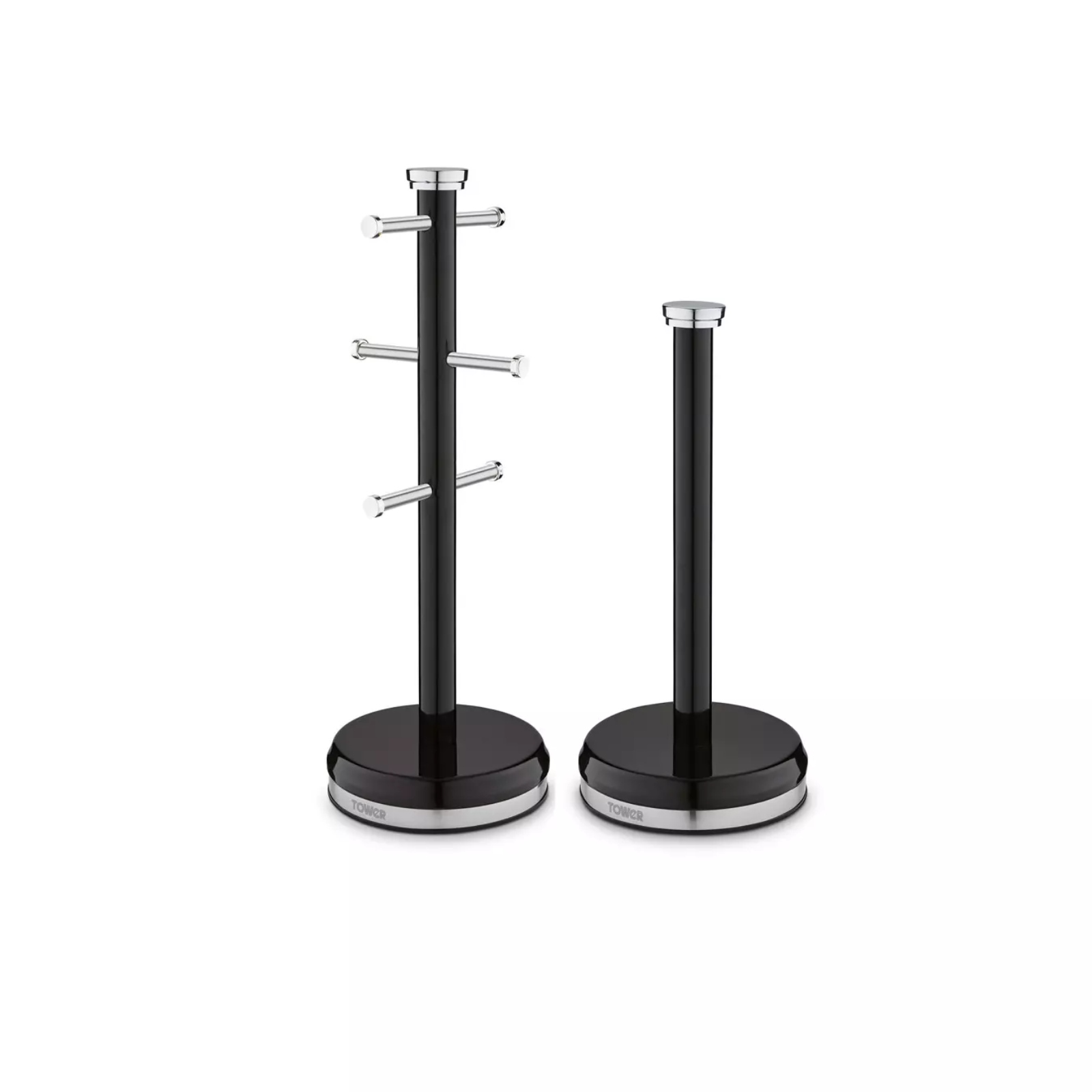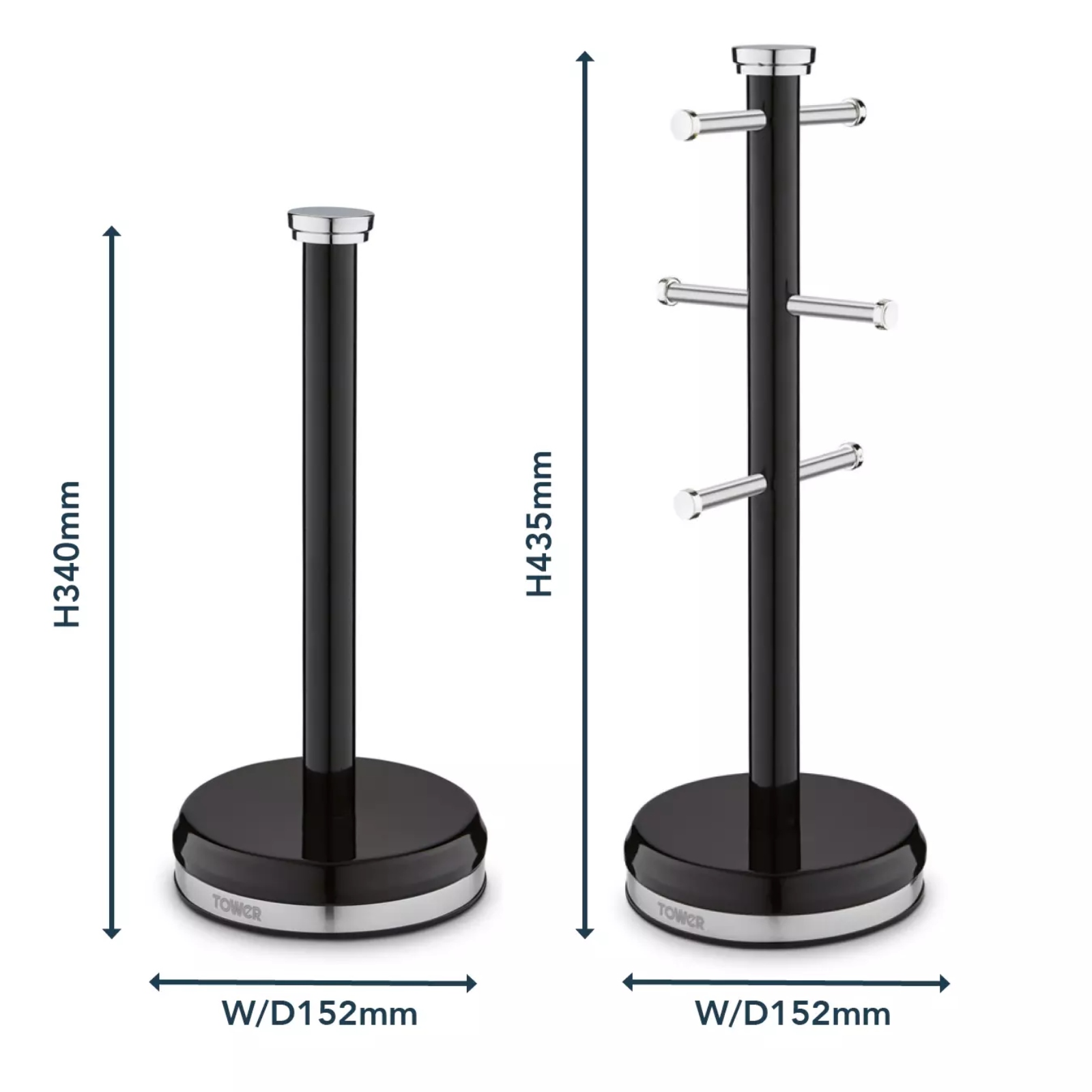 This Tower Belle mug tree and towel pole set provides an elegant storage solution for your cups and kitchen roll. The pair features a co-ordinating Parisian design with bold colourways and stylish chrome highlights to complement your existing kitchen décor. The mug tree’s strong stainless steel branches with stoppers at the end offer a secure hold for up to 6 cups at once, allowing you to present your favourite designs neatly beside your kettle. The towel pole is able to comfortably fit any standard-size kitchen roll, keeping your paper towels close-by ready for the next clean-up. A weighted base ensures each accessory stays firmly put on your countertop, while the attached anti-slip feet protect your surfaces against scratching. Built with a durable steel body and chrome effect base ring, both accessories provide a stylish long-lasting finish and can be easily wiped clean to maintain the elegant finish.