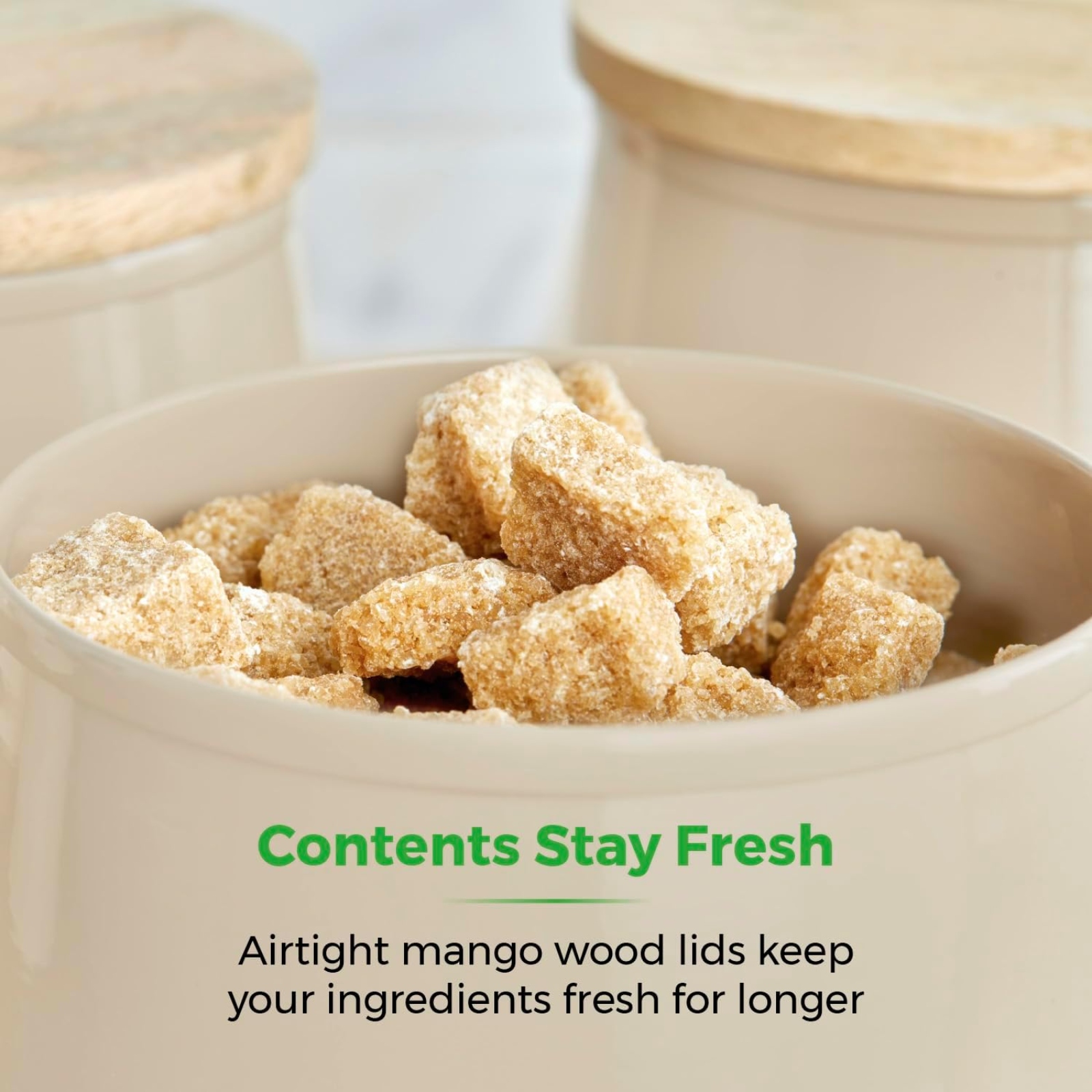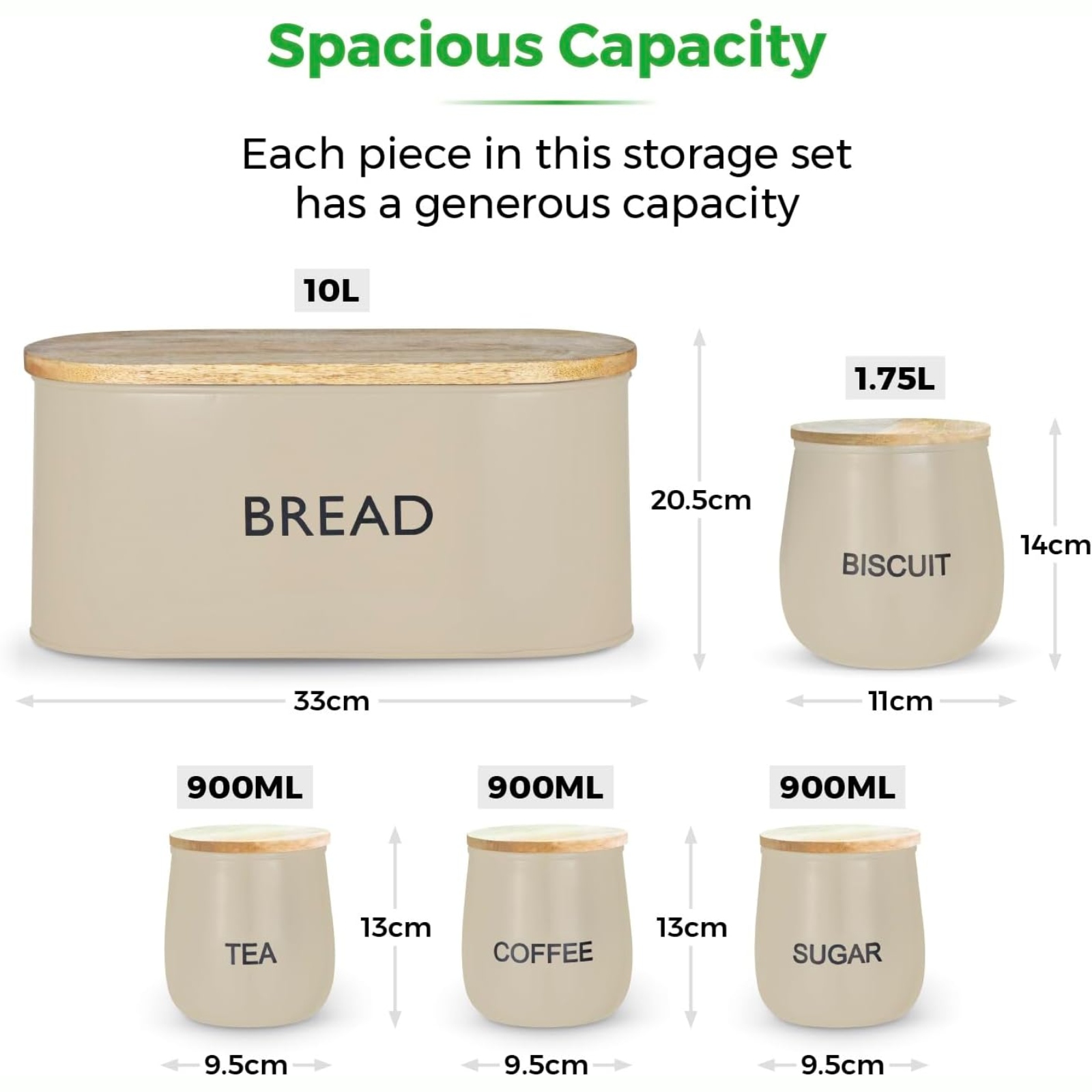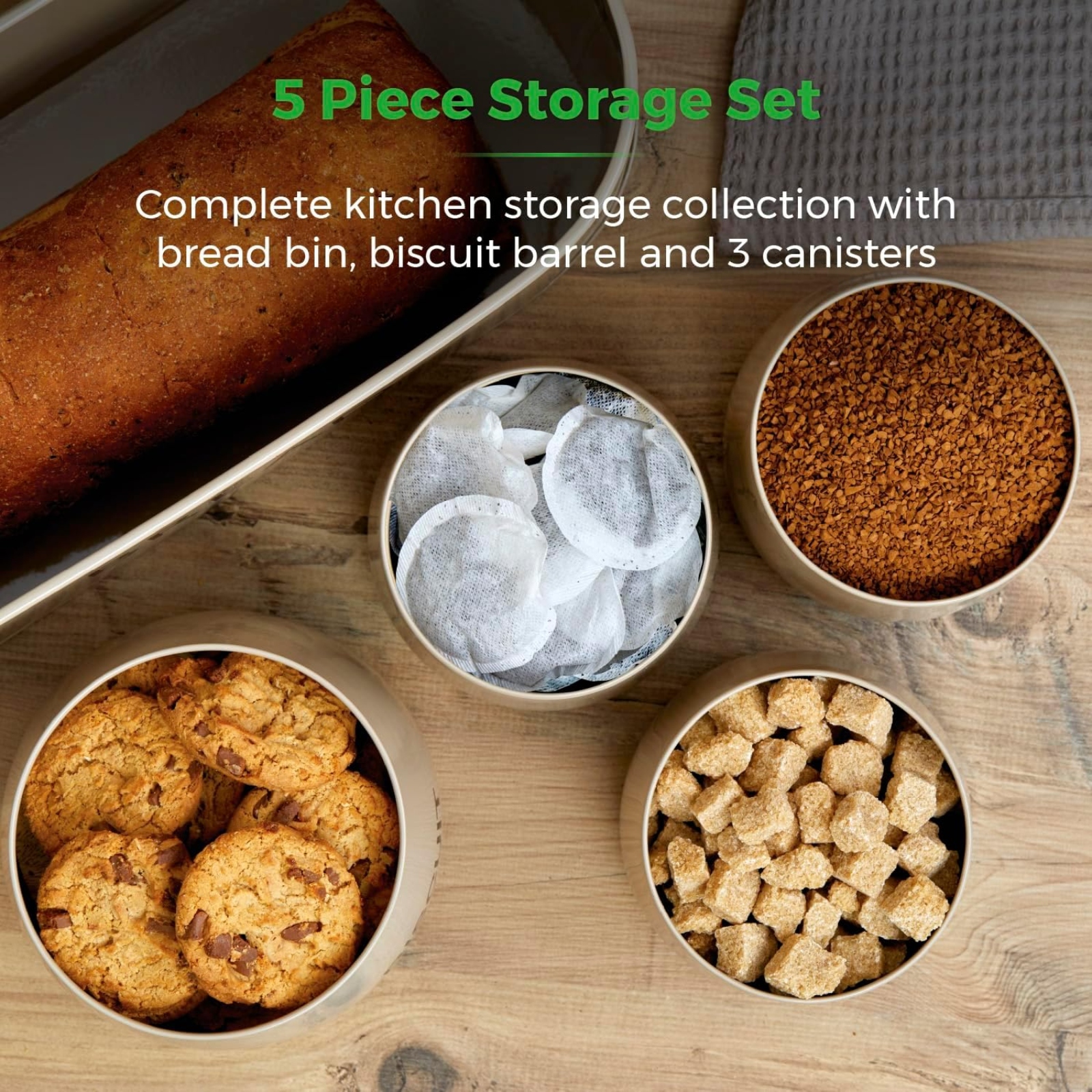 Accessorise your kitchen with the durable and decorative builds of the Tower 5-piece storage collection. Complete with a steel bodied bread bin, biscuit barrel and 3 piece canister set, you can keep all of your baked items and loose ingredients stored away with longer-lasting freshness. Each piece has a smooth latte finish to complement any kitchen décor. The mango wood lids are airtight so you can store your choice of tea, coffee and sugar and the flip top lid allows moisture to escape.