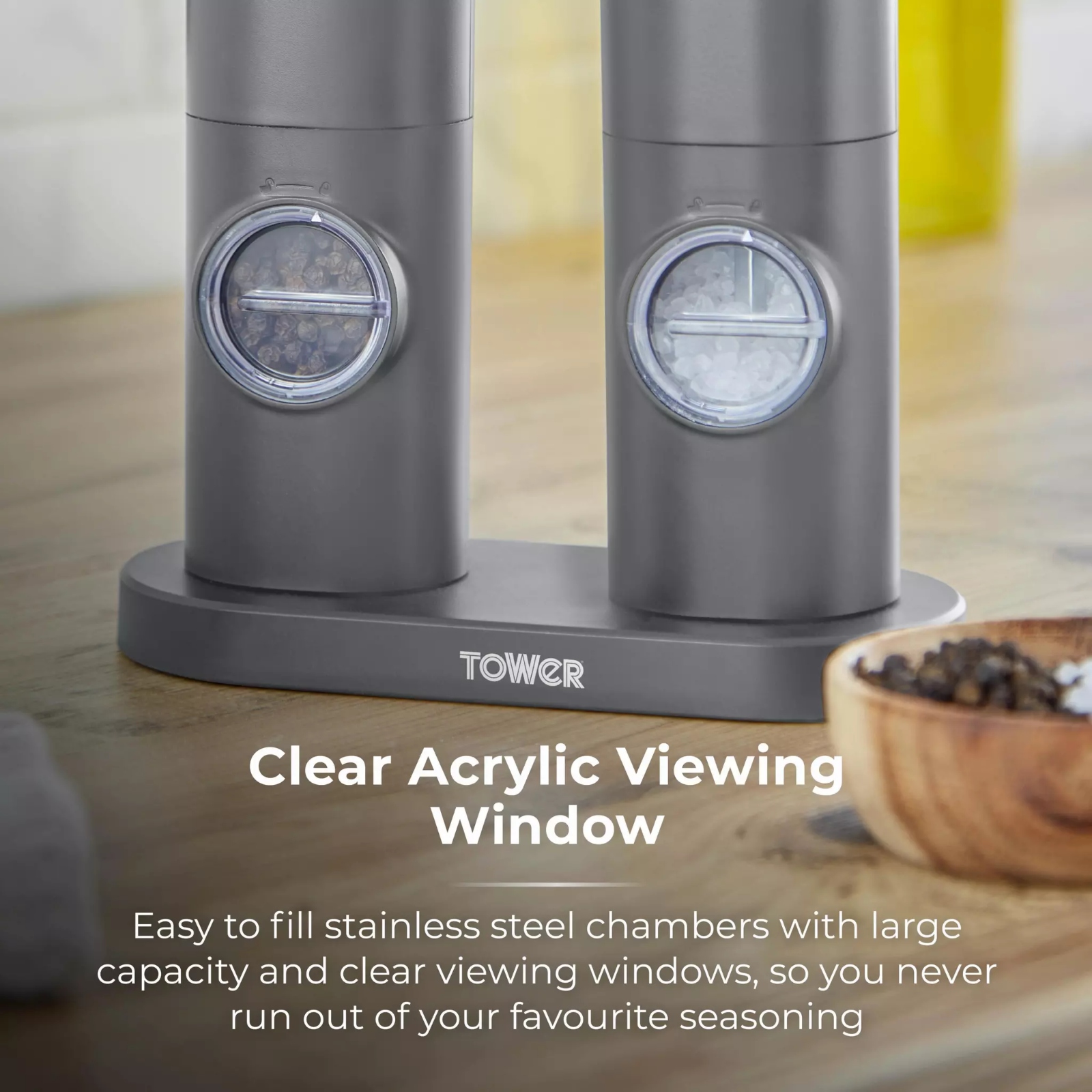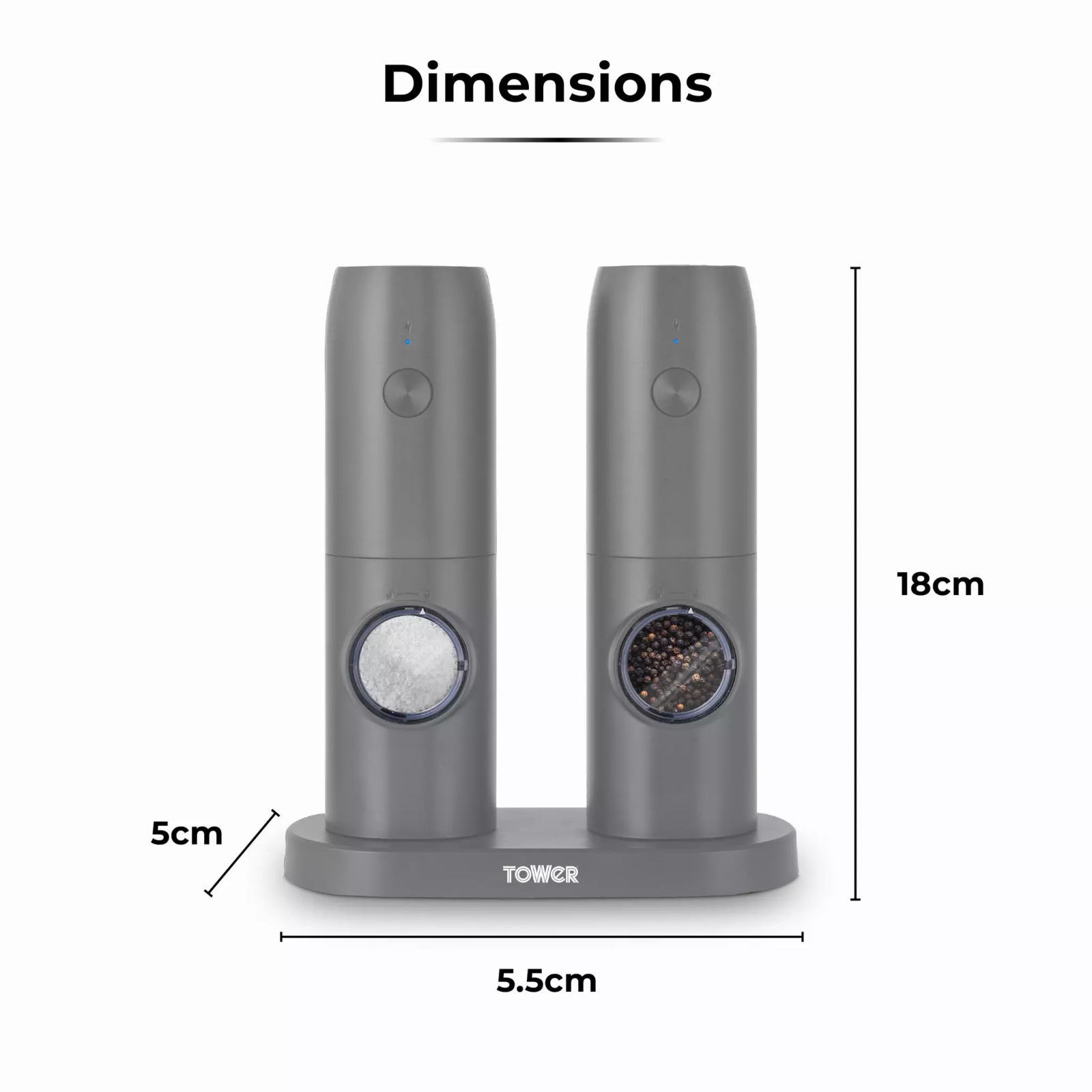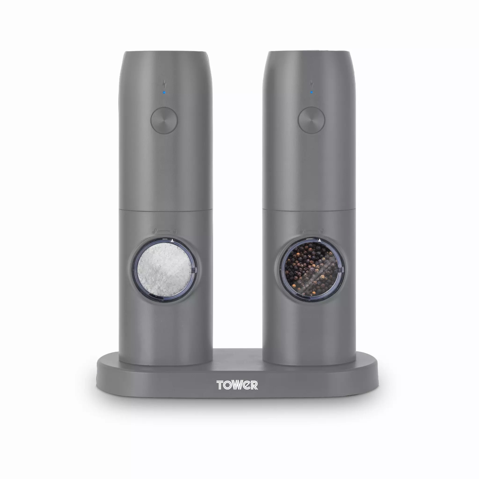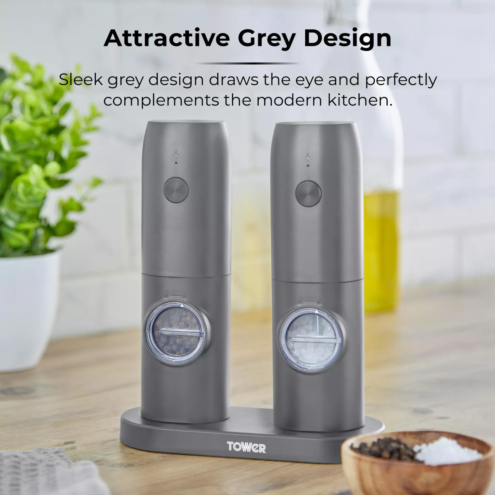 Tower’s electronic rechargeable salt and pepper set in grey is a must-have essential for your dinner table. The elegantly designed salt and pepper mill set includes a battery-operated mechanism that adds a touch of class to any evening meal. The salt and pepper mills are rechargeable so just plug in the charger, wait a few hours and you’re ready to go. Featuring an adjustable grinder function, you can choose whether to have fine or coarse salt and pepper seasoning suited to your taste. The stainless steel chambers in the main body offer viewing windows so you can keep an eye on the level of the contents for a top up and for added convenience. You only need to press a button for the mill to operate for effortless usage.