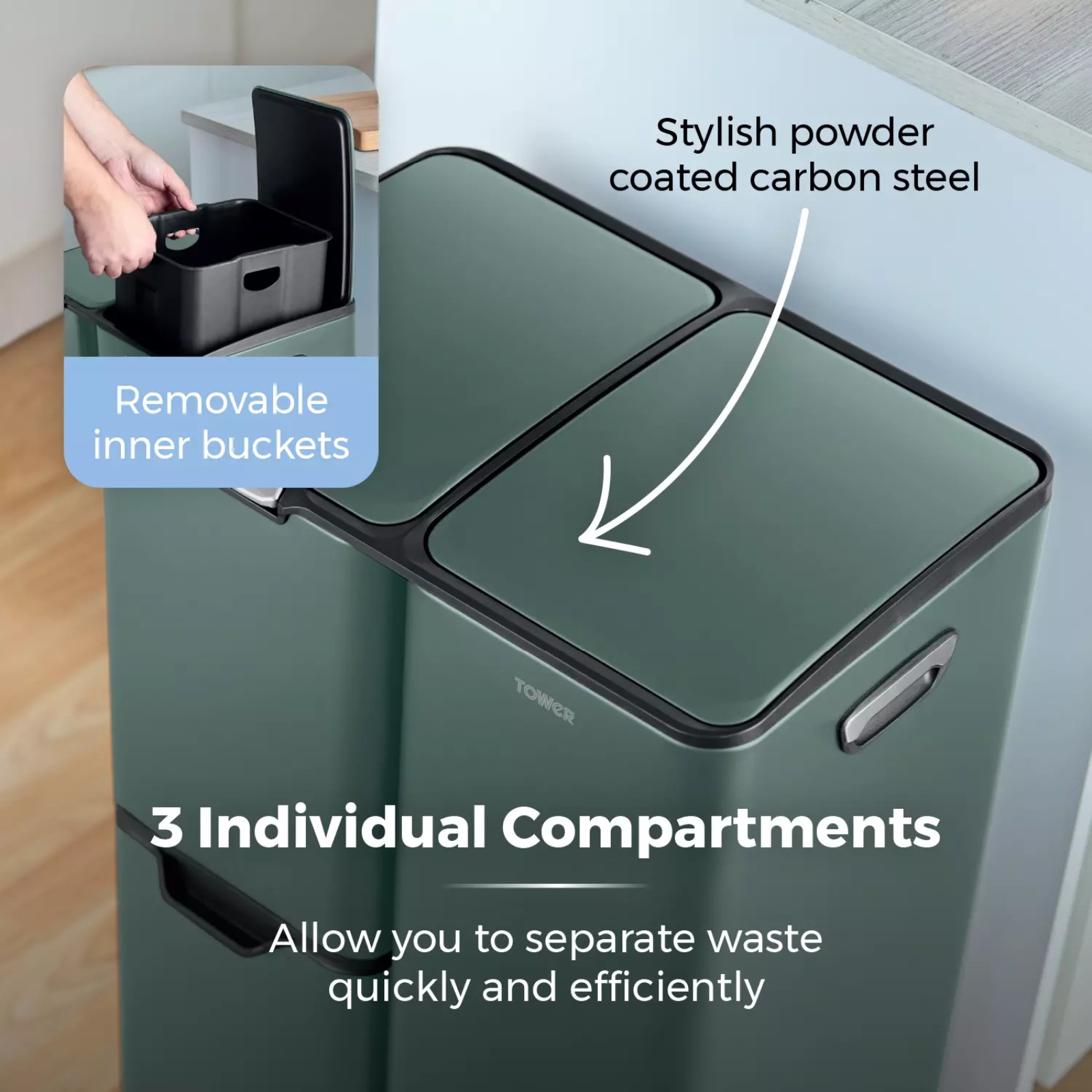 Hygienically dispose of your household waste with the 60L Pedal Recycling Bin from Tower. It features a pedal opening system to pop the lid open with ease, perfect for hygienic and hands-free opening. The spacious capacity is ideal for busy households and provides plenty of space to dispose of waste, ensuring you won’t have to constantly empty the bin. Expertly constructed from strong and durable carbon steel, the bin is robust in order to withstand the rigours of a busy household, whilst the carbon steel body has a sleek black powder coating that perfectly complements both modern and traditional décor individual compartments provide the capacity for easy waste disposal and the buckets are easily removable. The 13L compartment will open by pushing, whilst the 17L compartment has wheels on the underside and can be rolled out for convenience. A pedal operated 30L compartment offers complete versatility in waste disposal. A simple wipe clean is all that is needed to keep the bin looking its best, whilst the inner buckets can be easily removed for convenient cleaning.