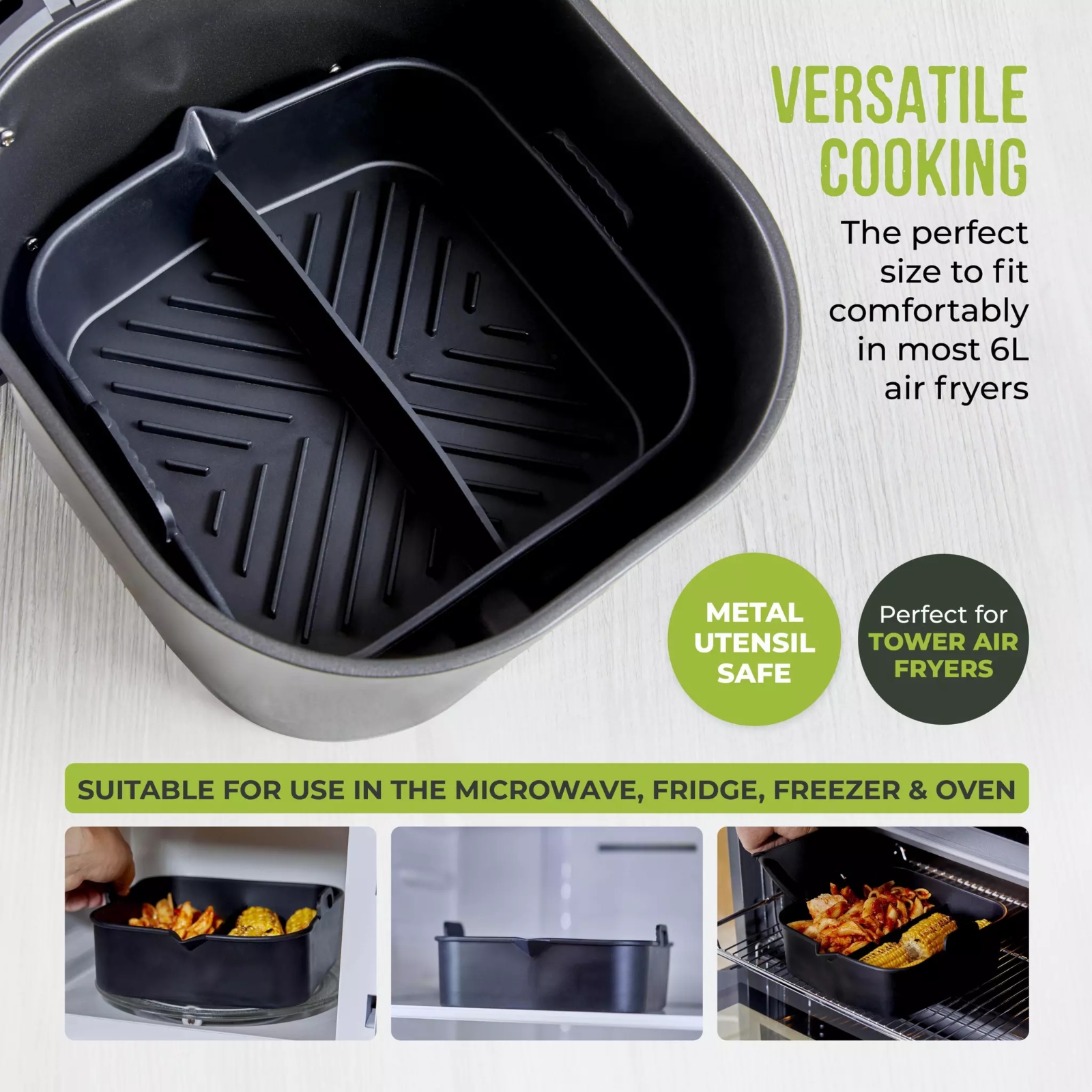 Cook up delicious pizzas, cakes, waffles and more using this Square Silicone Tray, suitable for all Tower Air Fryers. Crafted from superior non-stick silicone material for fuss-free cooking and cleaning, enjoy a delicious homemade Victoria Sponge, Spicy Pepperoni Pizza or sweet Cinnamon Waffle. The ribbed interior on the base of the tray collect fat and oil to provide better air circulation and allow food to be heated evenly. Safely lift the tray from basket to plate using the side handles, whilst the sturdy silicone tray stays in shape, ensuring none of the contents spill over whilst handling. The divider allows you to cook multiple food types at once so you can enjoy delicious crispy chips or moist chicken in no time. The re-usable tray is an eco-friendly alternative to single use parchment liners and is made from 100% food-safe silicone and are odourless and non-toxic. It has a LFGB certification and is guaranteed to be BPA free.